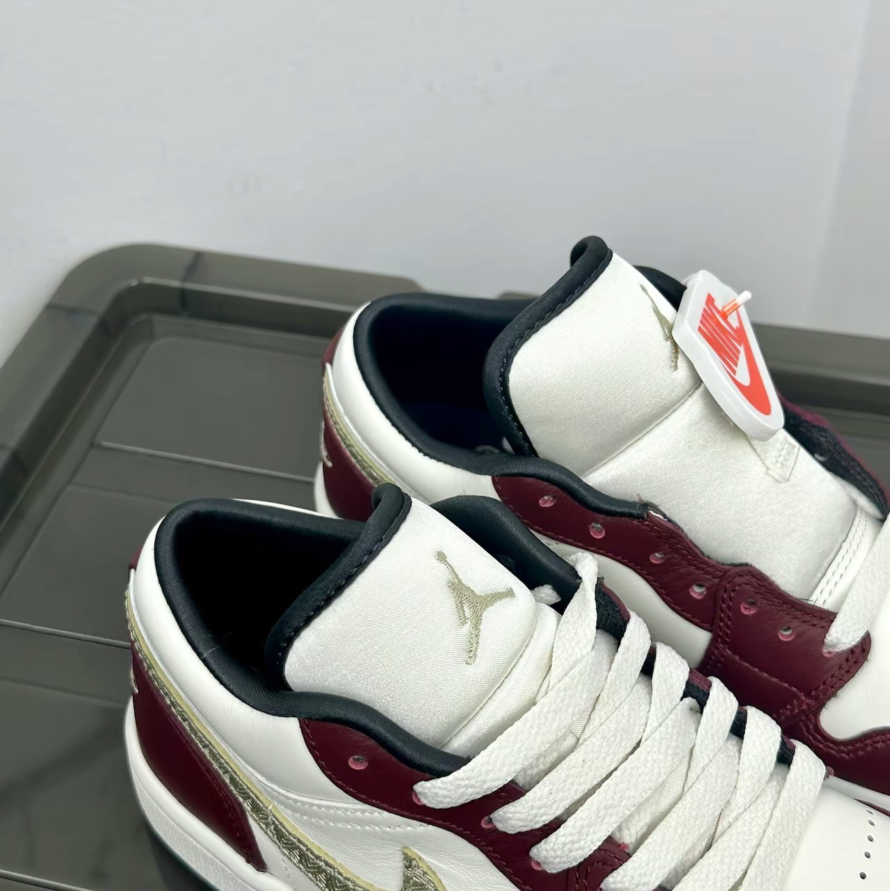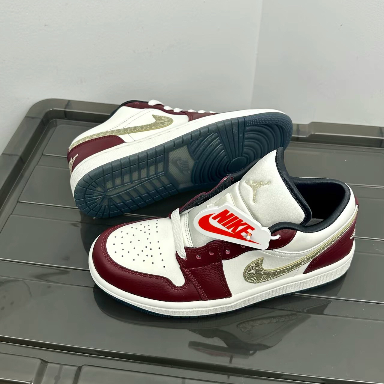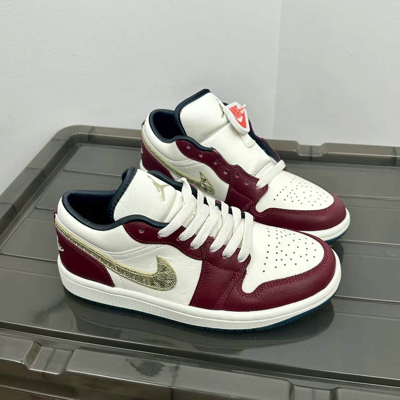 最近发售不久的龙年限定款鞋子以米白加酒红为主 就很高级的感觉~还有金色logo点缀 更加增添富贵和限定的质感!
