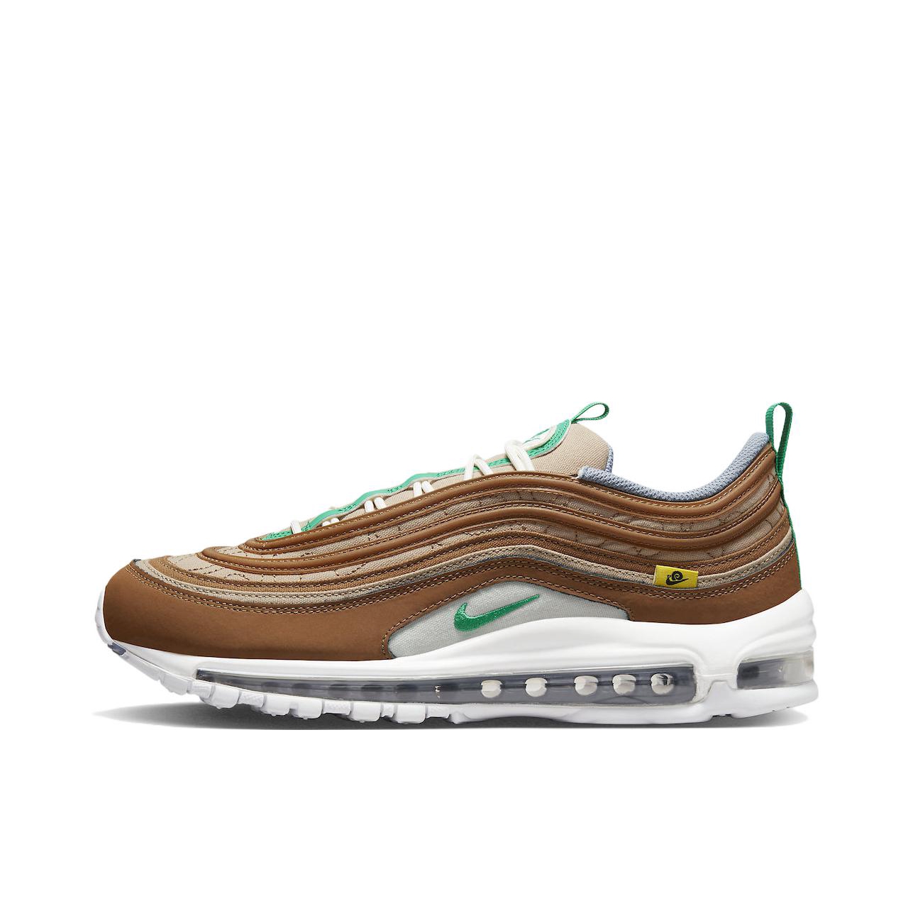 Jike Air Max 97 SE耐磨低帮跑步鞋,棕色采用织物材质、麻黄色装饰和蜗牛爬痕状缝线设计,鞋底搭载可视MaxAir缓震配置有明显的增高效果,助力打造个性造型