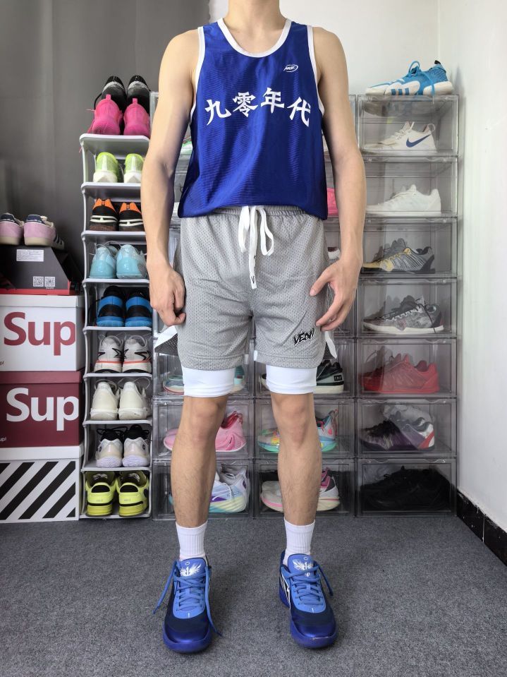 运动裤当然要选一条兼具多方面的,这条维动VEIDOORN 的快攻短裤是自带紧身裤的,方便了我出门打球的搭配! 内衬的紧身裤对腿部的压缩刚刚好,不会很勒,起到了集中肌肉的作用;灰白的搭配也较好搭配衣服,即使是一件深蓝的背心! 本人 173cm 65kg 选L码,裤子版型较好,款式不过膝盖,紧身裤也刚好在膝盖上方!