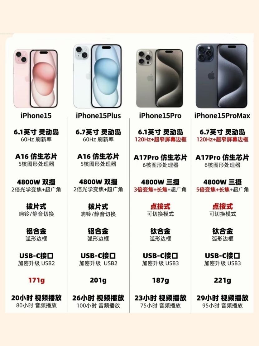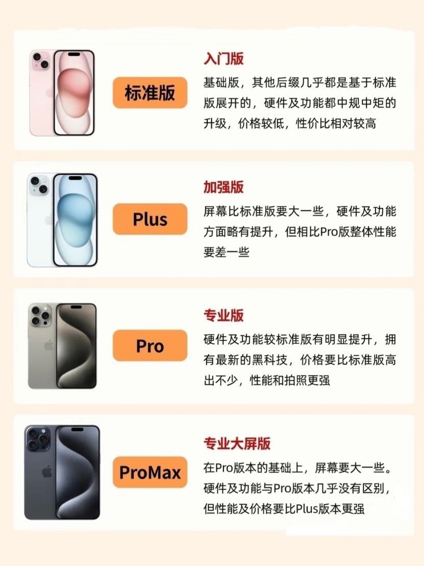 很多宝子对于苹果手机的各个版本型号都闹不太清,什么Pro、plus、max等后缀更是看的眼花缭乱。今天给大家简单讲解一下,以免花了大几千买到不适合的手机。 先看大小 尺寸设计这一块,苹果手机一直是双产品战略,6.1英寸的苹果15和15Pro重量不超过200g,适合单手握持;6.7英寸的苹果15Plus和15Promax则都超过了220g的机身重量,但是续航更持久。 如果你只想体验苹果新款手机,...