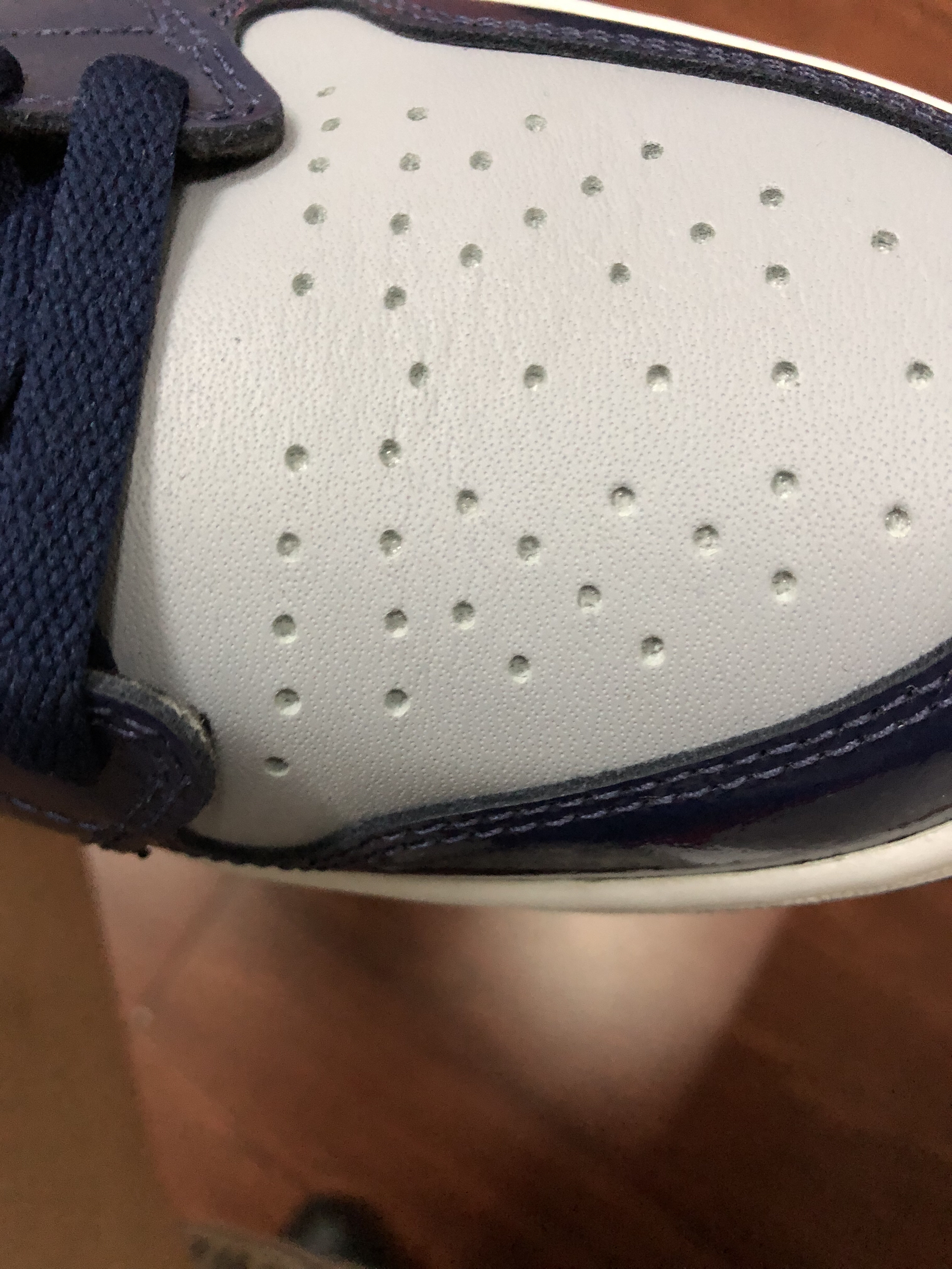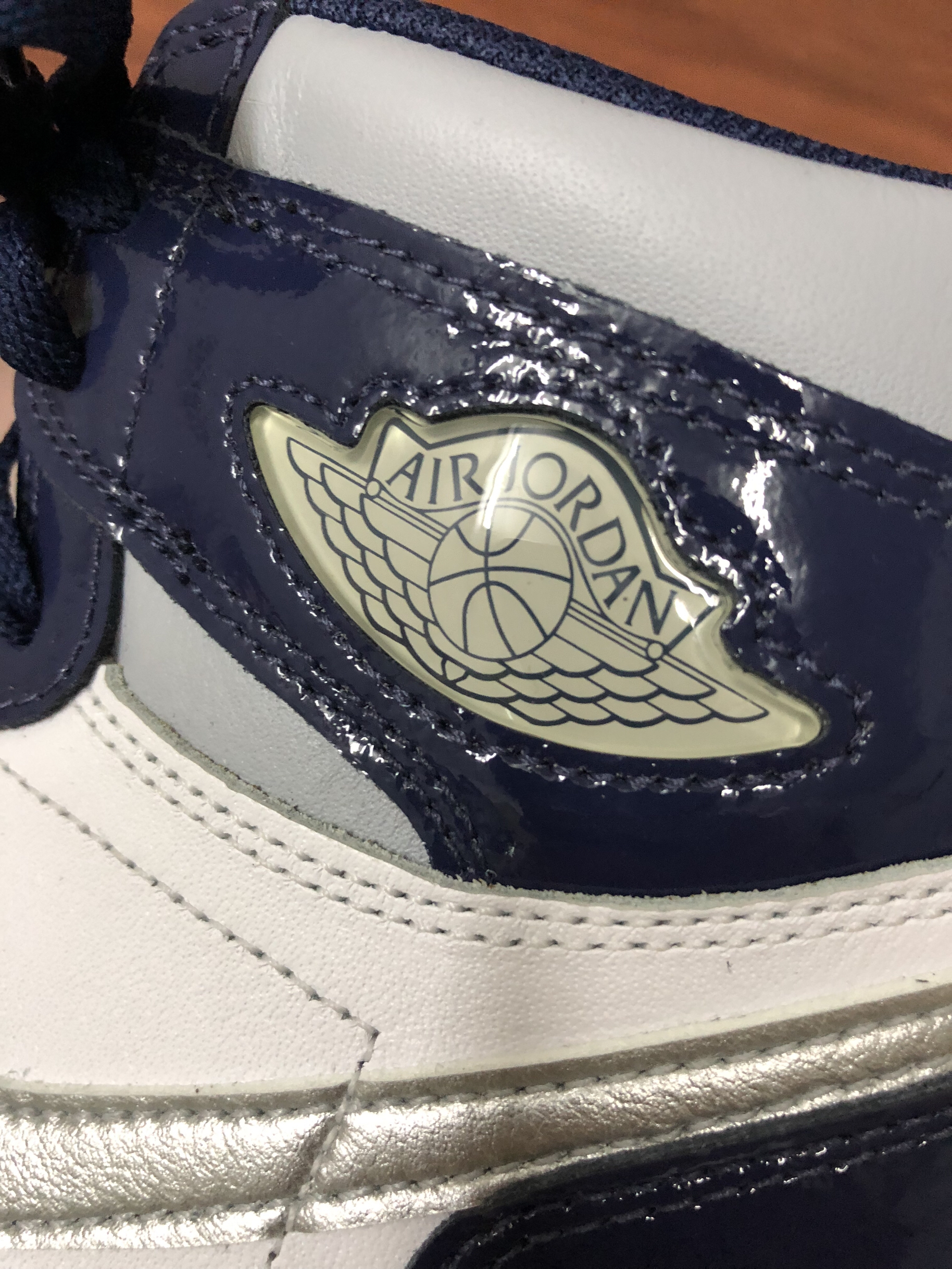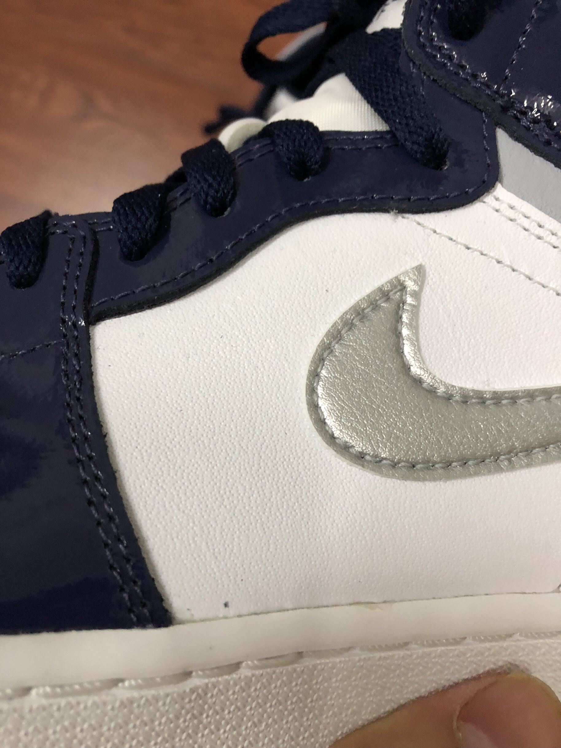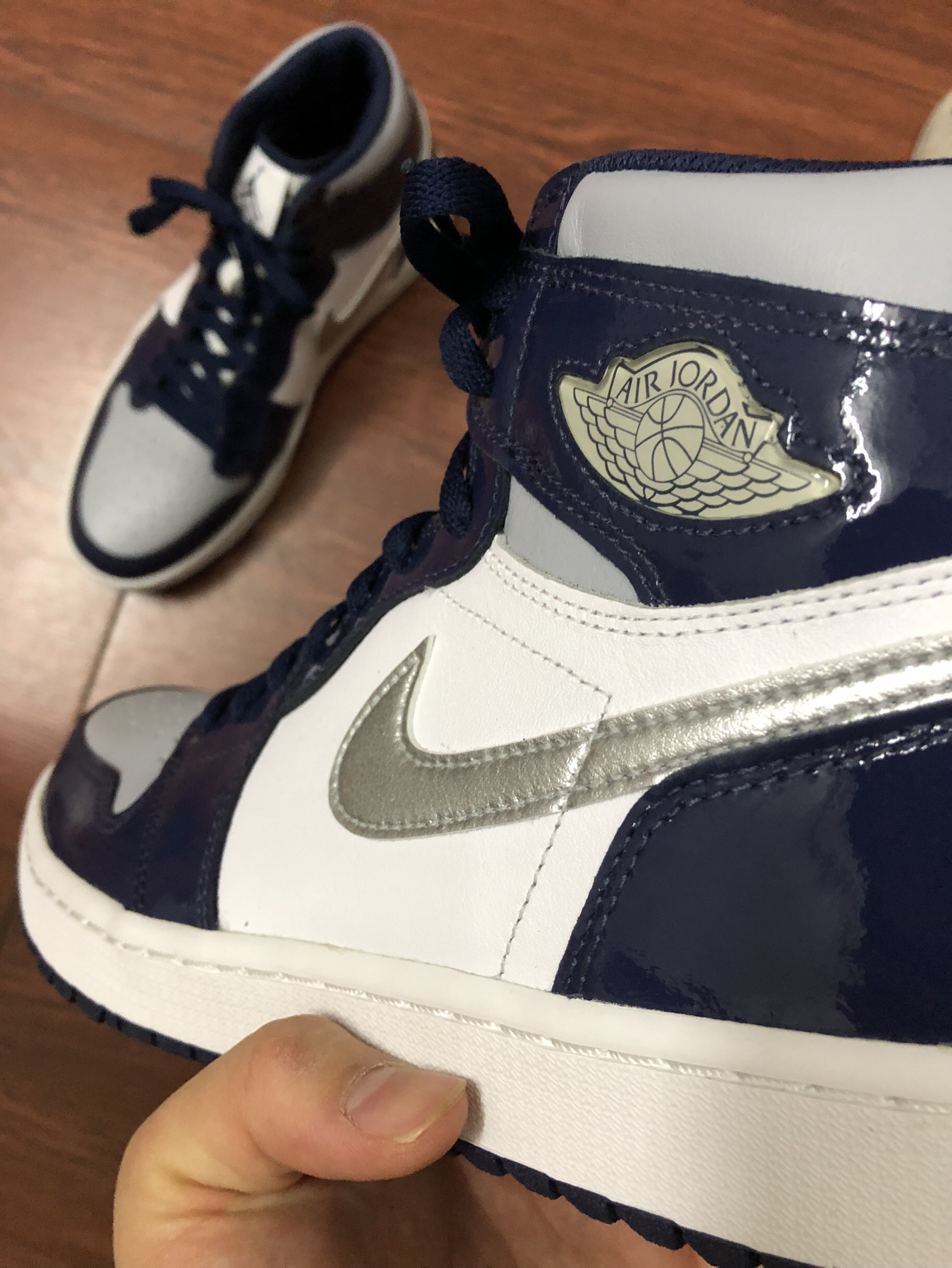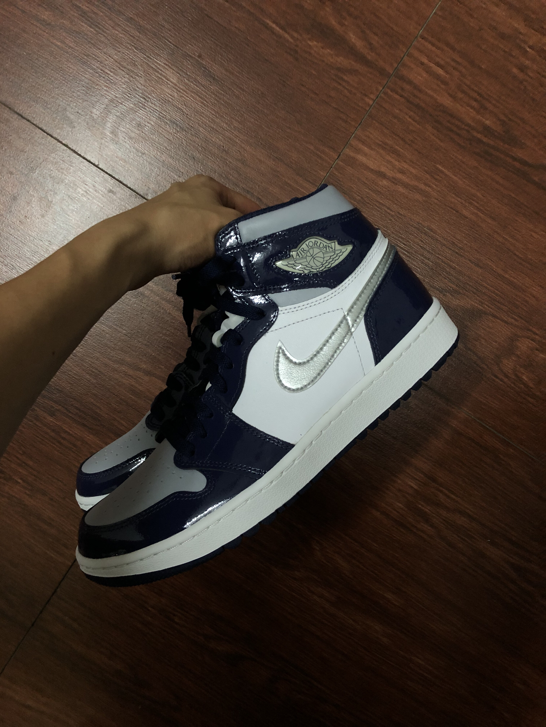 新到的aj1今天来个开箱 鞋面:是漆皮 有点亮眼 现实中看起来很高级 配色:可以说是日本午夜蓝的平替了 价格:来到了6开 也是一双自穿好鞋 鞋型:是高尔夫的鞋型 鞋底会高一点 显得比较均匀👟球鞋名称:aj1午夜蓝