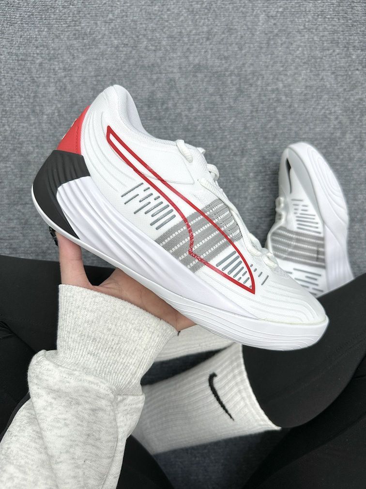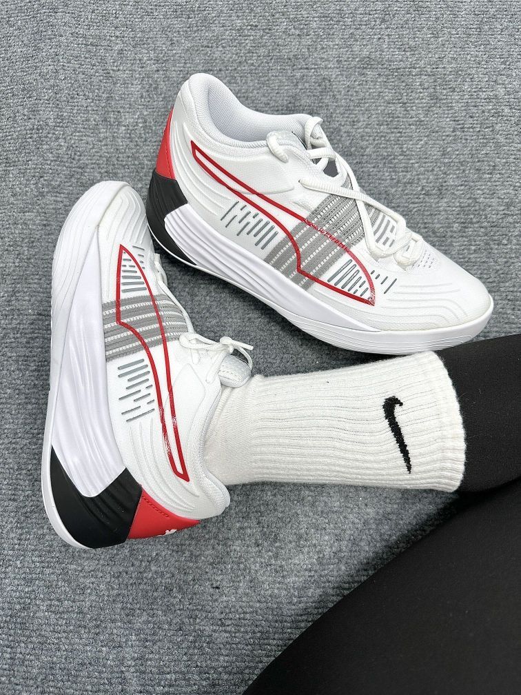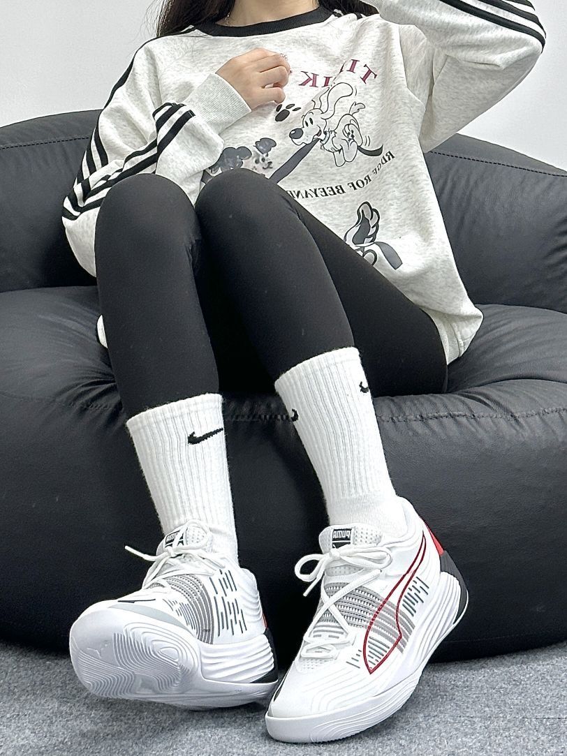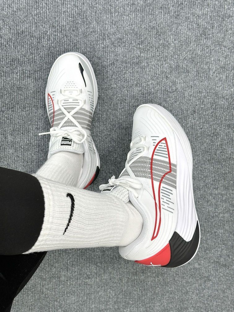 ⭐hello 这里是草莓圆圆酱 今天给大家分享的是男女生都能驾驭的篮球鞋 就是这双来自彪马的Fusion Nitro啦 白黑红配色 整体颜值还是蛮高滴 鞋面是织物和热塑材质 透气性还不错 鞋身的流线感十足 真的好喜欢呀 橡胶外底 有很好的抓地性 不容易打滑 鞋后跟彪马的logo点缀 简直不要太酷啦 建议买大一码 穿着更舒服一些哦