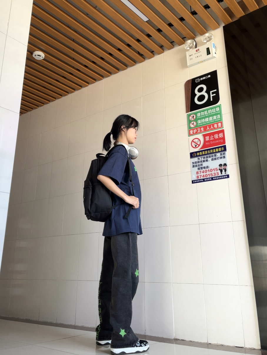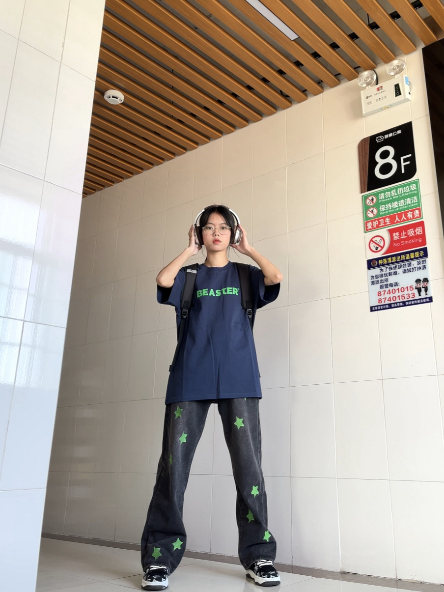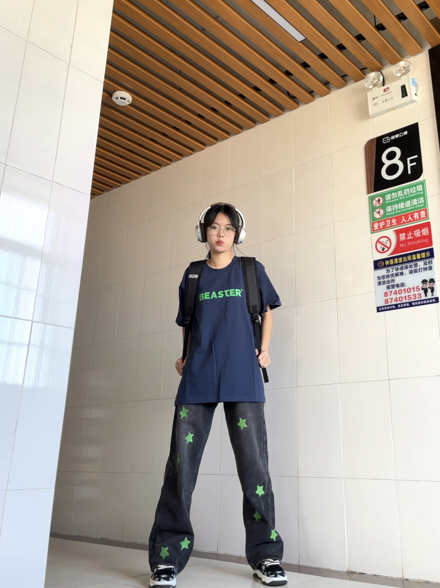 今天这套穿搭想打10分! 深色系穿搭看起来好出片呀 👕绿色字母一点也不突兀,反而增加了几分设计感 还和裤子上的绿色星星搭配上了 👖黑色百搭直筒裤,颜值很高 背面的字母刺绣有点小心机~