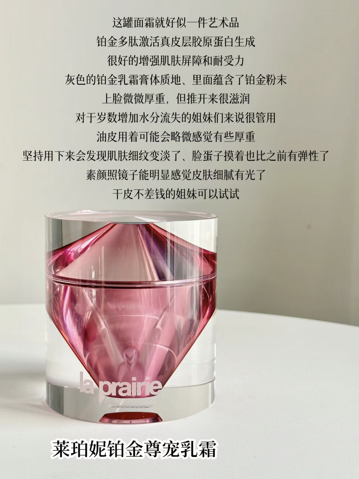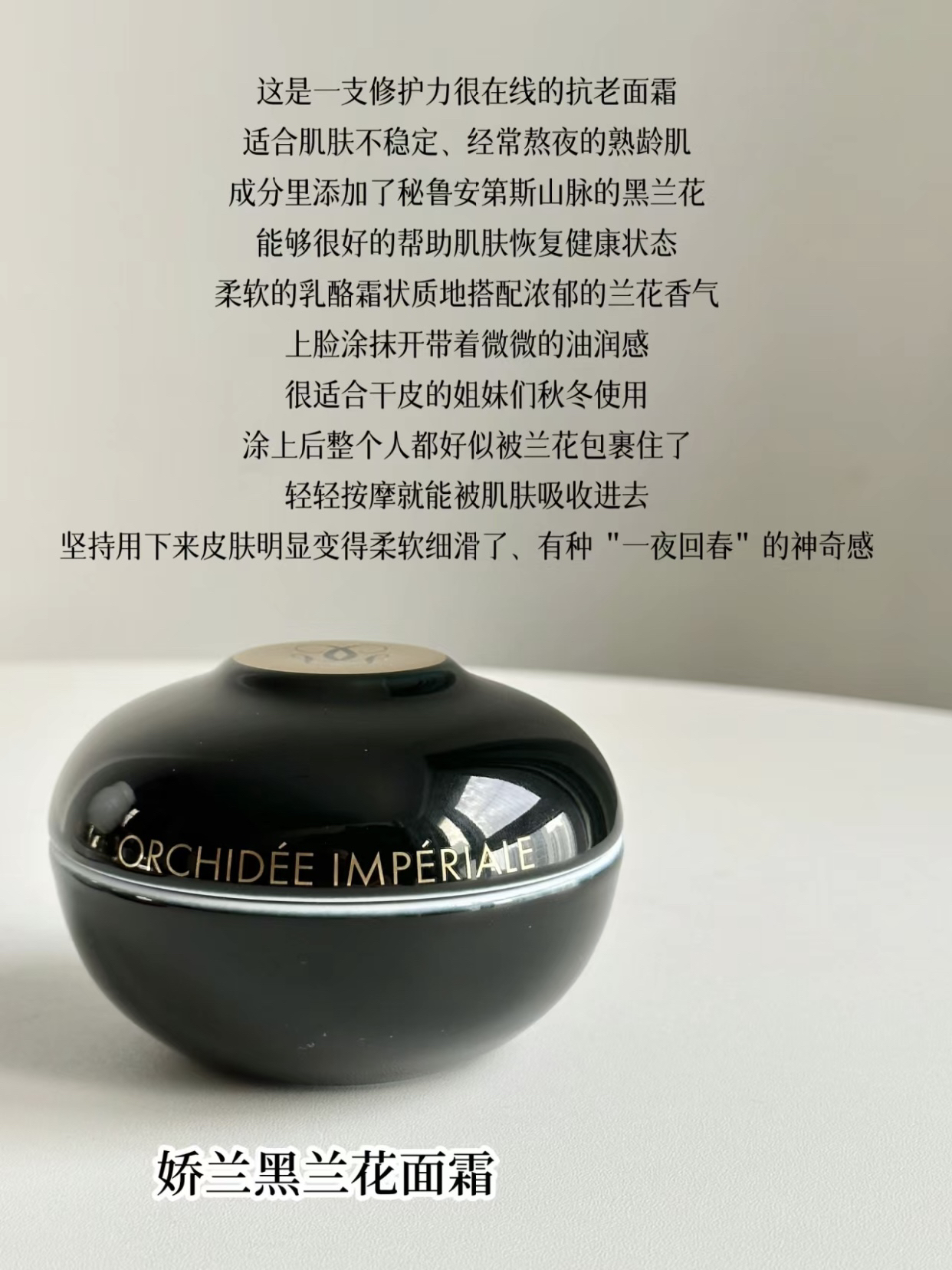本篇笔记关联了娇兰 御廷兰花臻兰黑金瓷罐版贵妇黑兰面霜 50ml、La Prairie/莱珀妮 臻爱铂金乳霜 红瓶50ml、Chanel/香奈儿 奢华精质乳霜 正装等商品,为用户提供真实的使用体验和购买参考。