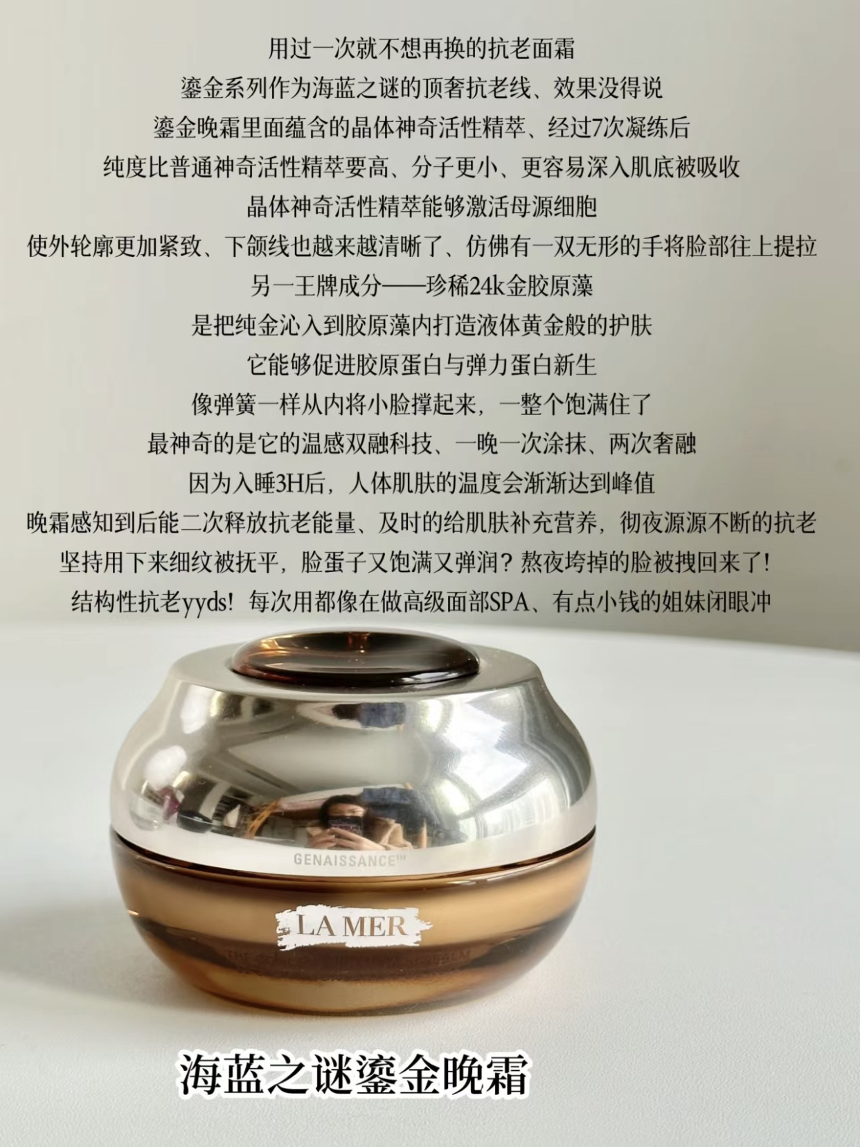 这应该是下血本的一期贵妇抗老面霜测评这些年用过很多所谓的平替,但效果微乎其微 兜兜转转发现还是大牌研发的产品高效且有保障根据不同肤质给大家总结了四款不错的贵妇级抗老面 霜 有点小钱的姐妹可以停留下~ -海蓝之谜鎏金面霜 鎏金系列作为海蓝之谜的顶奢抗老线、效果没得说。 鎏金晚霜内含两大王牌抗老成分 经过7次凝练的晶体神奇活性精萃:帮助提拉紧致外 轮廓 24k金胶原藻:帮助充盈饱满内部结构独特温感双融...