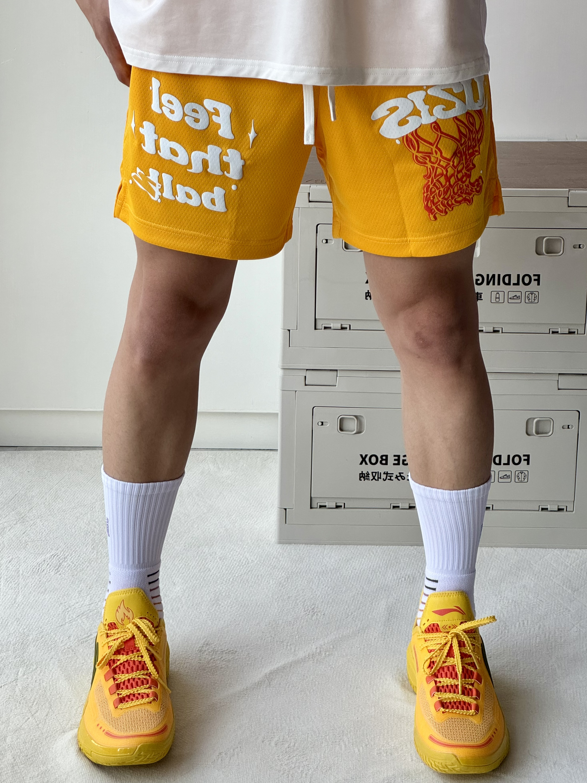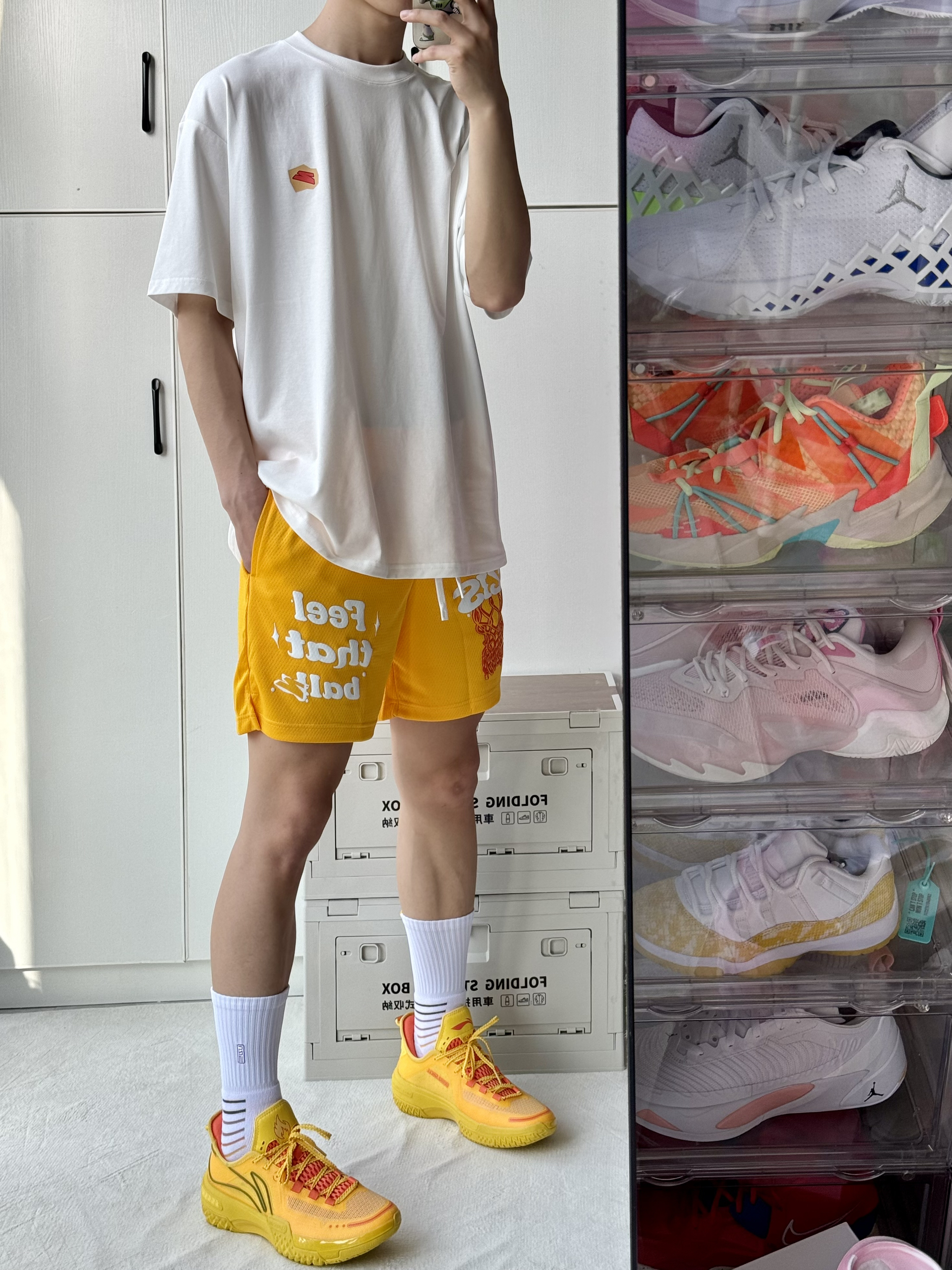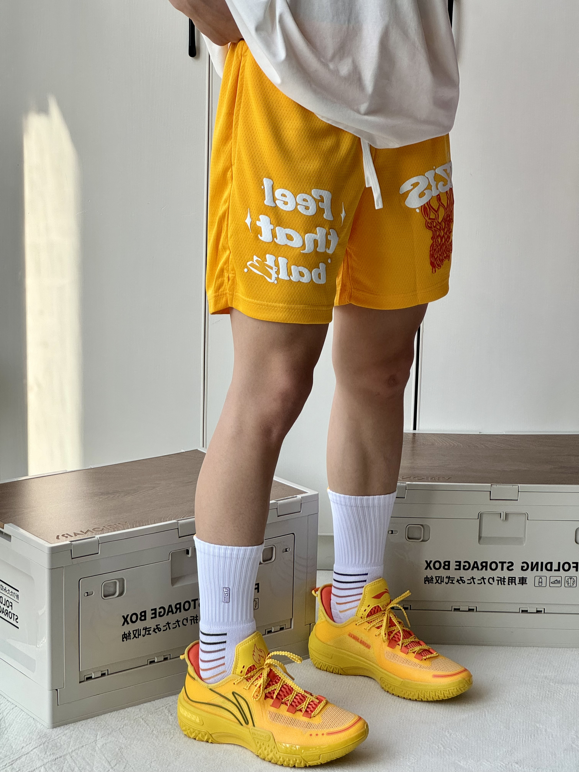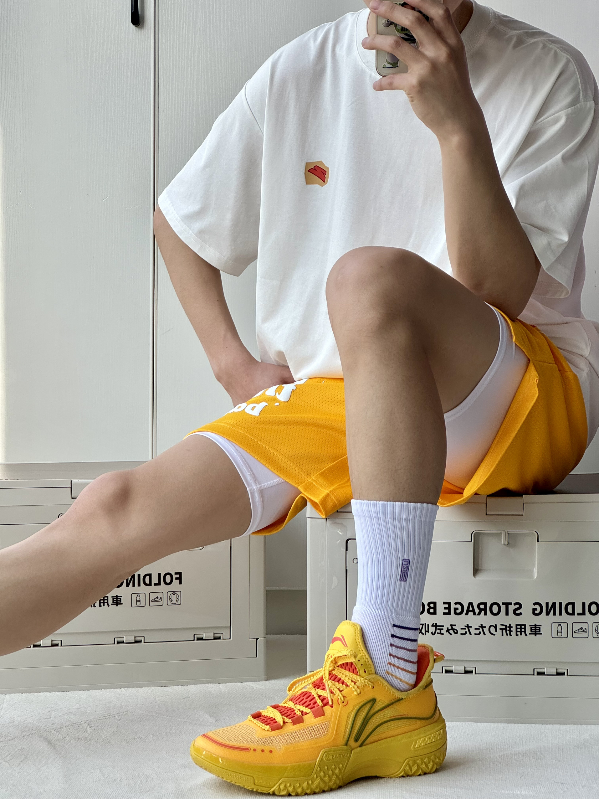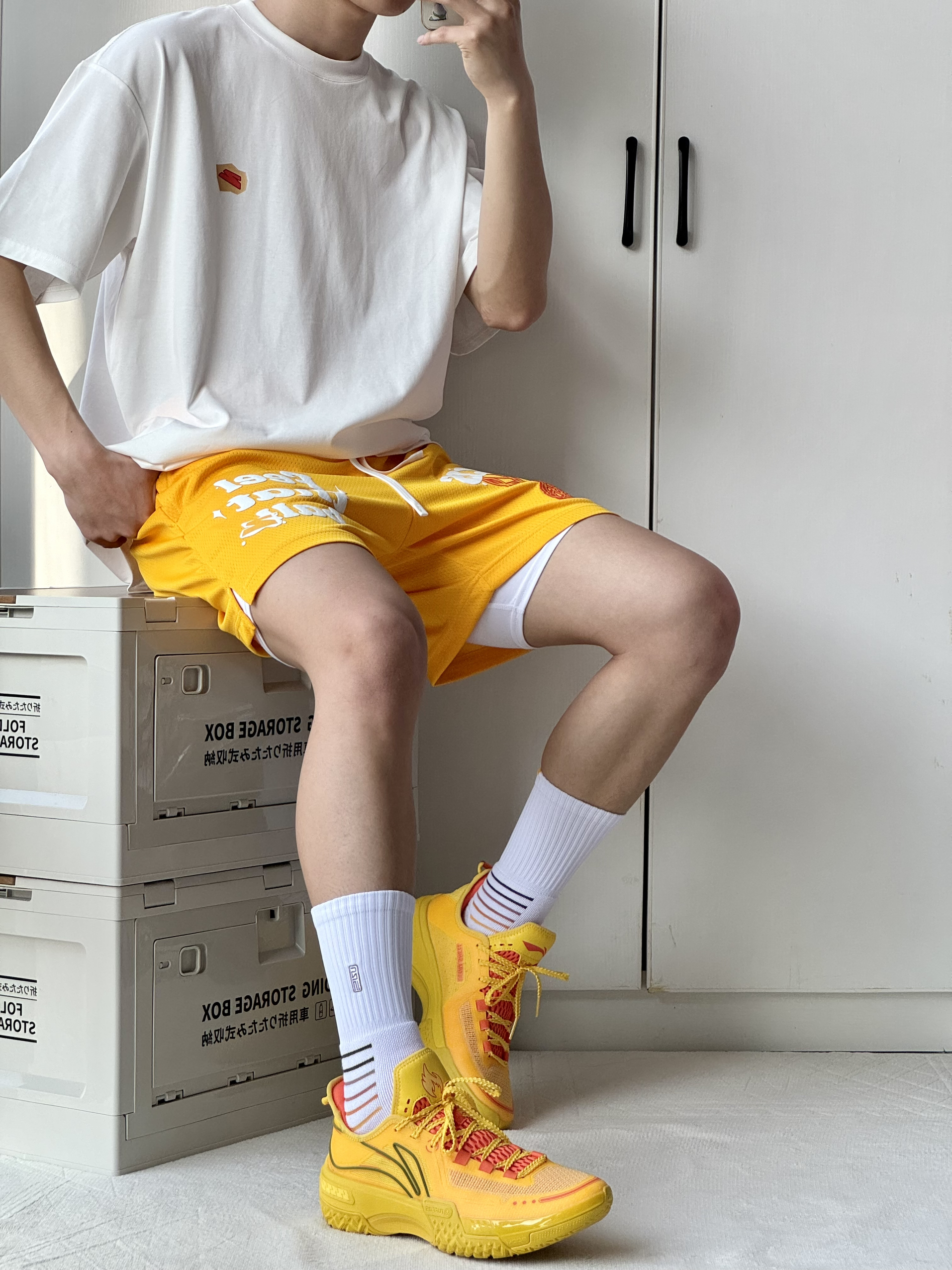 oi又是穿上喜欢的球鞋的一天 简单分享 一下穿搭 黄色这样搭配简直不要太帅🔆 👔 搭配一件简约的白色短袖胸口小印花 简单好看日常搭配不会出问题! 🩳 一条有志者UZIS过网系列美式短裤我 选的黄色非常吸睛充满活力的颜色上身颜 值很高 👟上脚桀骜纯黄色低帮外观造型让我挺 喜欢的低帮颜值更帅了还听说很耐磨所以 很想试试!