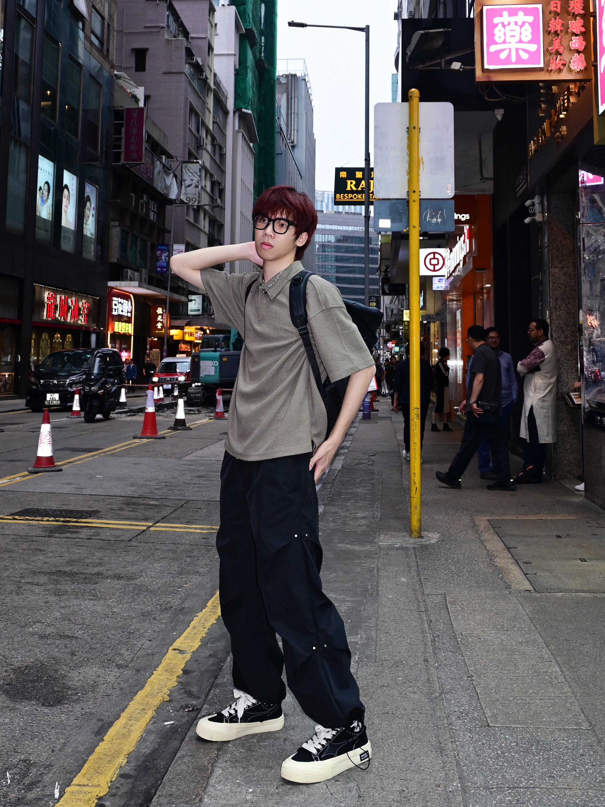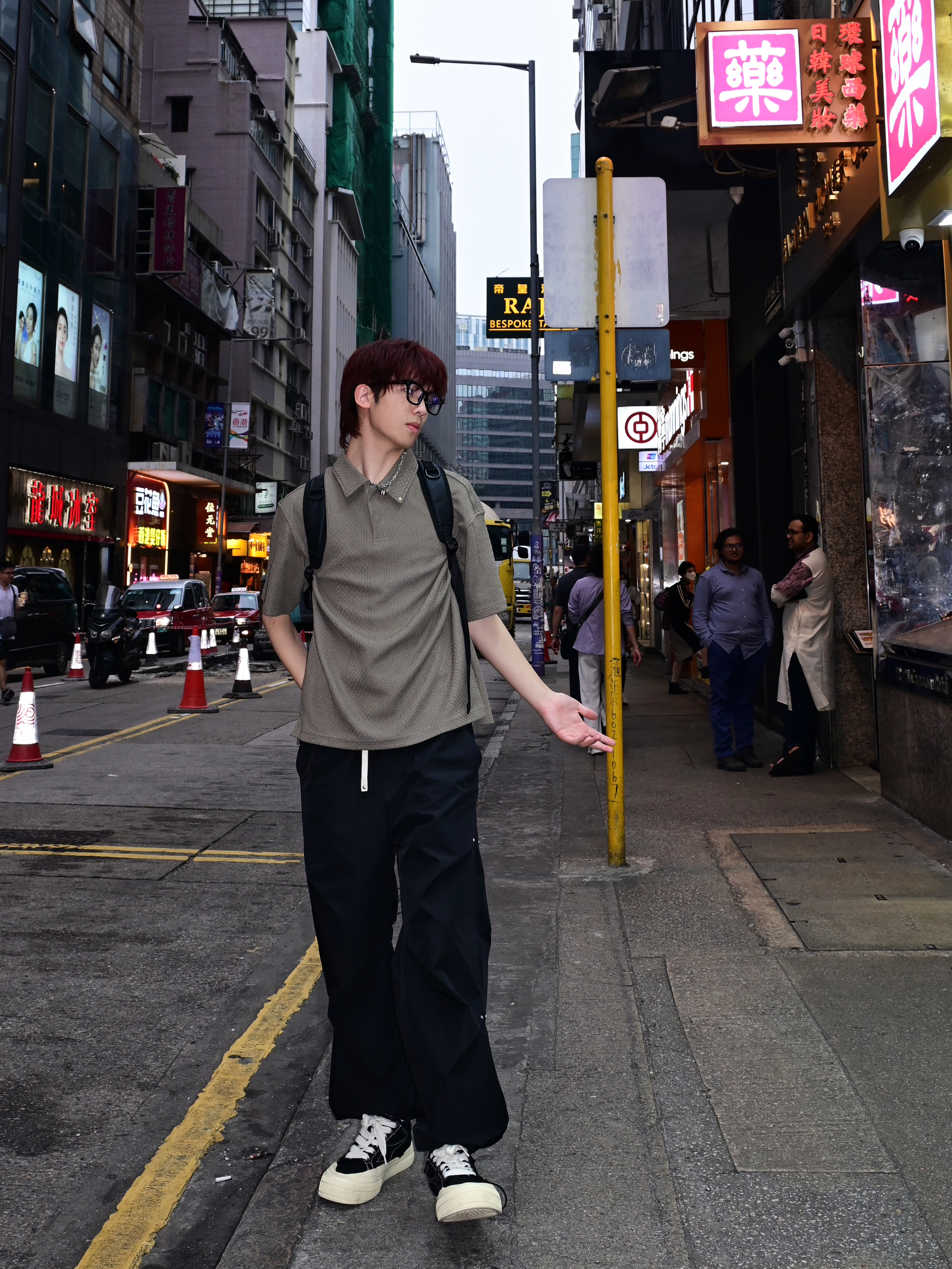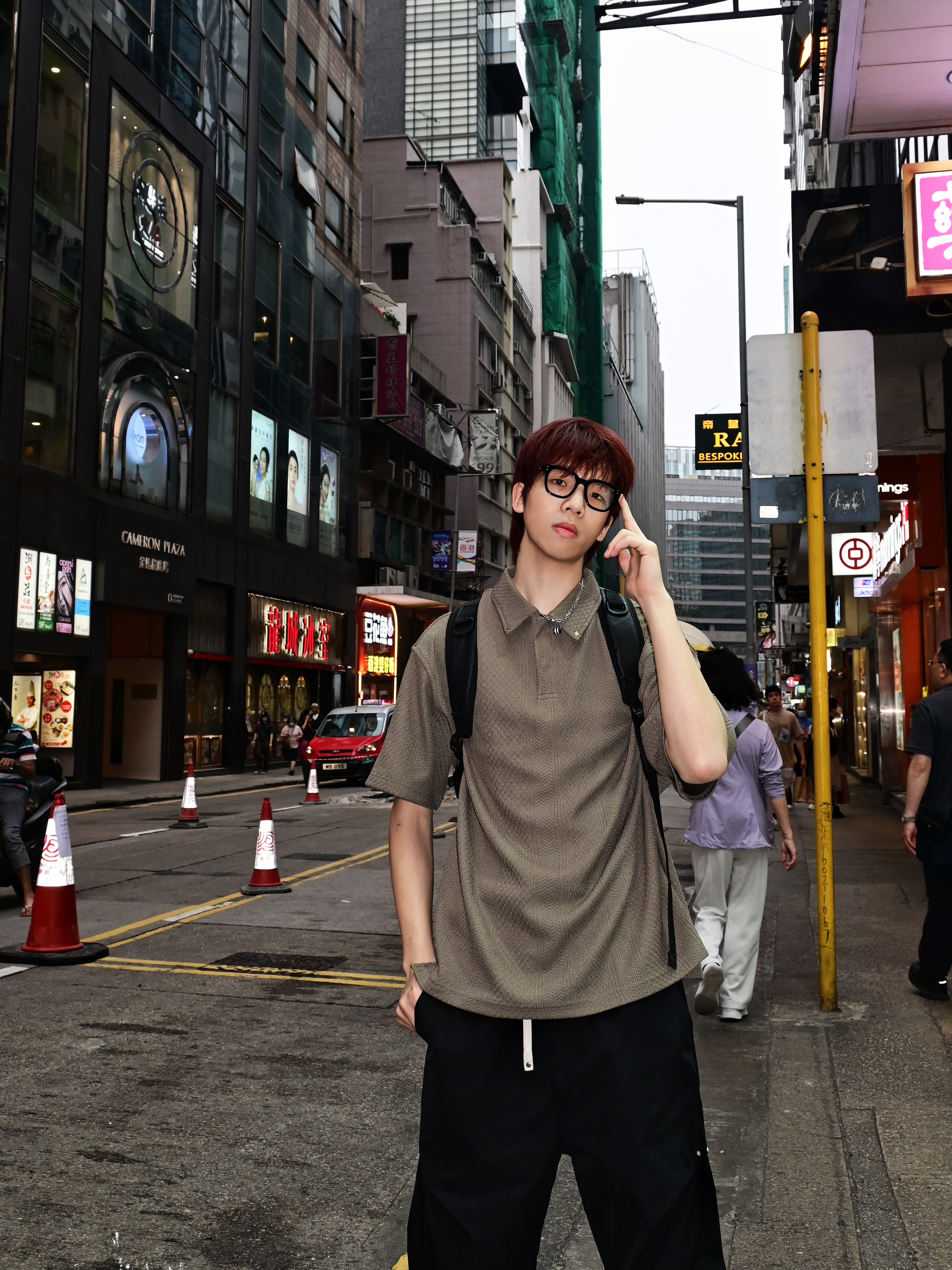 在香港街头提前入夏了~ 今天上身 CHINISM 棕褐色的polo衫👕 搭配黑色的单层褶皱裤 在香港🇭🇰27度的天气穿太适合了! 提前感受一波夏天 上衣的实物质感超强 针织🧶的T恤表面是有肌理感的哦~ 推荐188 67 xl合身 还搭配了 WASSUPHLOVE 的厚底帆布鞋 和 AKAK 的项链作为配饰啦~ 鞋子的话真的很推荐! 就是某多多买七八十就能拿下,上脚超帅 项链的话是那种叠...