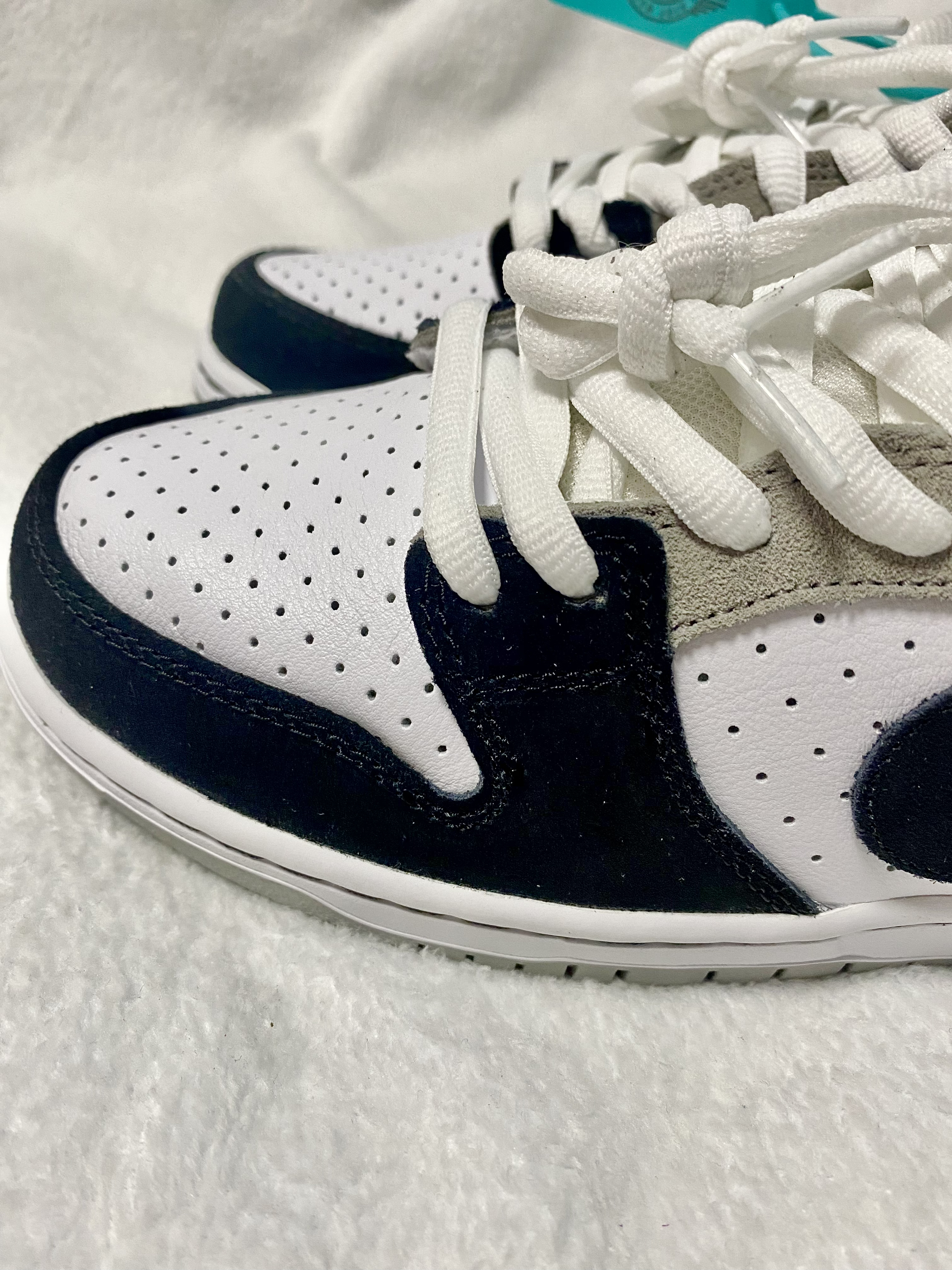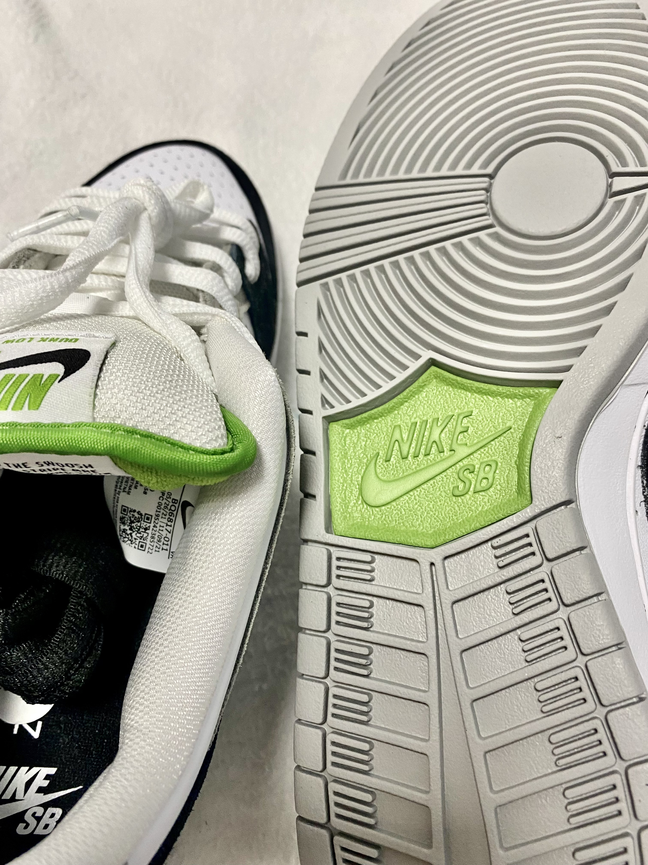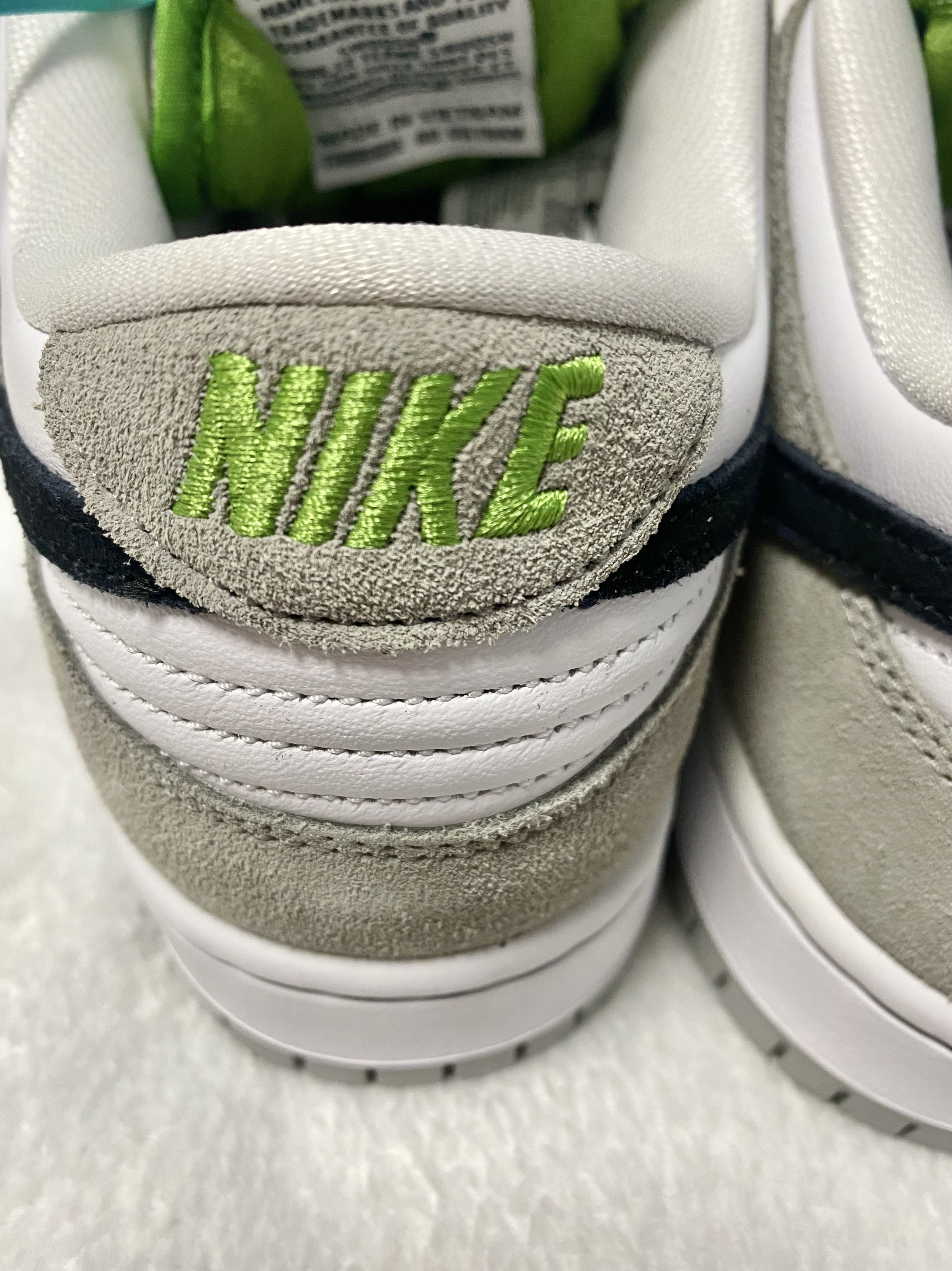 很有特点的一款SB Dunk,整体采用经典黑白灰配色 鞋舌和后跟刺绣用到了绿色,色彩层次感一下子就上来了,全鞋采用翻毛皮和皮革打造,鞋面的透气孔特别多,也是设计点,透气性应该会更好! 脚感还不错,尺码建议买大一码,日常穿搭也比较好搭配!