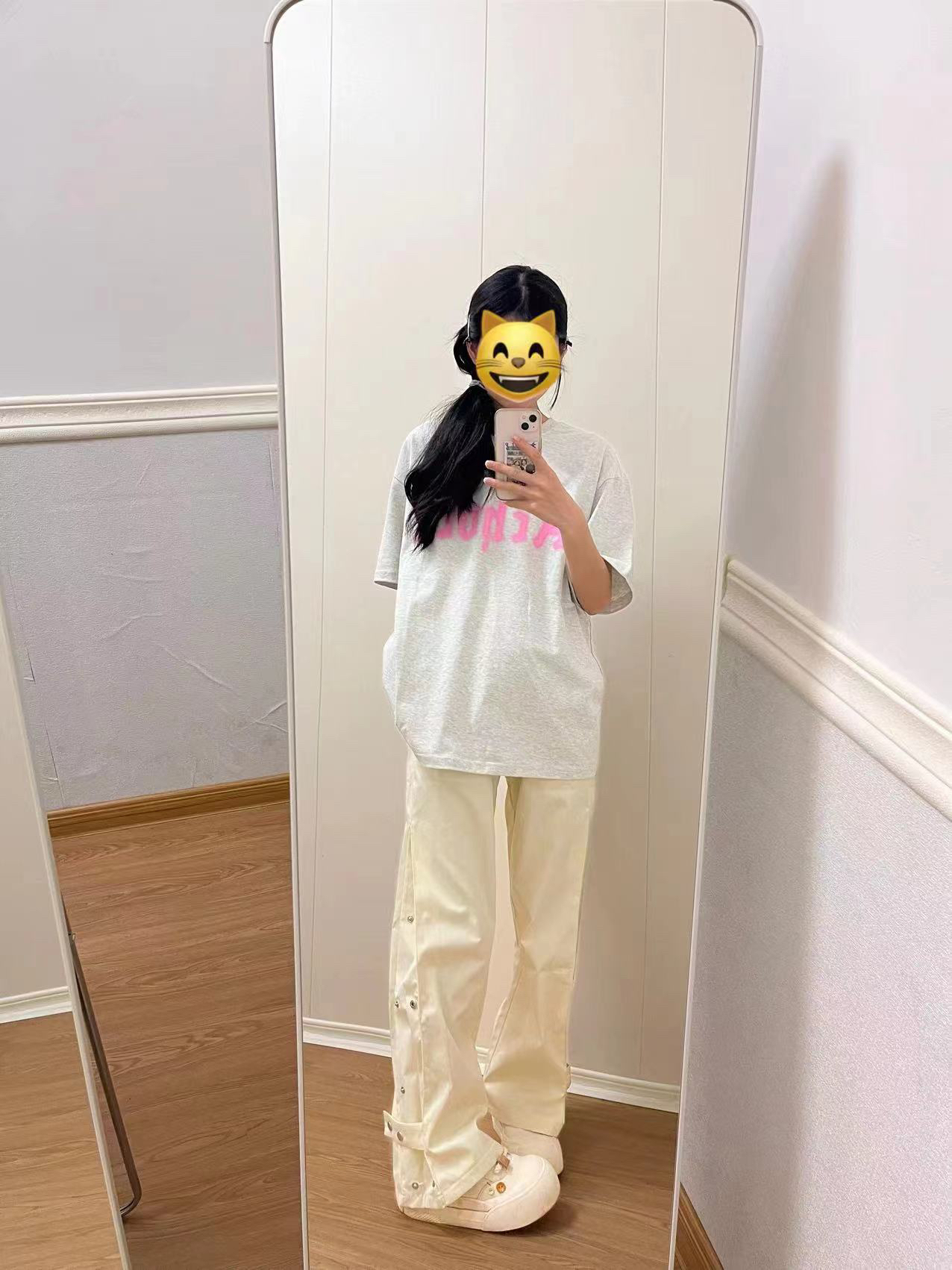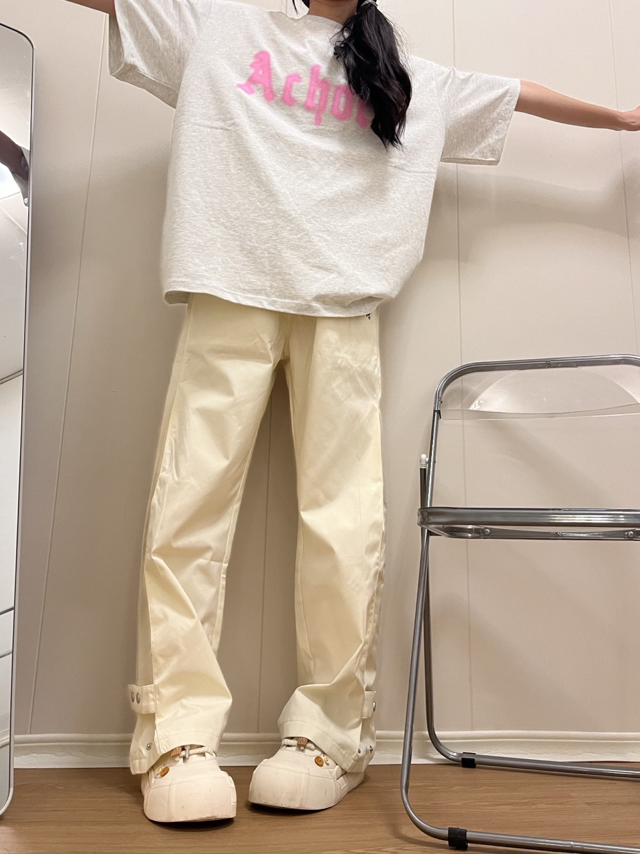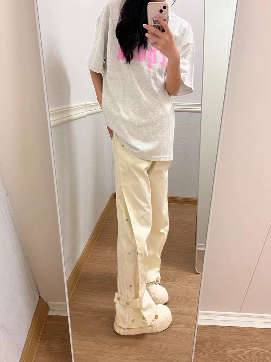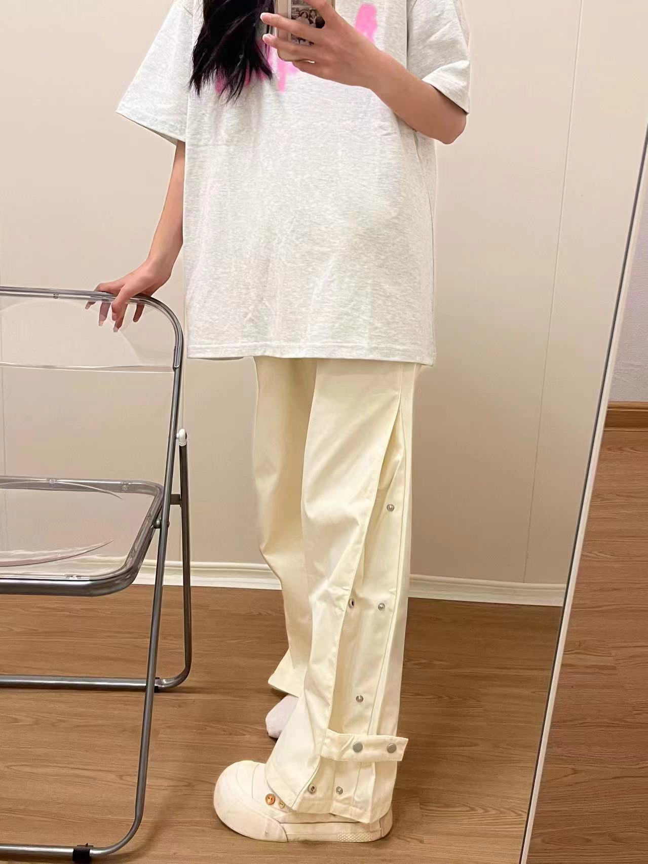 ①裤子是滑滑的面料,摸起来很舒服,夏天穿贼凉快!!米白色简约又高级,侧边还有排扣设计,直接一👖2️⃣穿啦!直筒秒变微喇!! 2裤子简约风格搭配起来毫不费力,随便穿个短袖都好看!!这就是百搭的力量!!~版型阔腿又显瘦算是我的本命裤子啦! ③裤子男女同款哦,还可以拿来当情侣款哦~