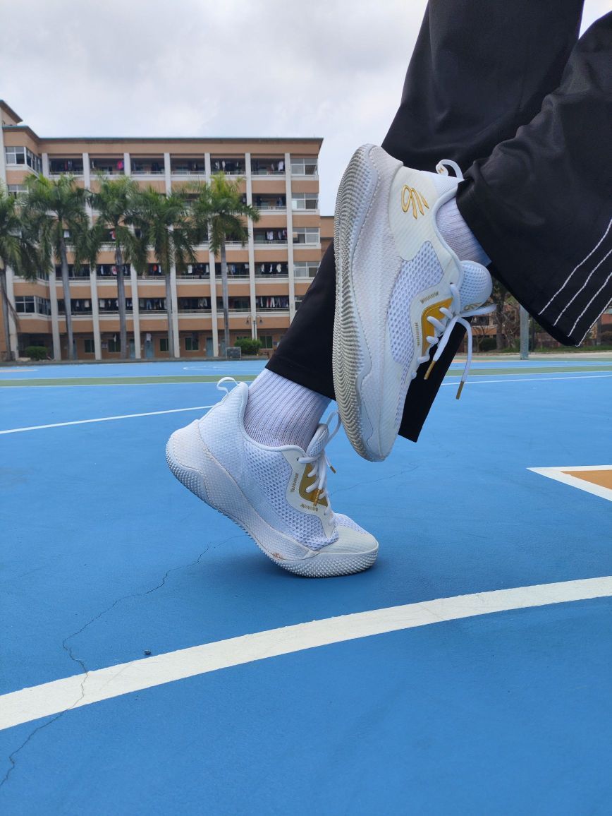 身高178cm,体重128斤,脚长27.0cm,脚型正常脚,这双选择的是43码。 上脚感受:(1)鞋面材质:鞋面是大面积的工程网面跟热软压胶,整个鞋面很棉软,摸上去很轻薄,透气性非常不错,完全不会闷脚,相对应的鞋面强度有所降低。 (2)静态反馈:初上脚第一感受就是包裹感很柔软舒适,脚趾头可以自由灵活发力,全掌的hovi缓震科技,脚感偏硬,鞋带组带来的绑定效果不错。 实战感受:(1)包裹不错:包裹很...