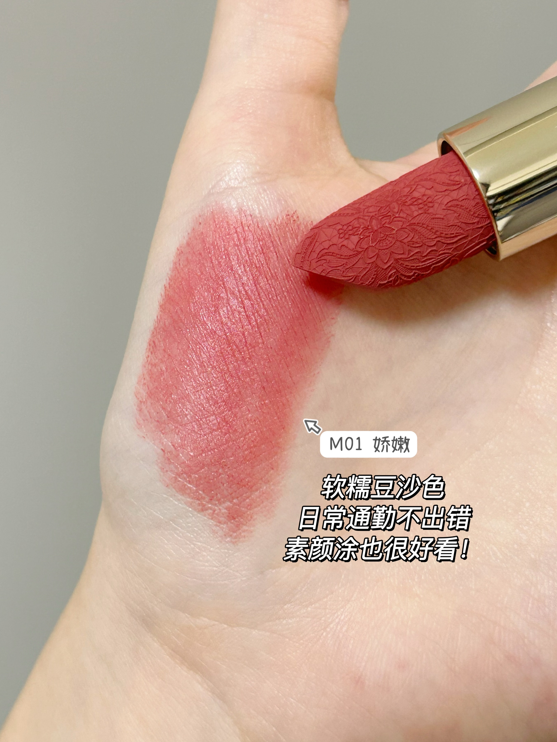 最近发现一个颜值超高的宝藏口红 还被同事问色号了! 就是卡姿兰的小轻纱口红 粉红的管体 颜值很高~ 而且拿起来也有质感 最特别的就是这个口红的膏体是轻纱蕾丝雕花设计 一整个拿捏我 简直就是公主用的口红! 不仅颜值高 涂起来也很好看 我入手的M01 娇嫩 正如其名 是一个粉粉嫩嫩软糯糯的豆沙色 涂起来显气色又很日常 素颜涂也好看 日常通勤用它不会出错 而且上唇很丝滑 不会卡皮 哑而不干 真的很推...