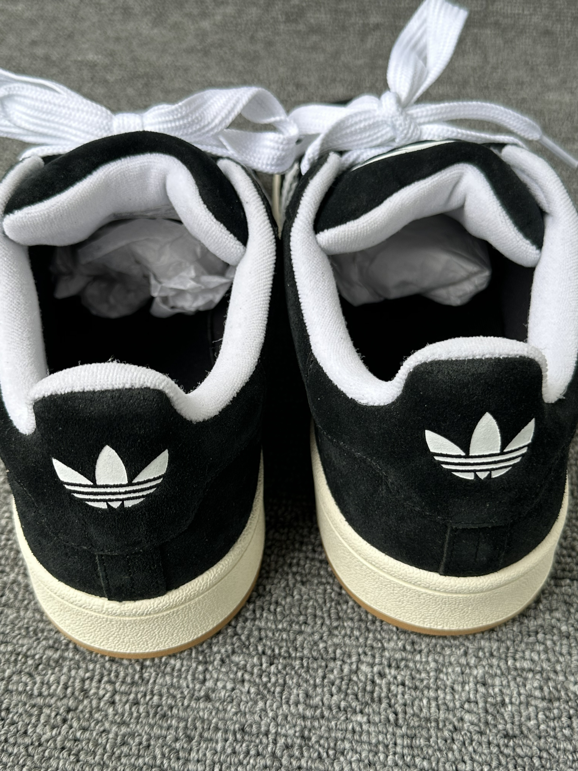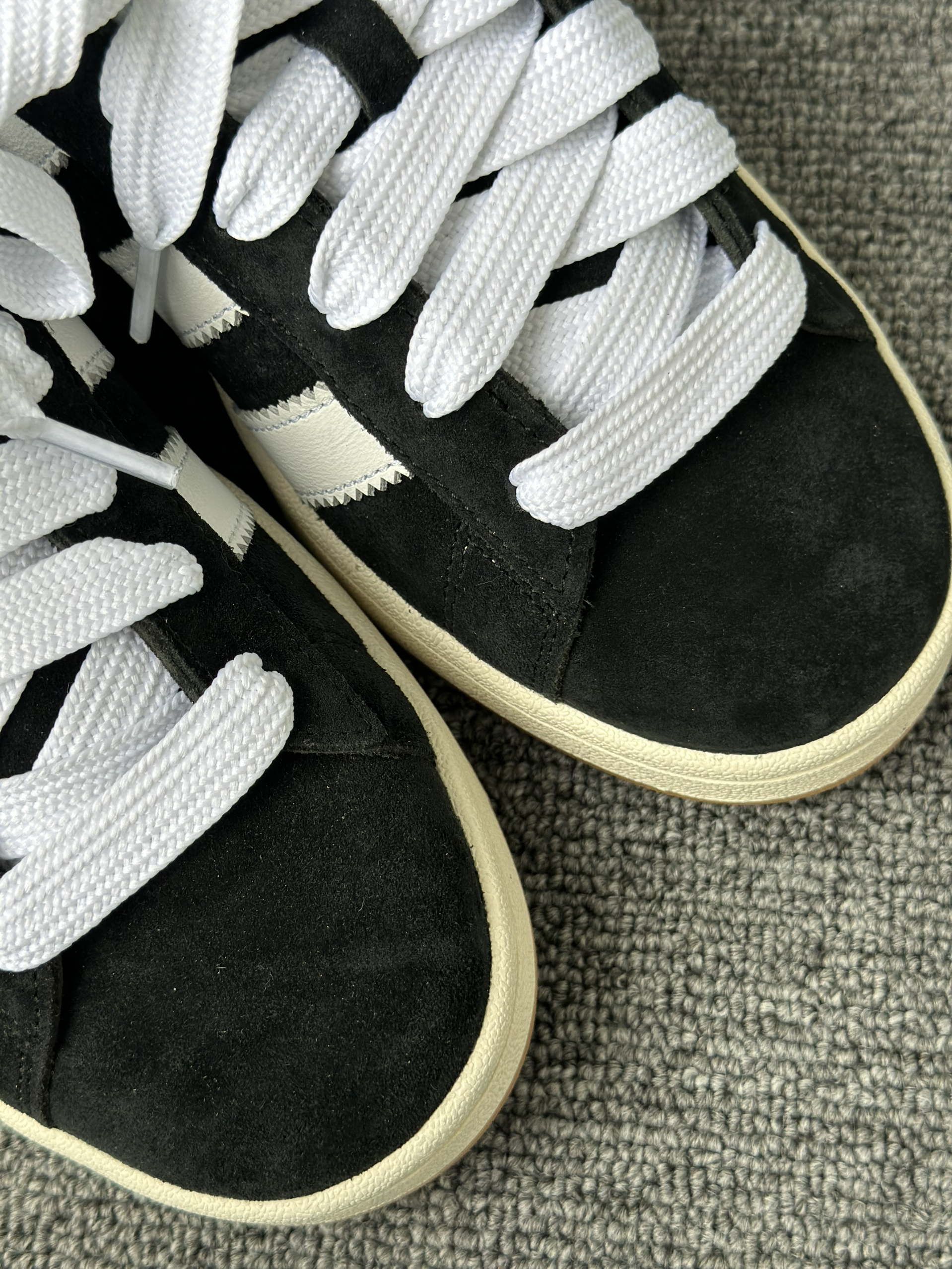 今天给大家分享一双阿迪的Campus 面包鞋,鞋身都是由麂皮制作,这双也是经典的黑白配色, 我自己喜欢穿厚鞋舌的SB系列,所以我对这双也是情有独钟,宽大的鞋带设计也是独有的体闲风,尺码上我建议正常码数,这双我选42码。