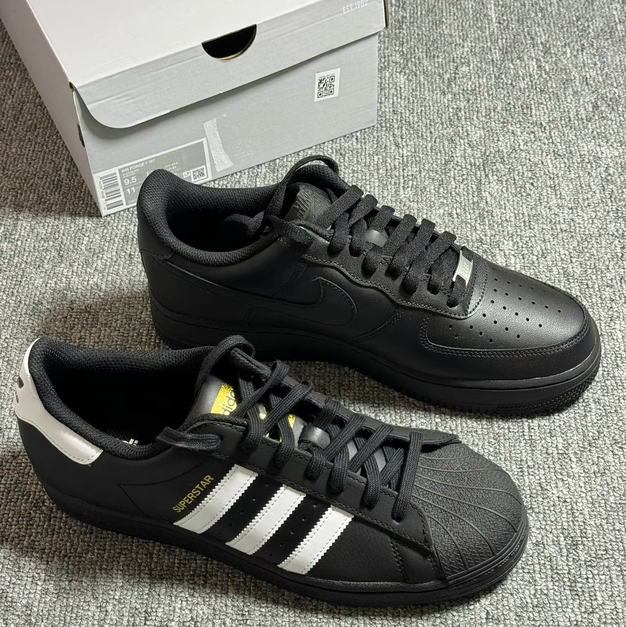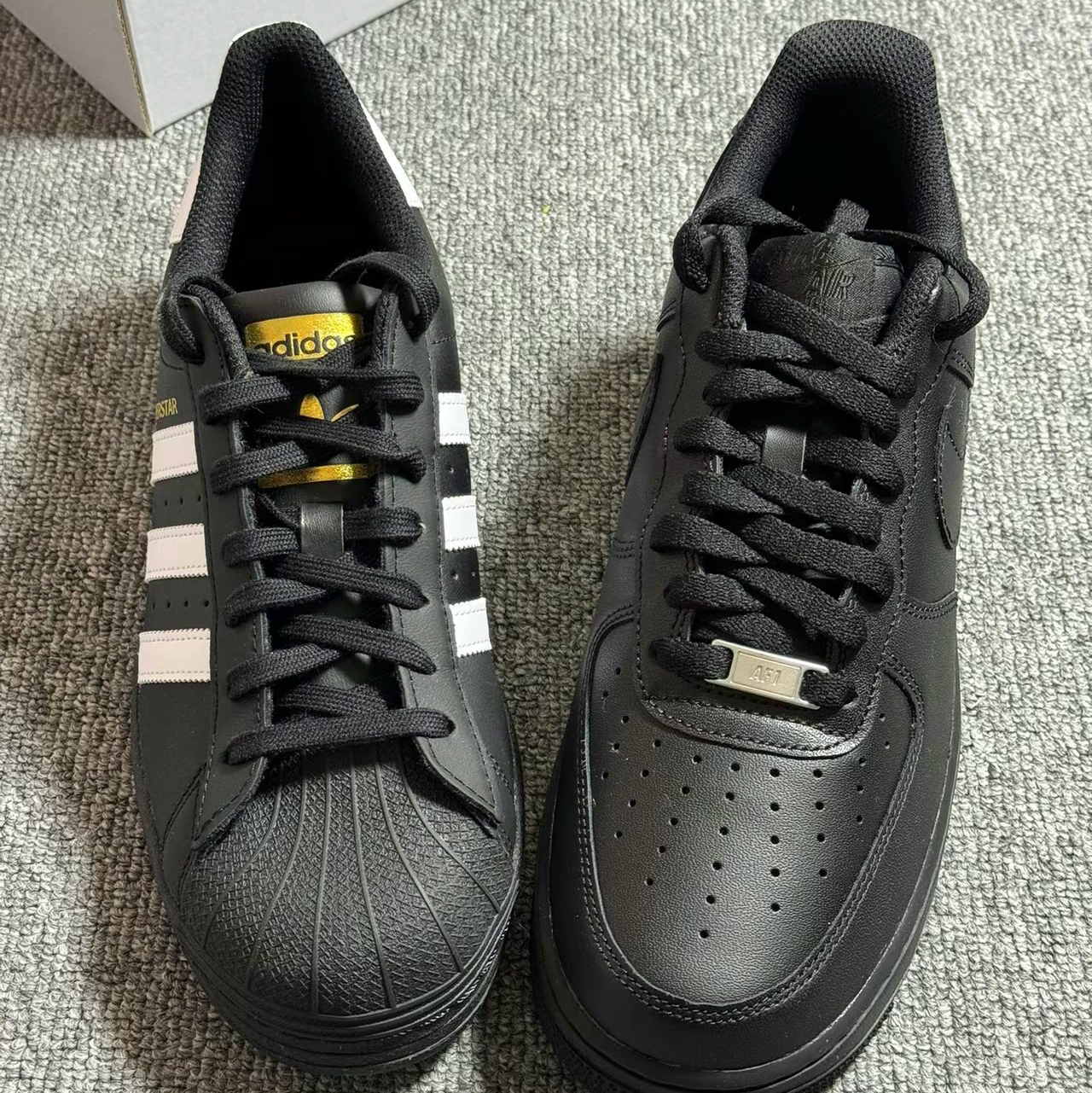 首先空军这款是真的全黑色,阿迪是大面积黑色搭配白色点缀,两款颜值都很高。 脚感基本没啥区别,刚穿都比较硬,空军有气垫,踩开后会舒服一点。 都是经典款,人气都很高,阿迪的偏秀气一点,空军更饱满一点。 搭配的话都比较推荐工装或者牛仔裤門,颜值都很不错。