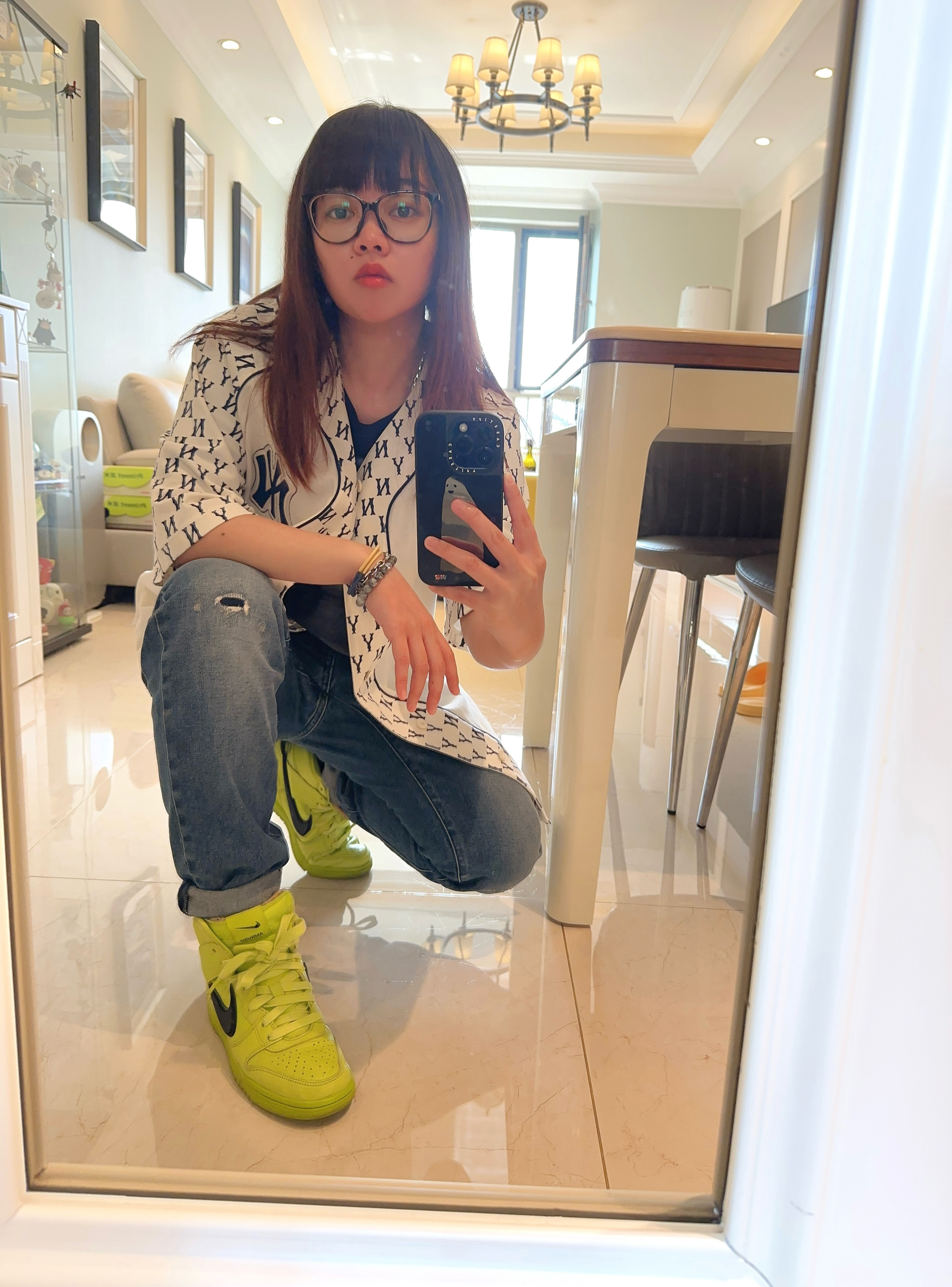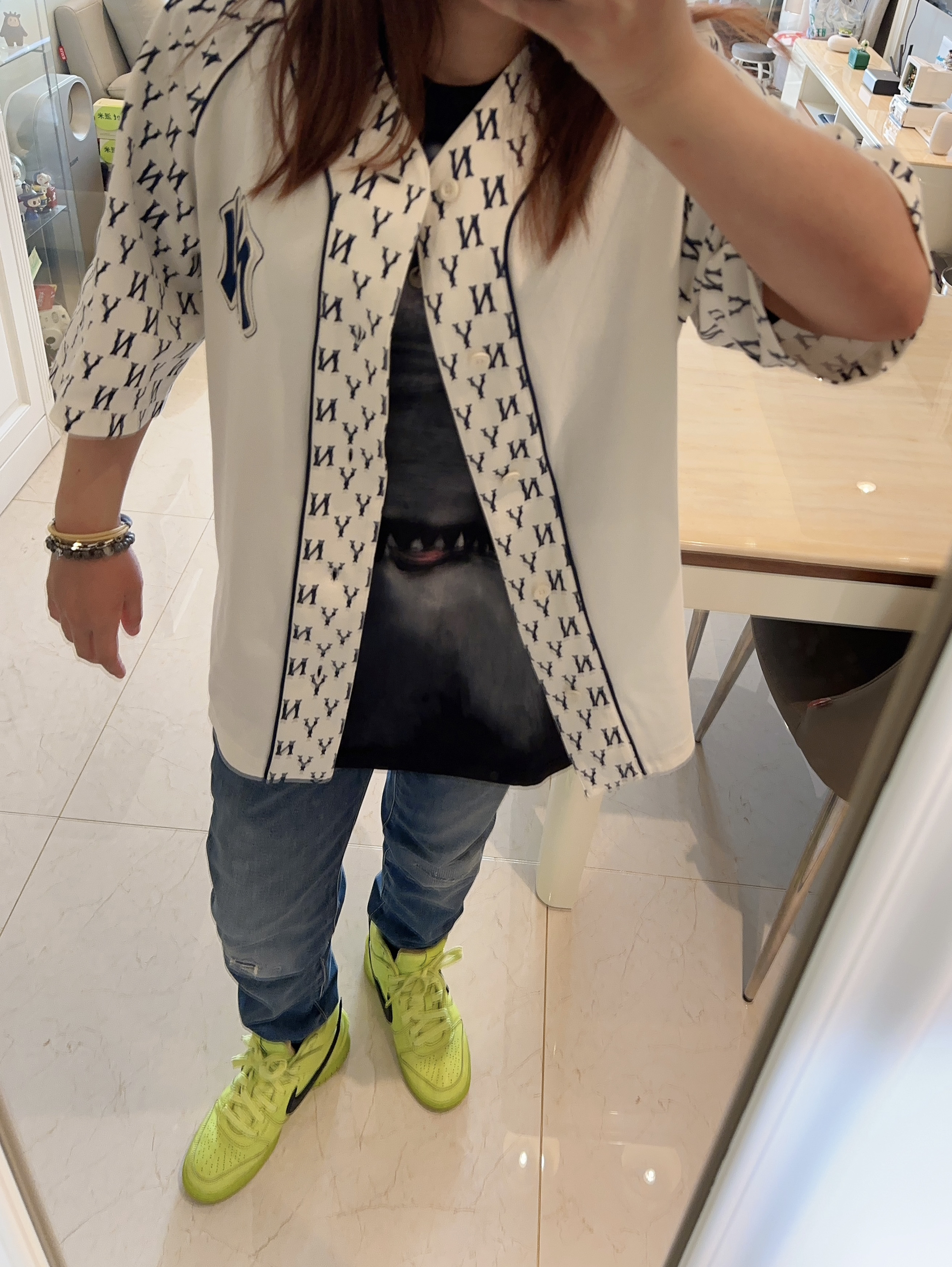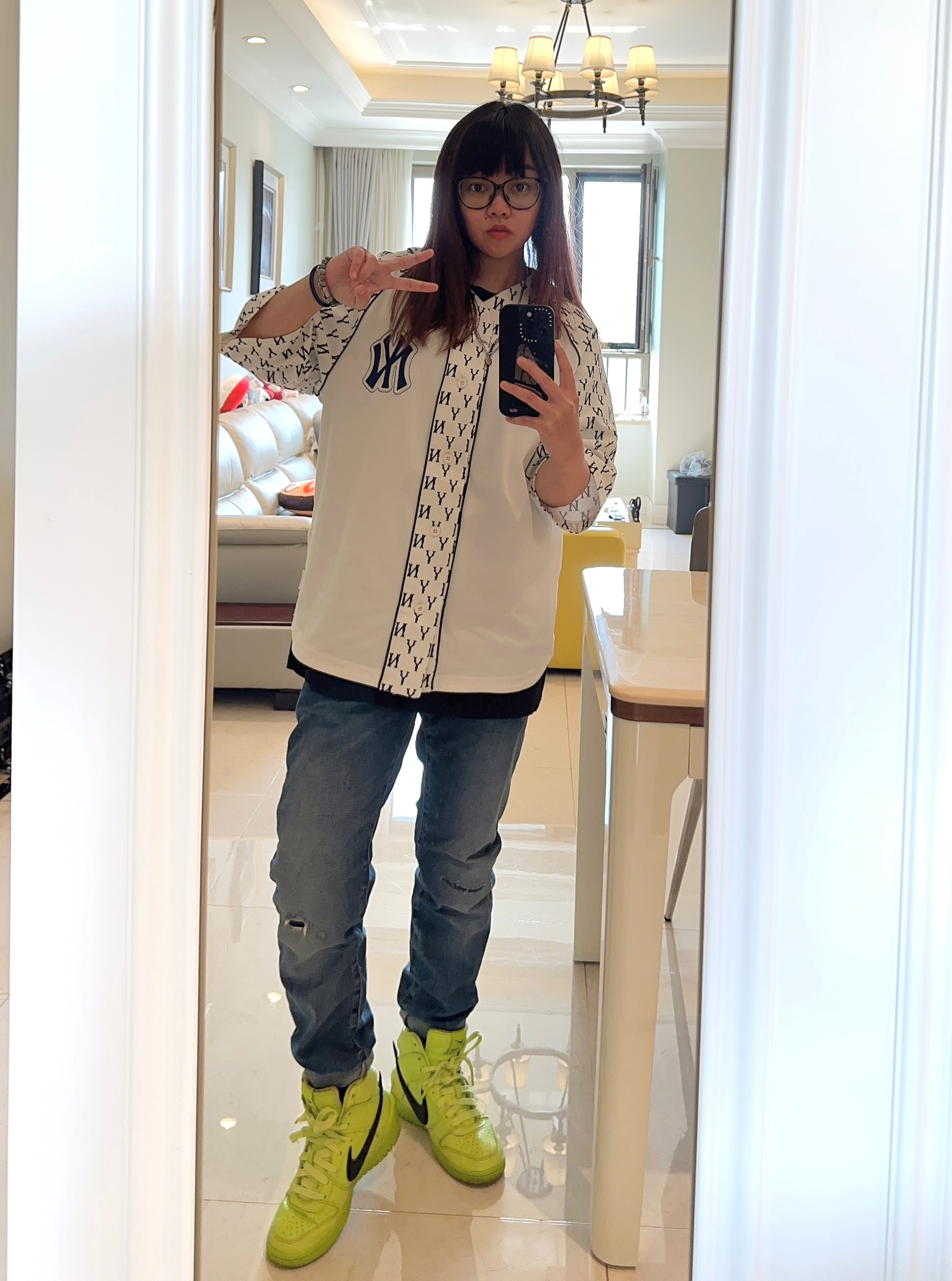 今天26度,这还不穿半袖出去撒欢儿? 今天穿的是米白色,里面搭个黑t堪称完美。 棒球短袖的好处是领子大,会先凸显脖子。 并且在天气没有那么热的时候,叠穿还保暖 搭了双ambush的荧光黄高帮,主打一个骚气! 出去帅了
