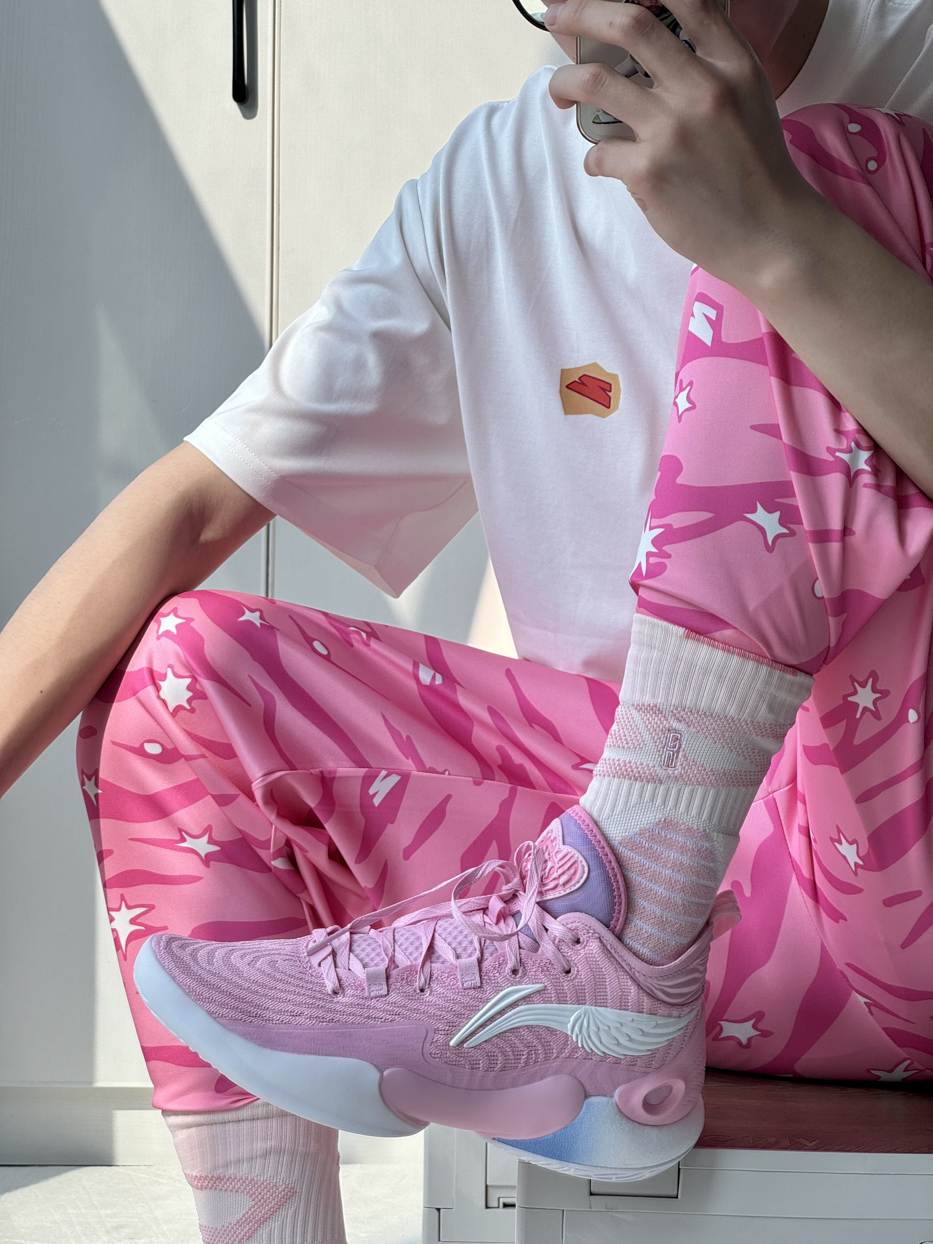 oi又是喜欢的粉色球鞋穿搭相信男生都会很爱吧 今日份球场美式穿搭 👔搭配一件百搭的白色短袖休闲打球都可轻松驾驭 👖选择一条骚气的粉色美式长裤打球很不错挺吸引眼球 👟上脚驭帅18情人节配色 又是一双帅气的粉色球鞋logo融合翅膀设计很喜欢!