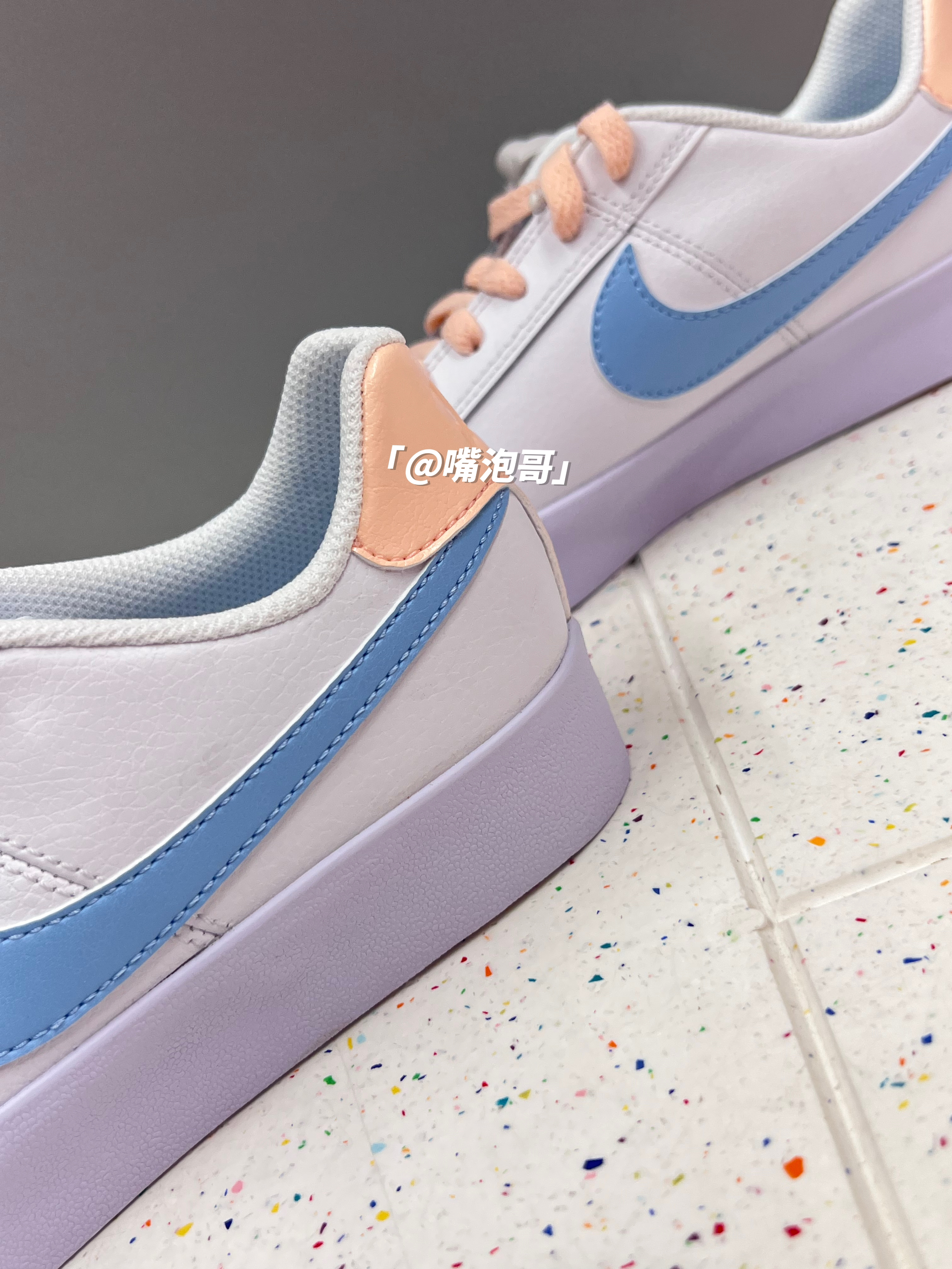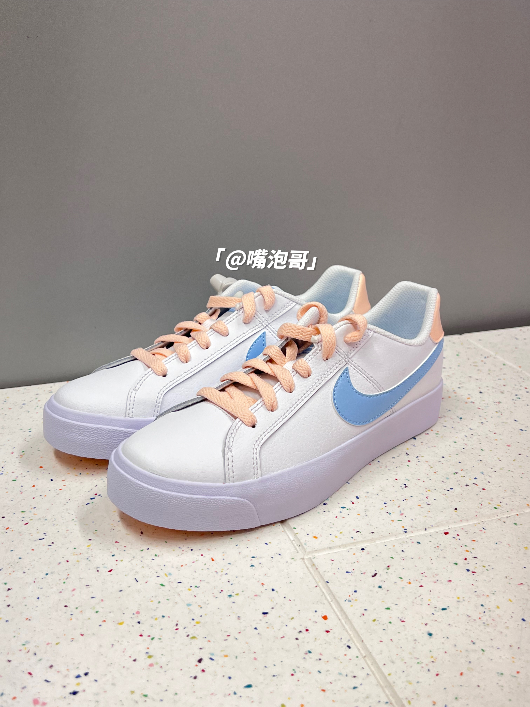 👟:Court Royale AC 蓝白粉 简介: 鞋款是一双低帮的休闲板鞋,整双鞋子选用了白色作为主色调,细节处加入了粉色、蓝色装饰,看着还是蛮有小清新感,虽然鞋面用了皮革,质感还不错,但中大底并没有采用缓震材料,所以脚感偏硬。 细节: 鞋面采用了复合皮革打造而成,整体皮质中规中矩,鞋舌采用了织物布面材料,增强了透气性,两侧的swoosh选用蓝色皮革制成,中底与大底为一体式设计,采用...