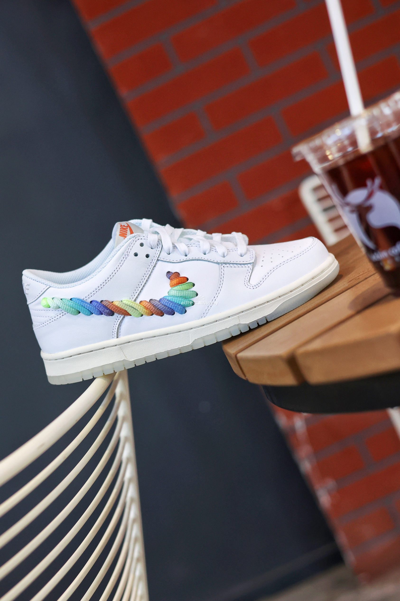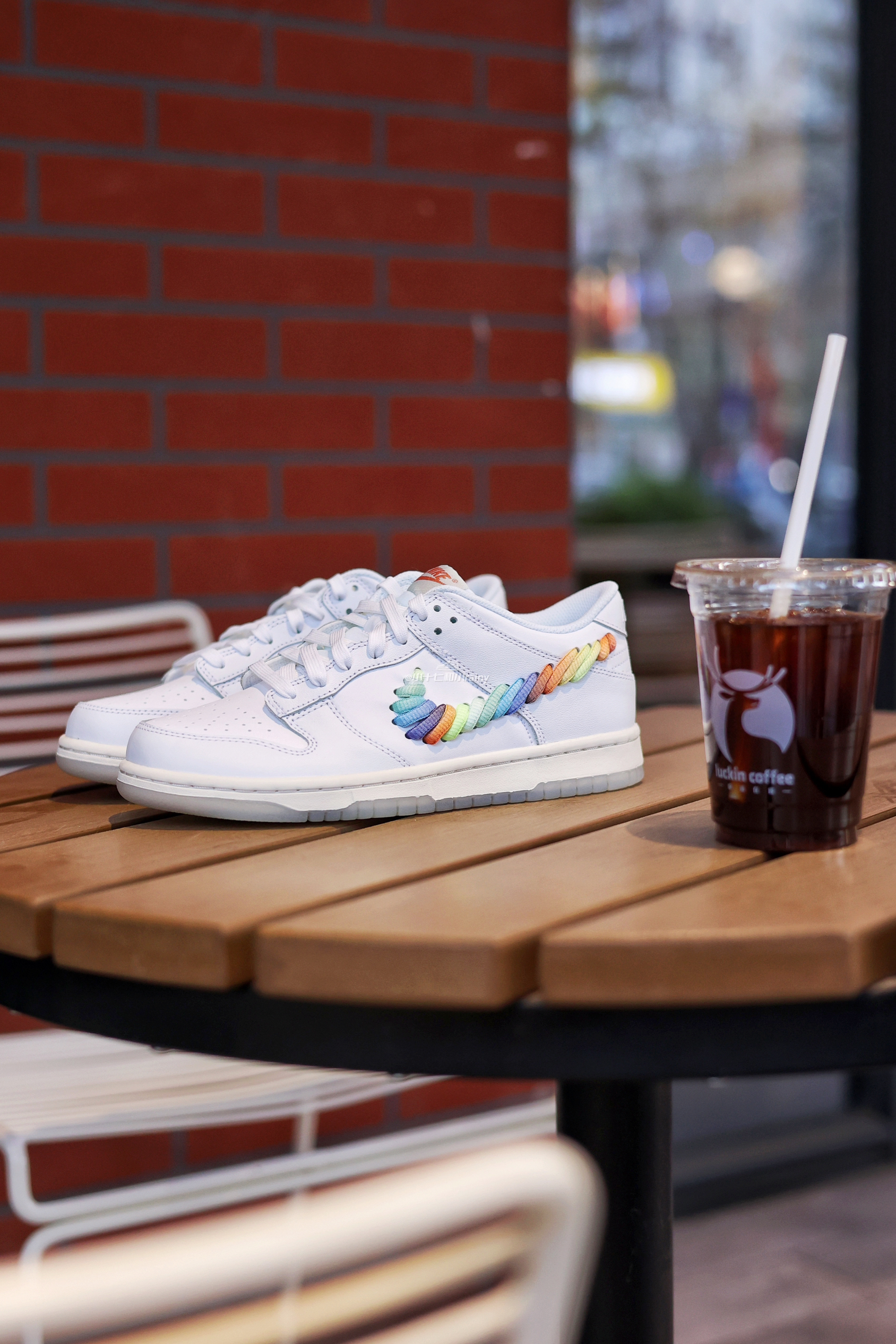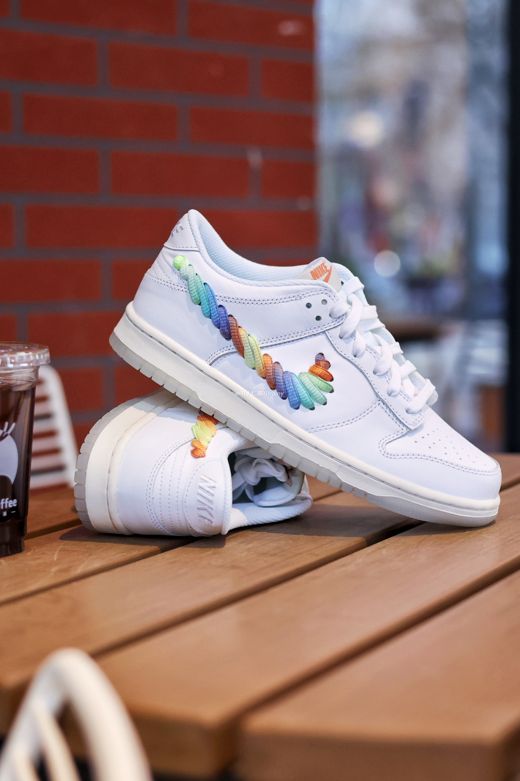 🧐推荐理由 今天给大家带来的是一双全新的Dunk鞋款,这次又带来不一样的设计,彩虹编织的设计,一起来看看吧! 😏实物质感 整双鞋凭借着全白色皮革鞋面以及帆布白色中底/半透明棕色外底,呈现出复古简洁的造型。 吸睛看点出现在鞋侧标志位置,将原有的 SWOOSH 重塑之后,以彩色鞋带编织方式展现出全新视觉效果,让人眼前一亮。 此外,鞋舌绣标和位于鞋垫上的标志还以桔色点缀,增加配色上的巧思设计。 ...
