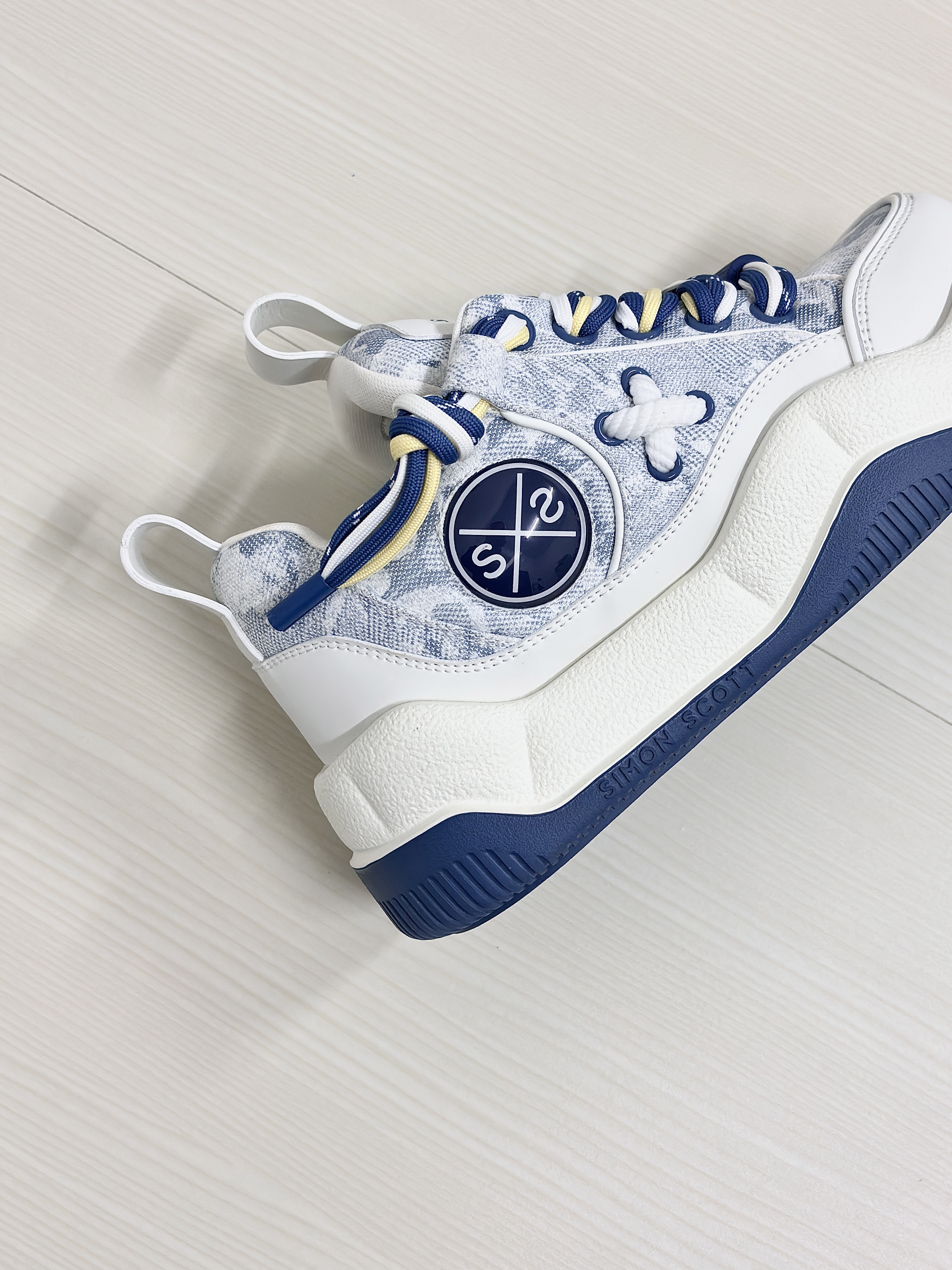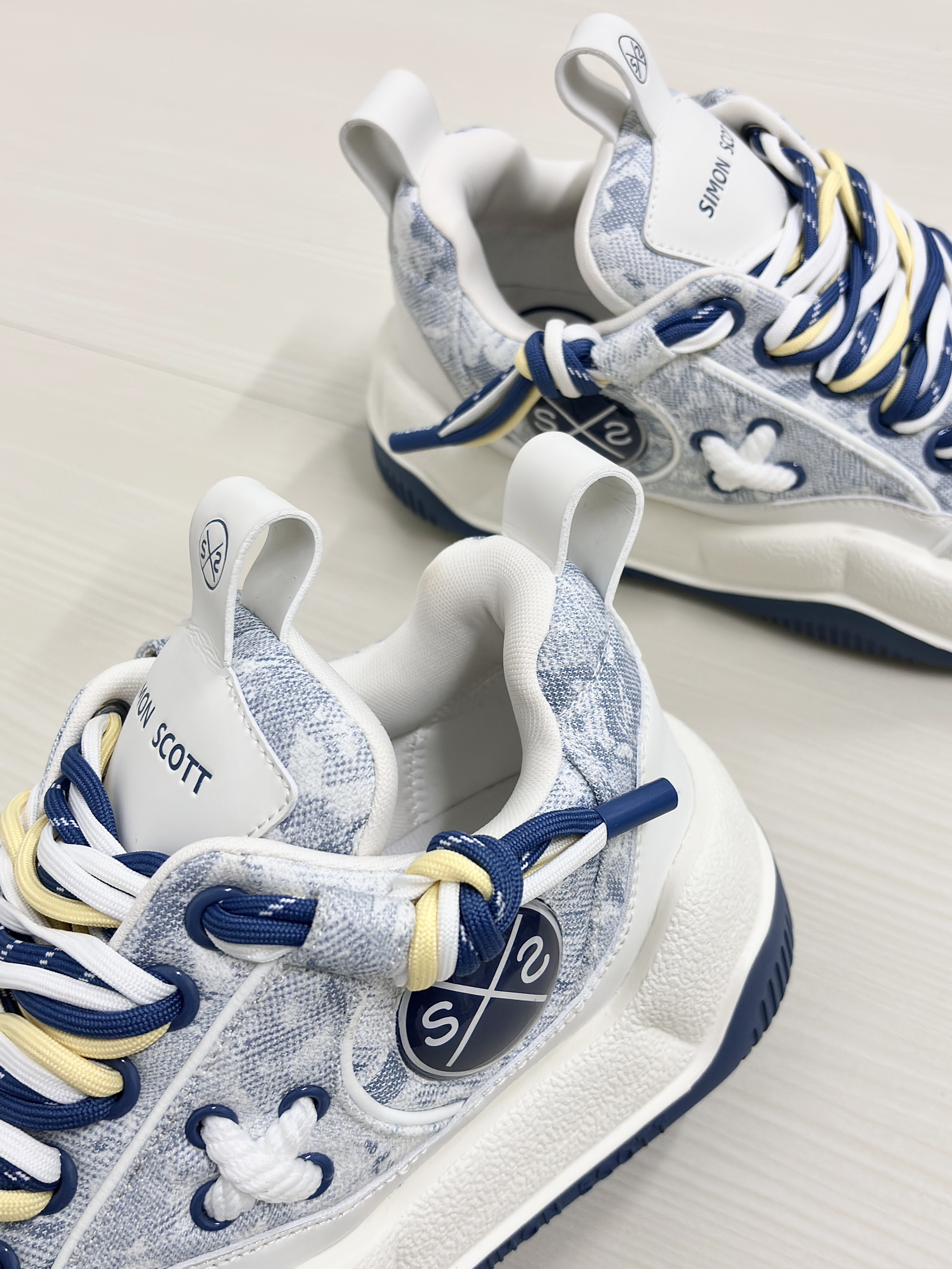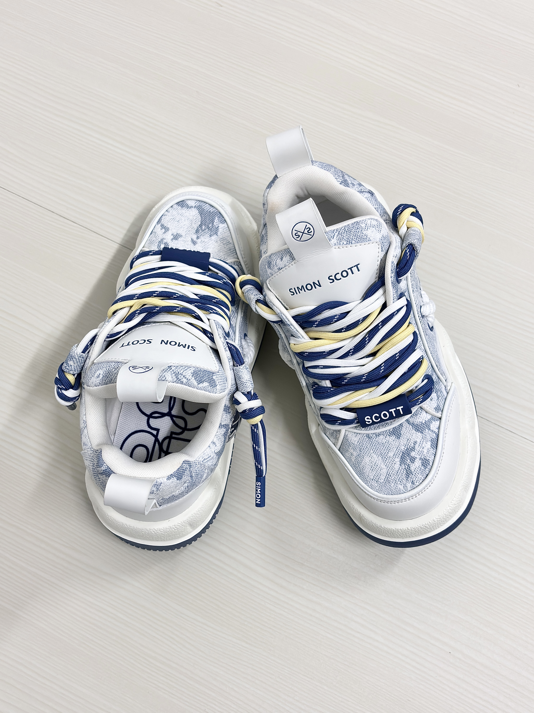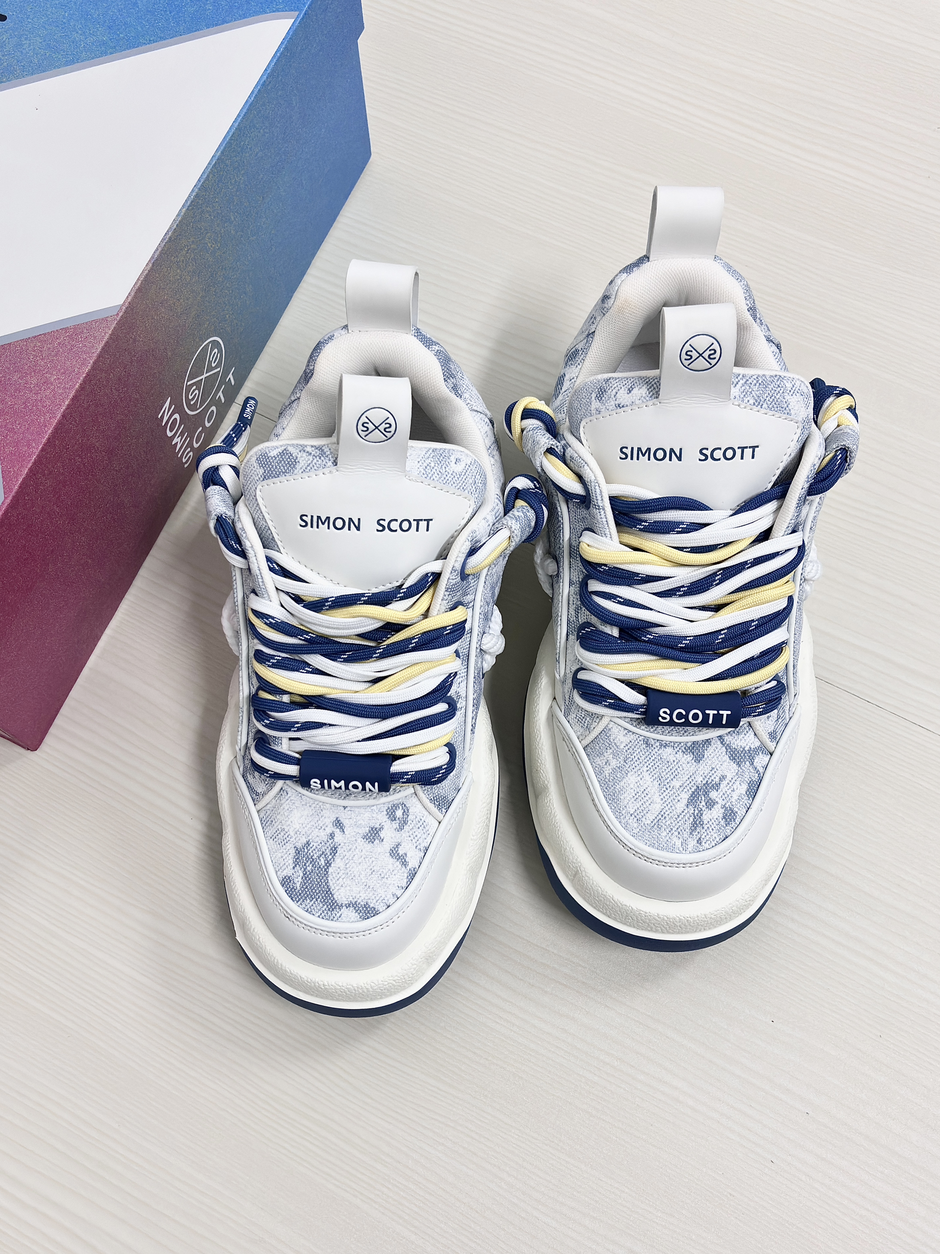 💁♂️:Hi~ 这里是大大纳mi ~ 👟:SIMON SCOTT SS XBOX面包鞋 以清新白蓝为主色调然 不撞款三色鞋带十牛仔暗花布面 显高级的同时自带潮流感~ 波浪形厚底设计脚感软糯 实打实增高5cm,小个子福音! 搭配上牛仔裤休闲裤都很耐看 尺码不偏码了正常选择就可以!