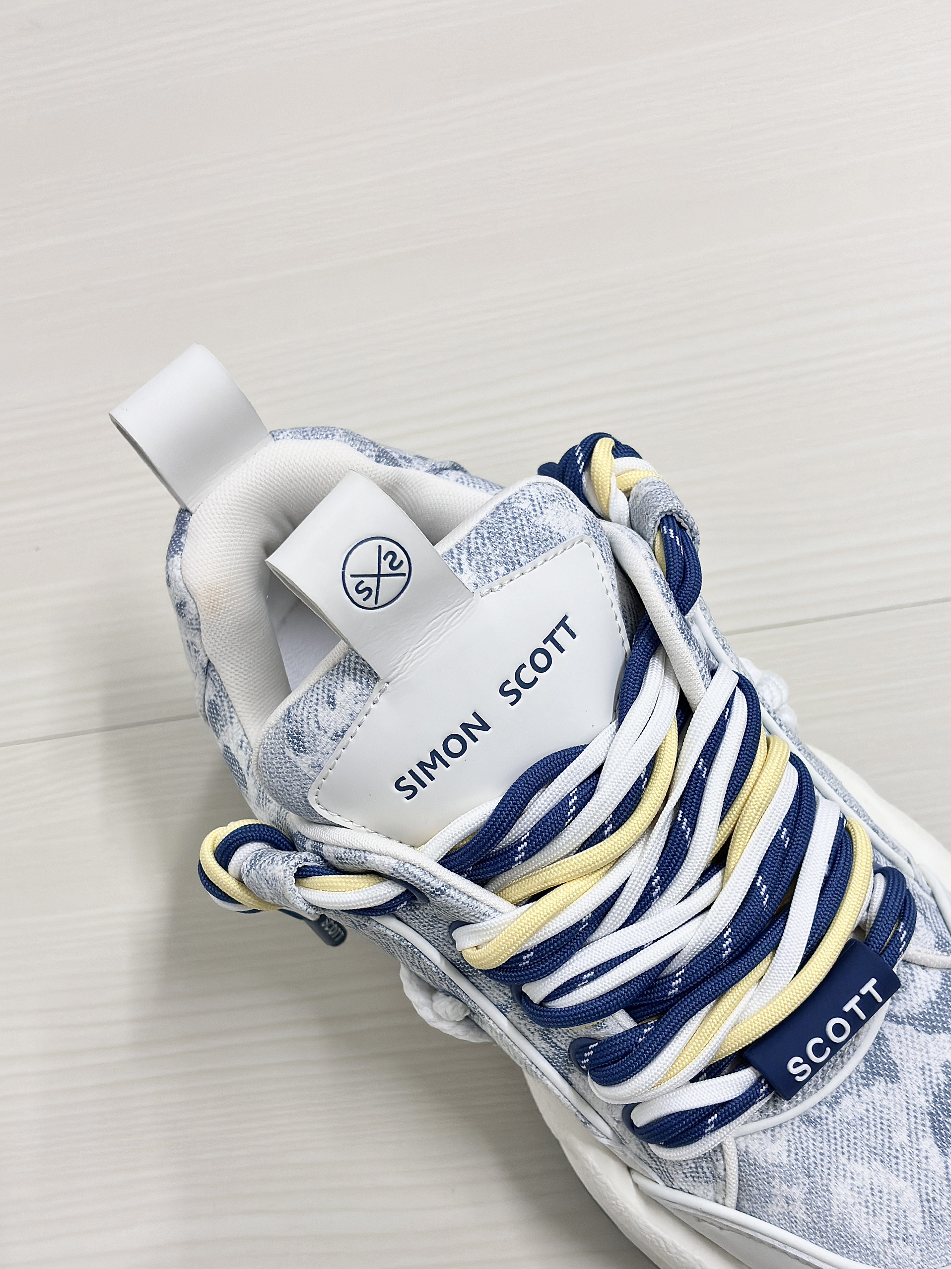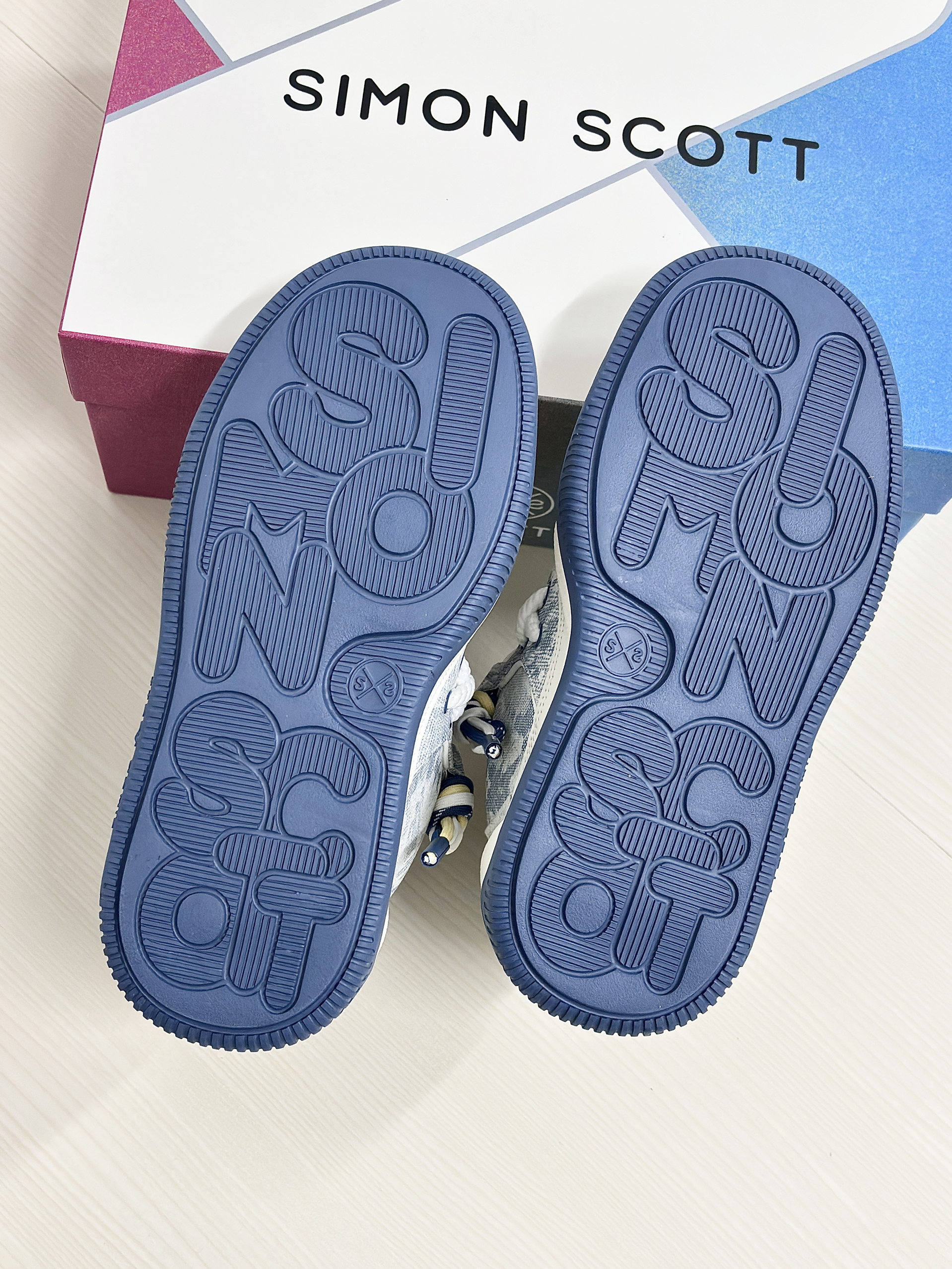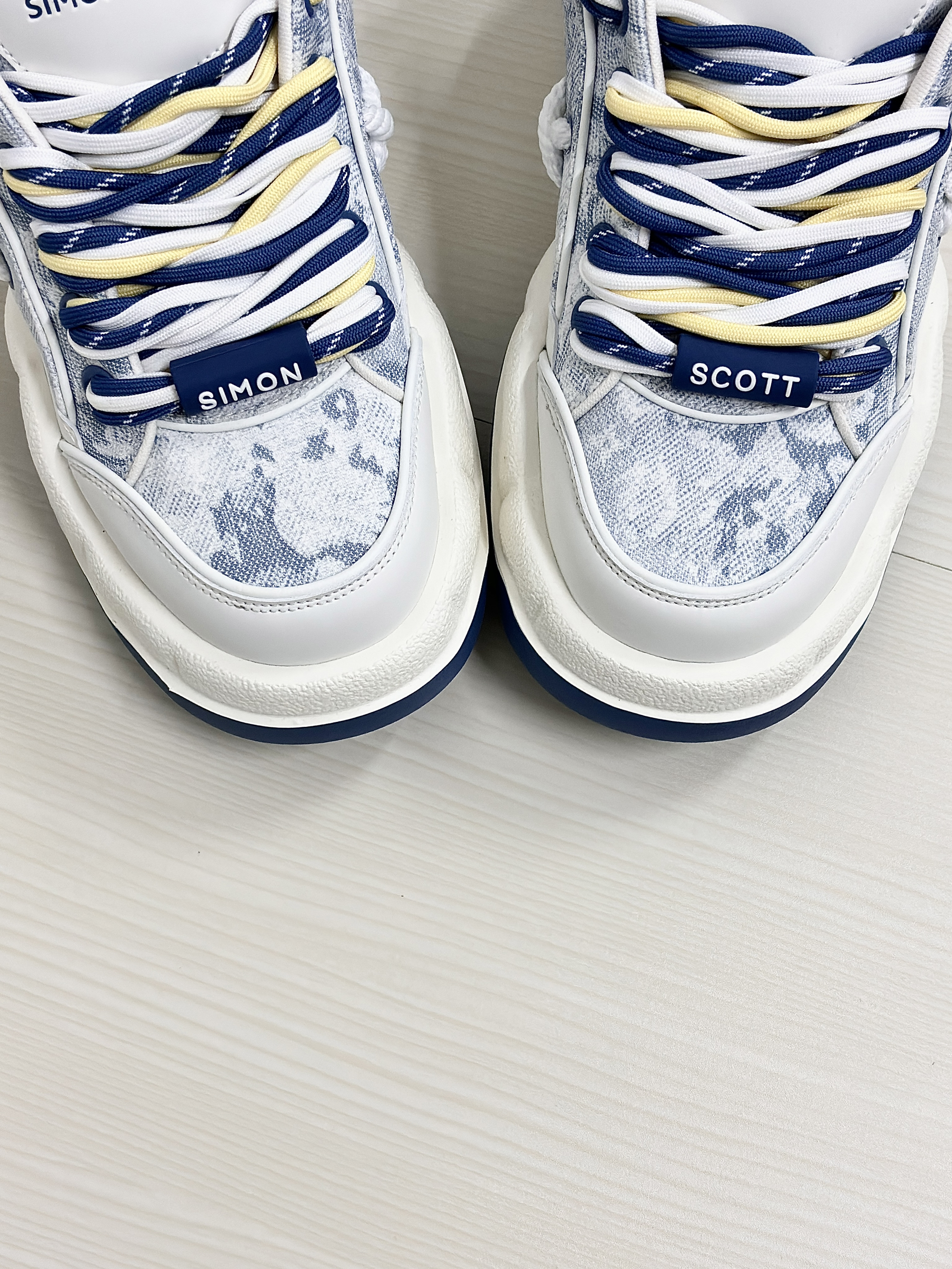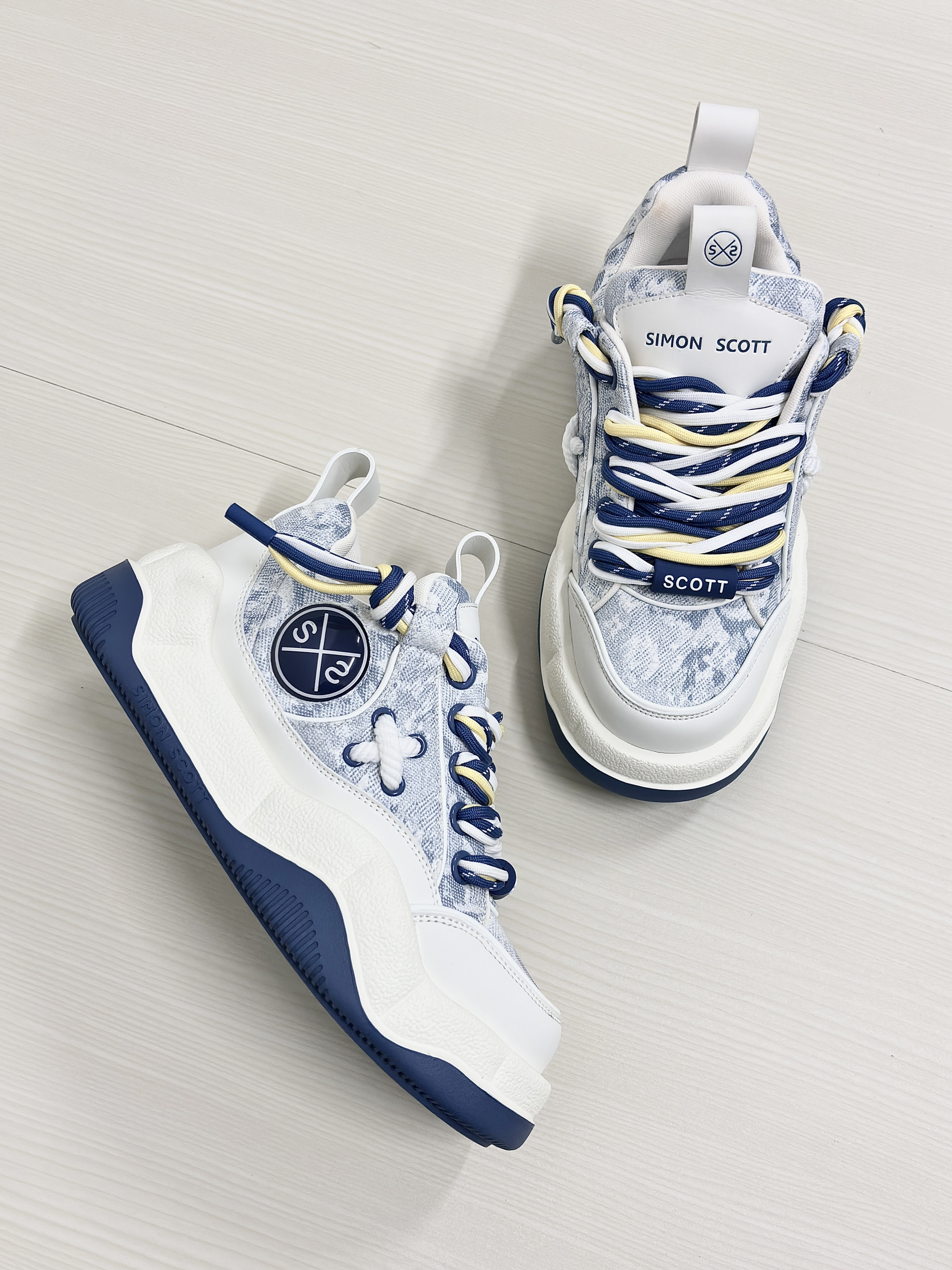 💁♂️:Hi~ 这里是大大纳mi ~ 👟:SIMON SCOTT SS XBOX面包鞋 以清新白蓝为主色调然 不撞款三色鞋带十牛仔暗花布面 显高级的同时自带潮流感~ 波浪形厚底设计脚感软糯 实打实增高5cm,小个子福音! 搭配上牛仔裤休闲裤都很耐看 尺码不偏码了正常选择就可以!