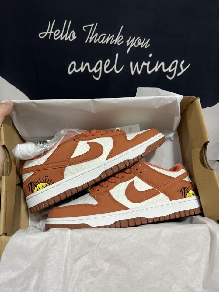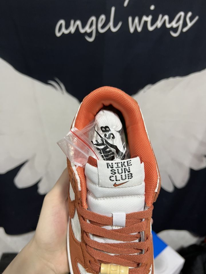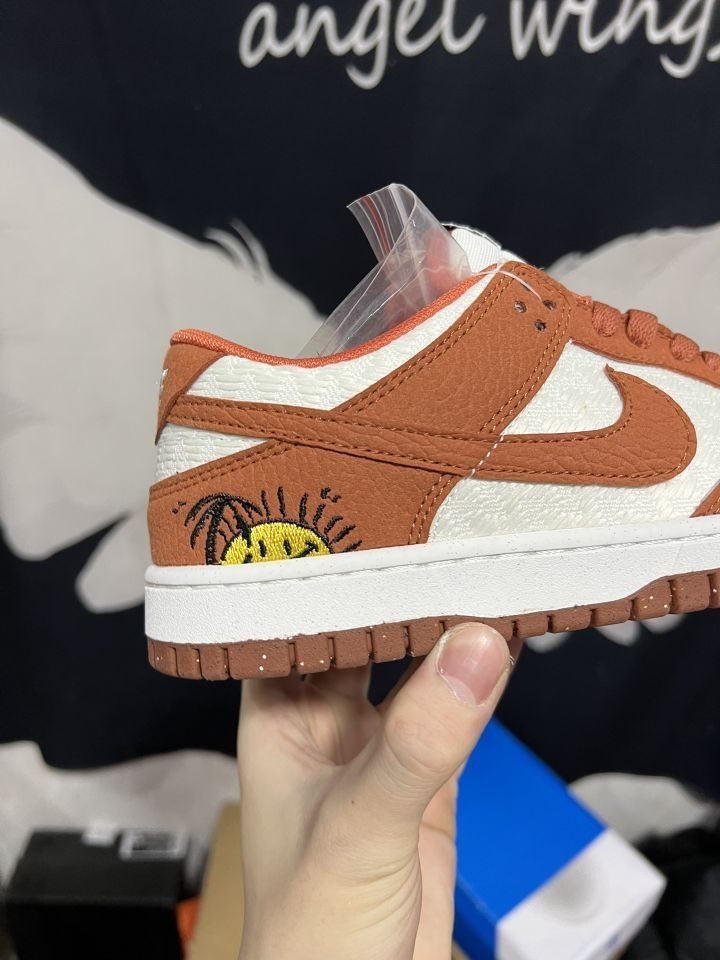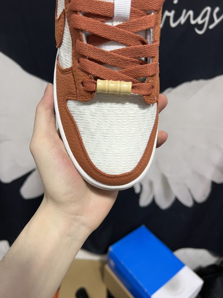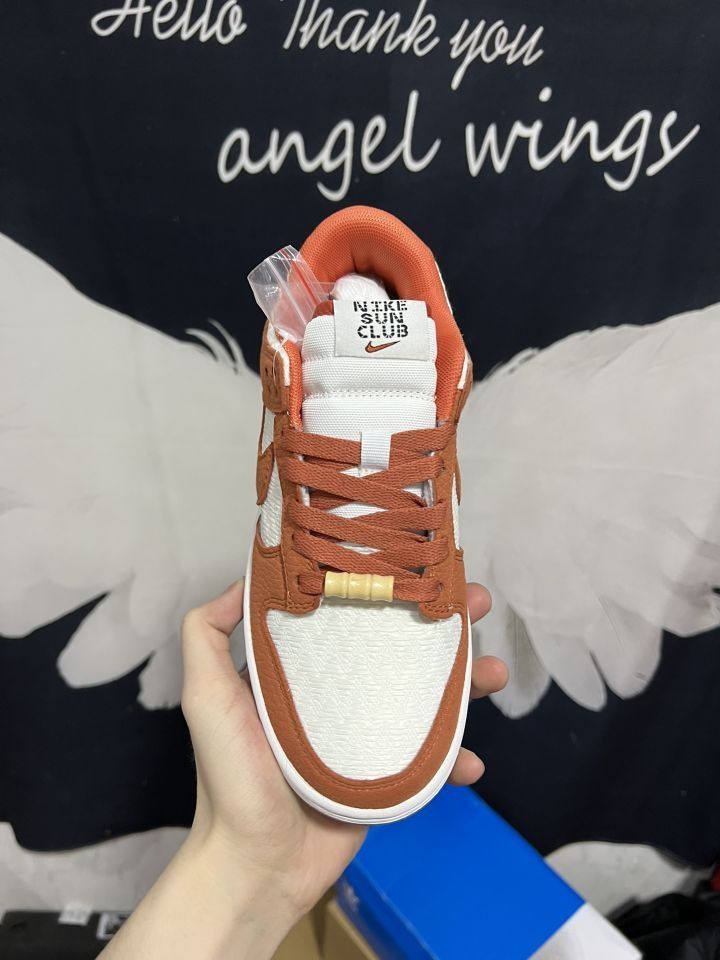 🔍落日沙滩🏄♂️--白橘Dunk,很有夏天落日与海风的味道~ 🍀鞋面采用荔枝纹皮革➕网纹织布构成,白色部分的织布勾勒得非常细节🤏与荔枝纹搭配很有纹理高级感,鞋带利用特制小竹筒代替常规鞋扣,上边还有个耐克小勾勾,这变动让它细节拉满,颜值爆表[爱心] 🌸穿着脚感偏硬,尺码标准,但网织布带来了高级也让清洁上了一个高度😭