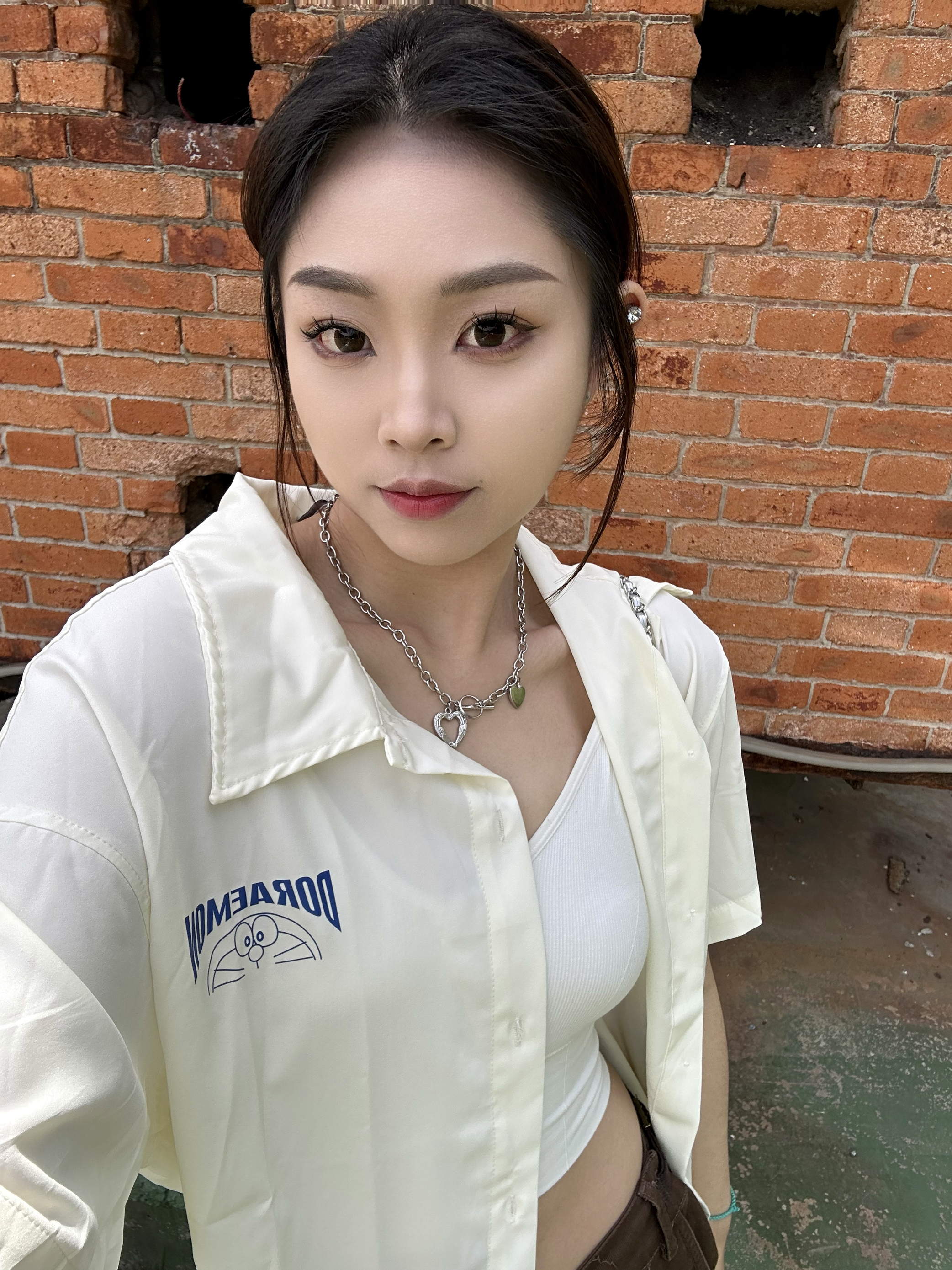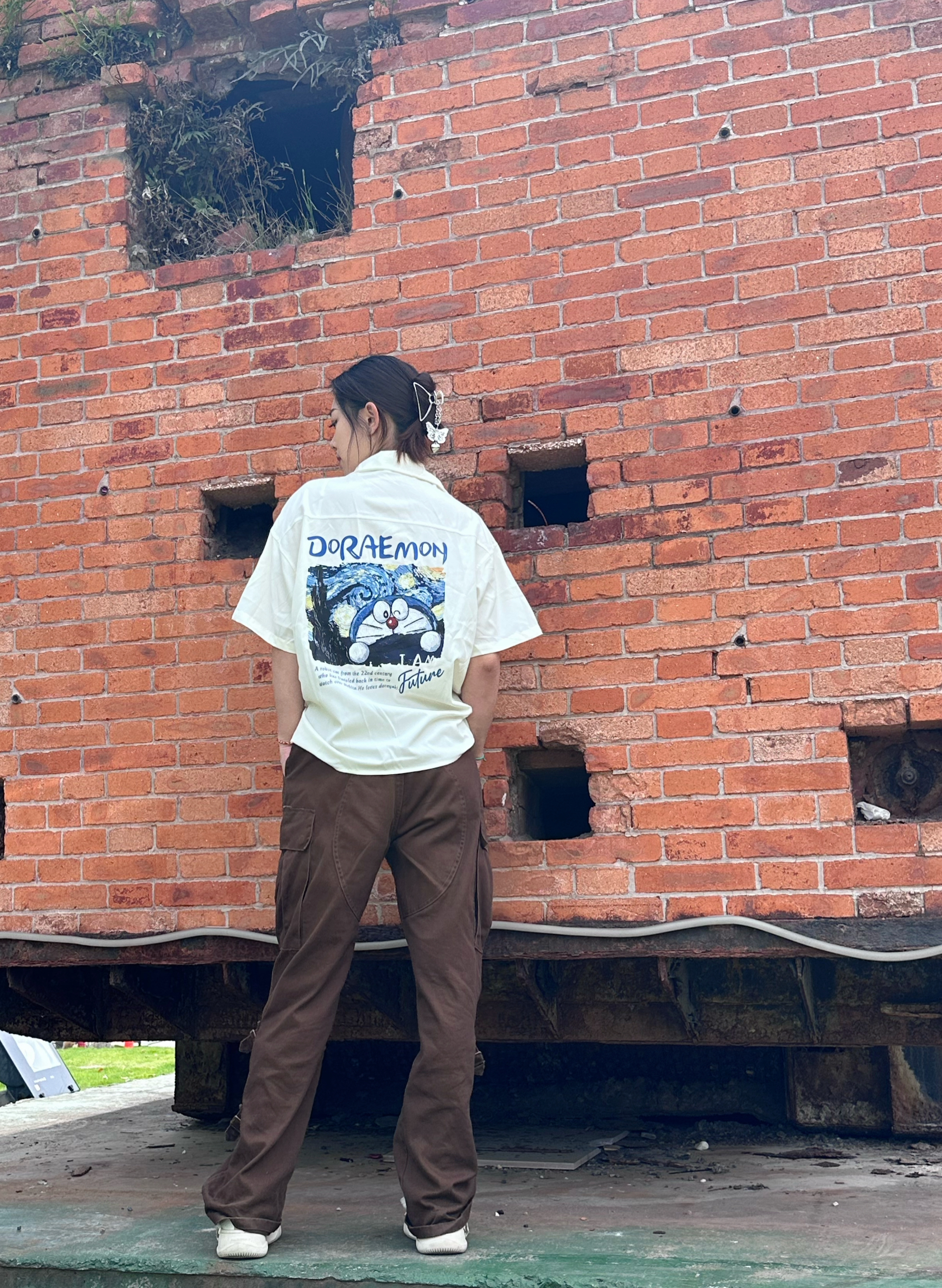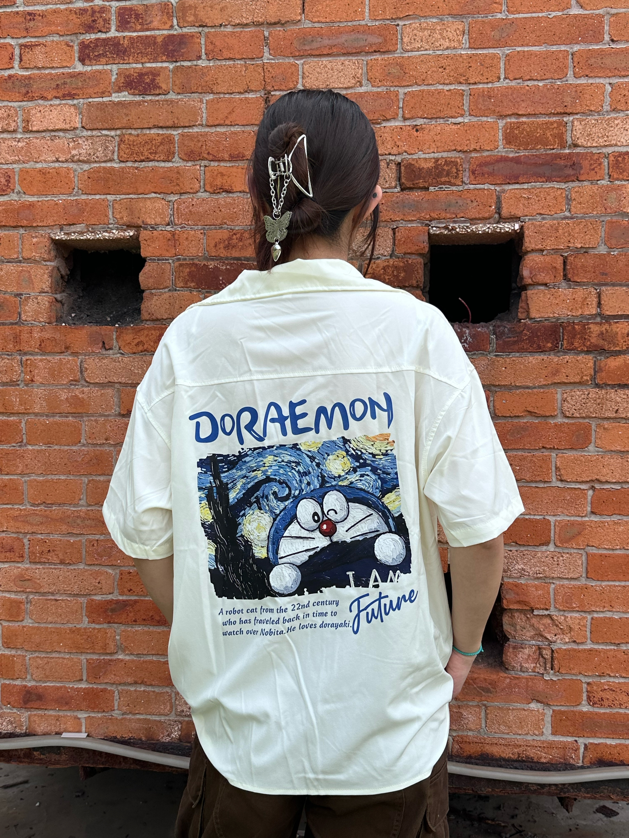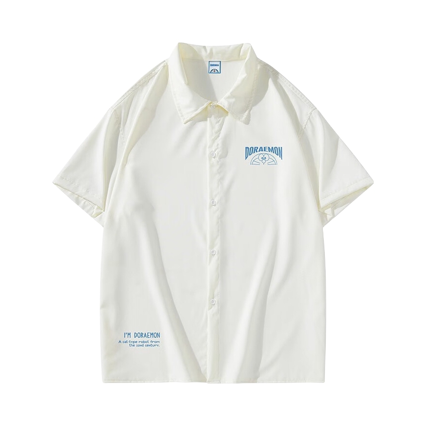 上身一件短袖衬衫 米白色真的很百搭 胸前及背后大面积哆啦A梦印花设计很潮酷 女生做外穿真的很合适✌️