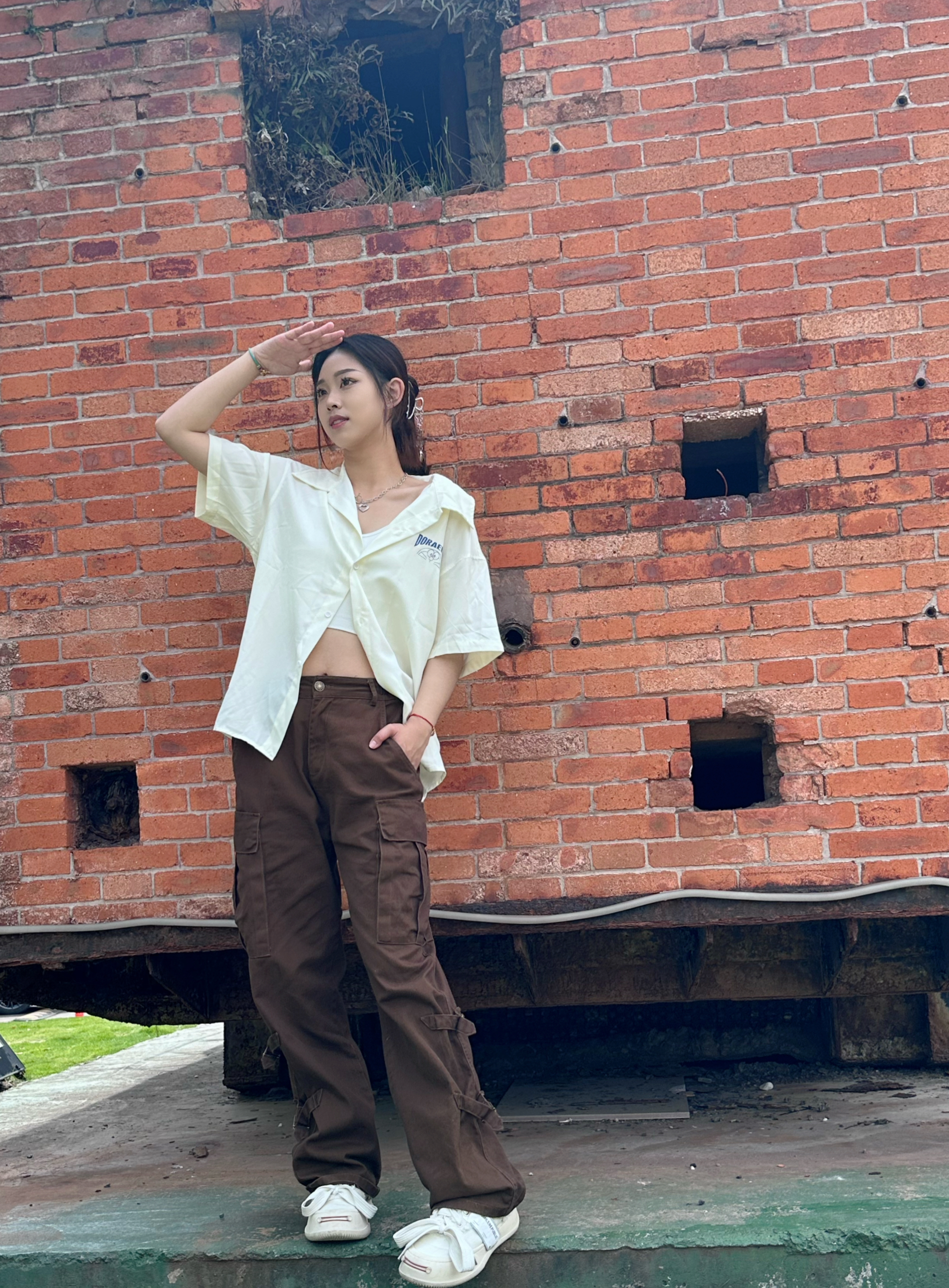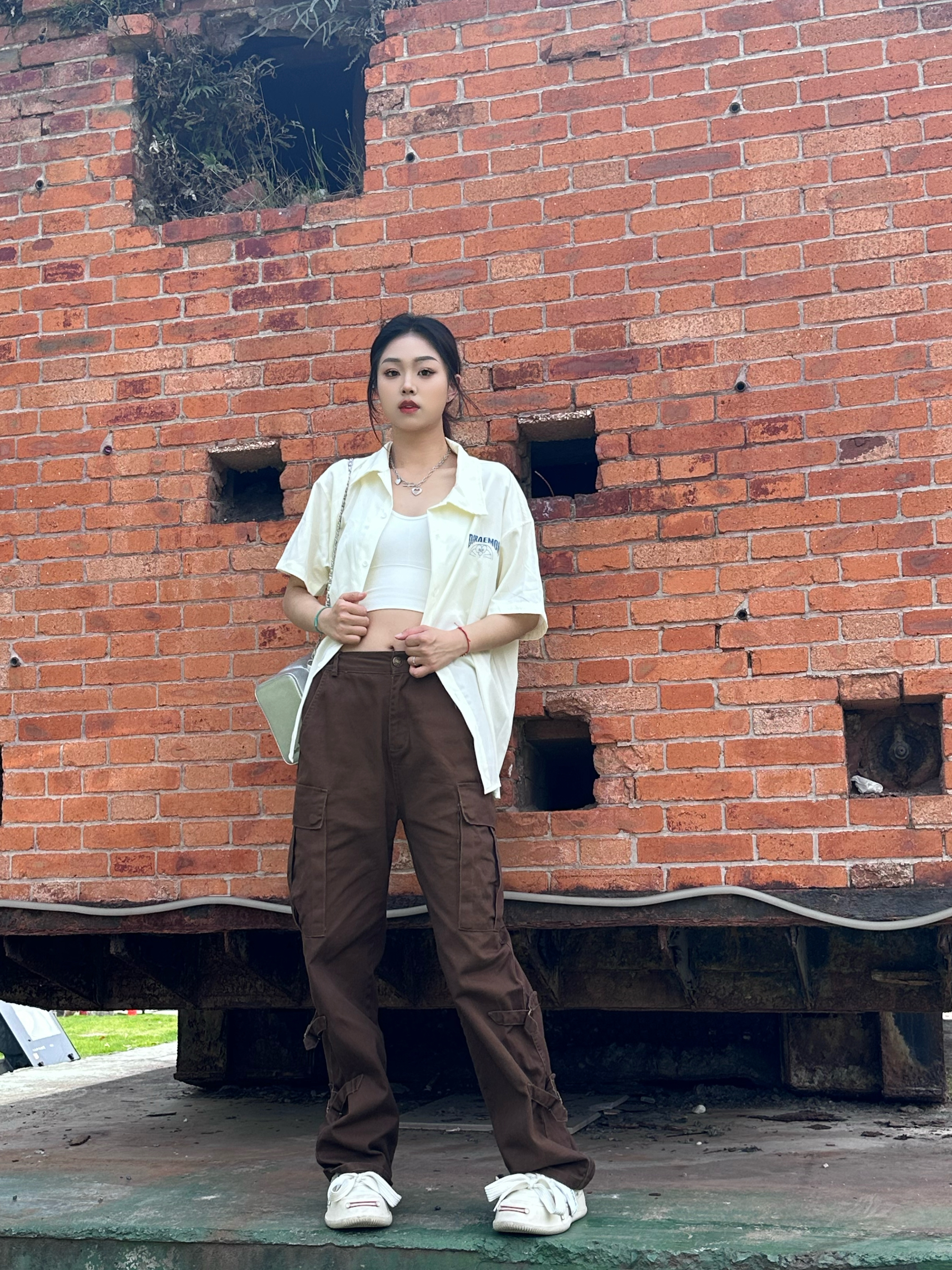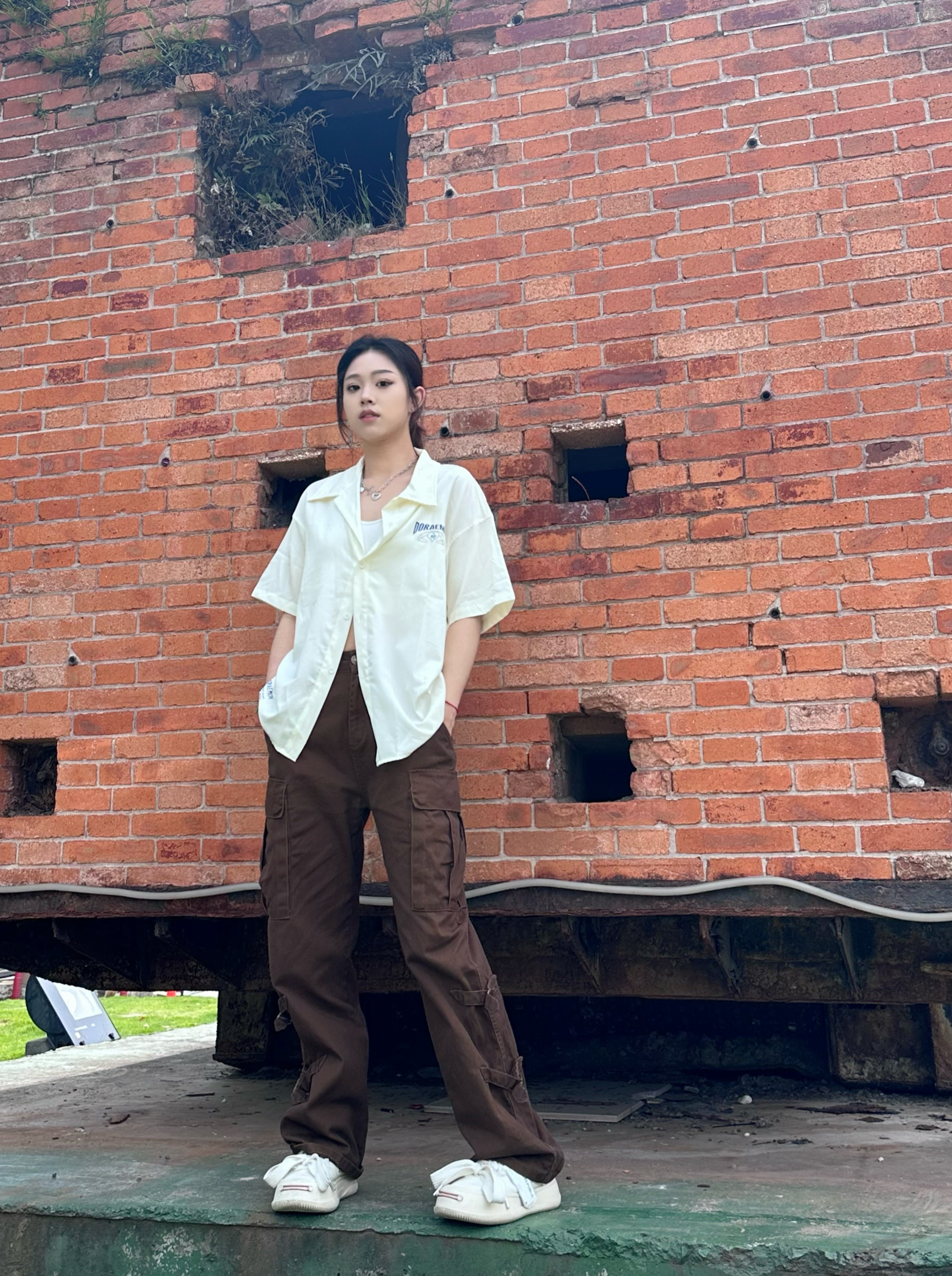 上身一件短袖衬衫 米白色真的很百搭 胸前及背后大面积哆啦A梦印花设计很潮酷 女生做外穿真的很合适✌️