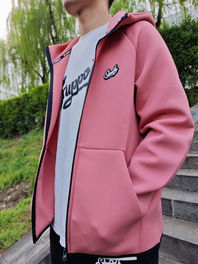 🏖️ 之前被无数博主种草过的一款外套,以为价格很高,最近看得物上架了,69还是能接受的~ · 💒 我入手的是脏橘色,我更倾向于叫它粉色。 · 🌅衣服材质主要为聚酯纤维,透气效果良好,特别适合运动穿,打球前穿它去热身,简直帅翻~ · ☁️尺码不用特意买大,根据尺码表对照即可进行选择~