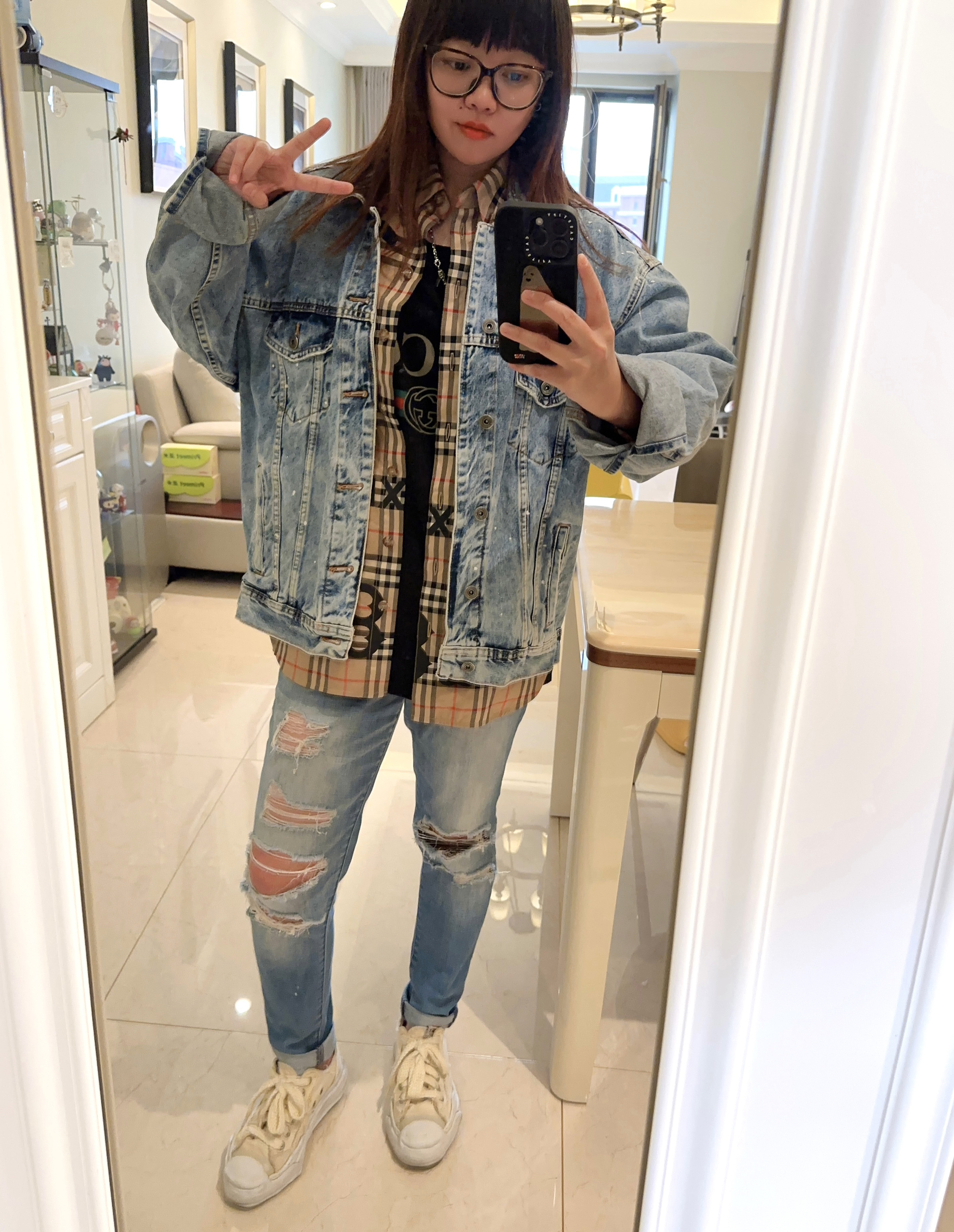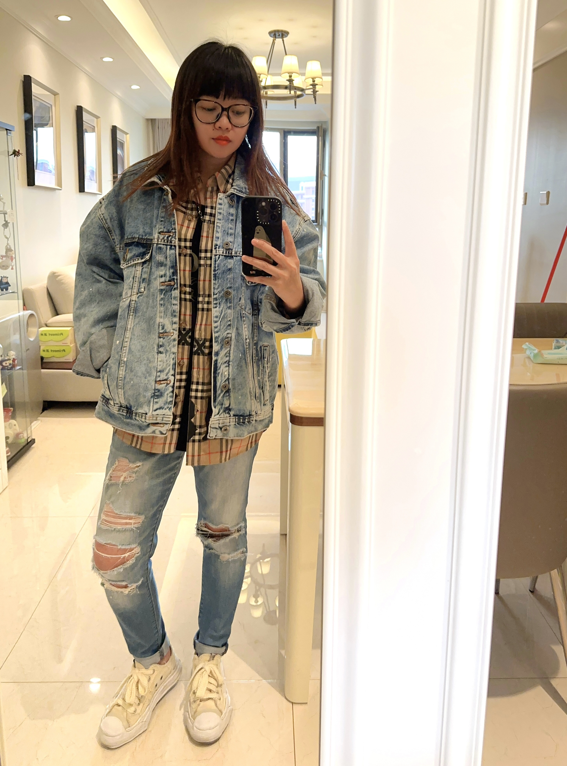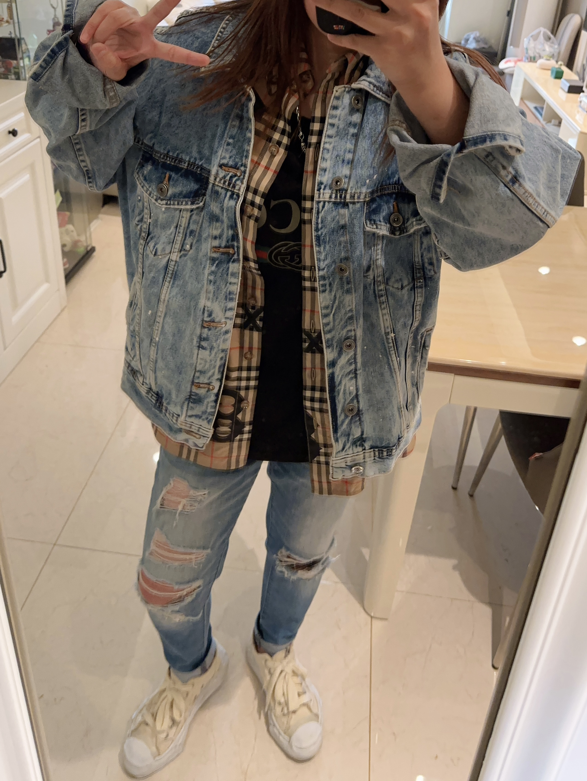 春天出游穿啥呢? 那必须是万能百搭牛仔服➕衬衫啦! 牛仔服我选择的宽松短款,衬衫是细长版型。 叠穿很有层次感。 下身搭配紧身牛仔裤,搭配溶解鞋显腿细哦! 这一身可以说是相当满意了 又保暖又好看,yyds!