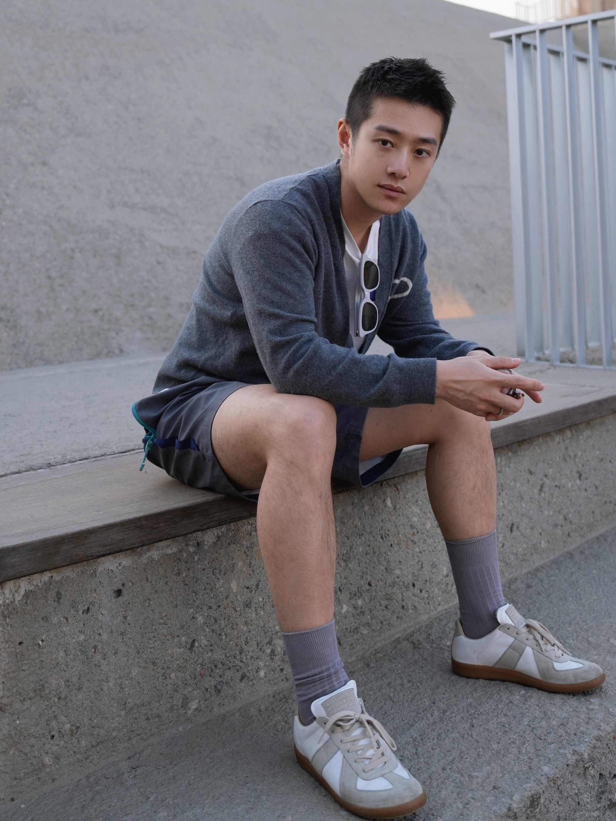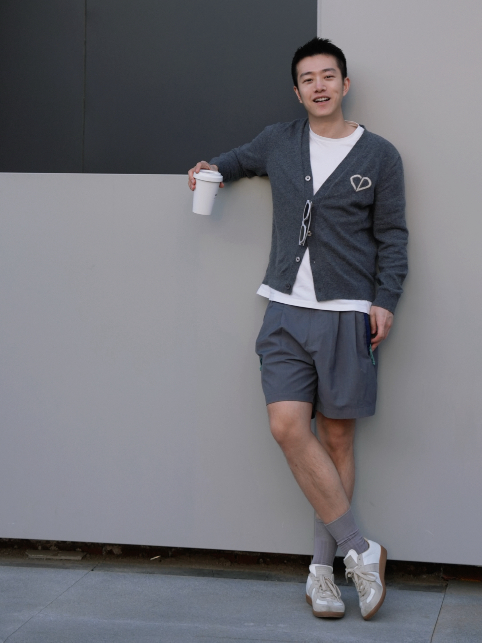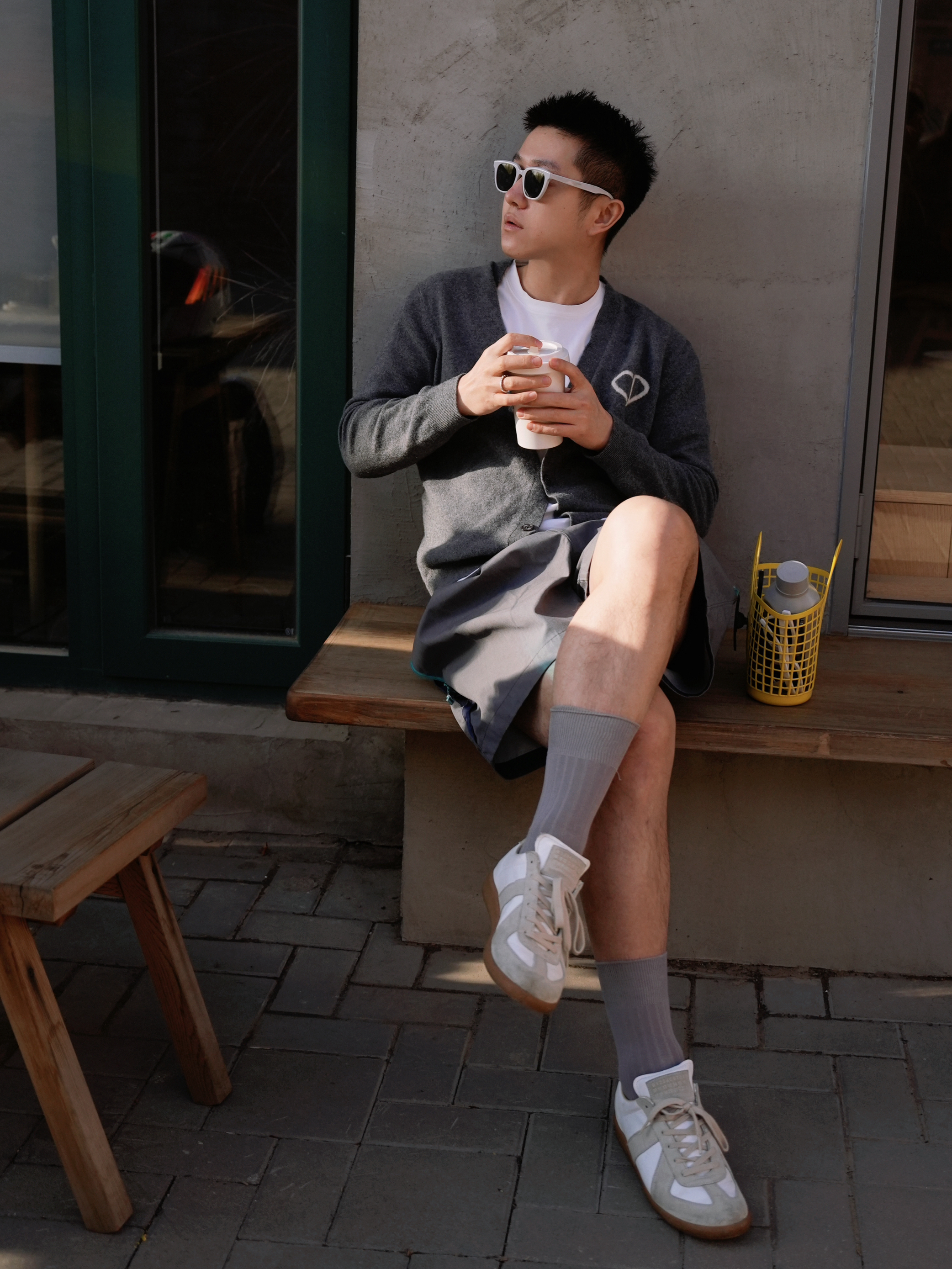 灰色有种莫名其妙的安静,但又充满张力。 灰色的毛衫,灰色的短裤,灰色的袜子,灰色的内裤,灰色的太阳镜,灰色的近视镜,灰色的充电宝! 里面穿了件白T,看起来有层次感一些。经典的灰白配色的德训鞋,也是万能搭配。 身高|体重:178/68 🧍♂️ 穿搭风格:春日休闲 👔 上衣: 👖 下装:Kolor beacon 👟 鞋子:Maison Margiela 🕶️ 墨镜:GENTLE M...
