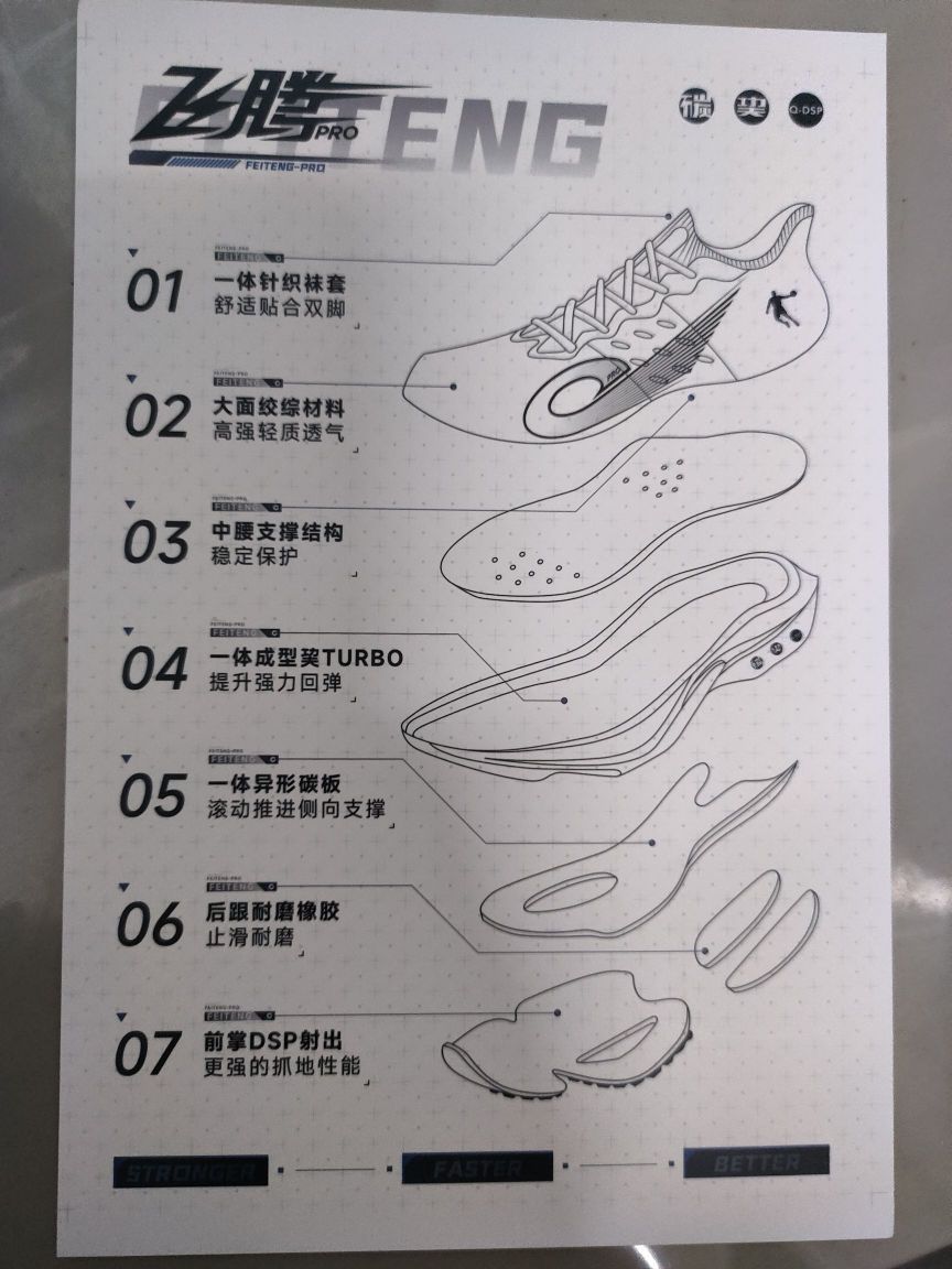👟球鞋名称:飞腾pro 📌是否偏码【偏大/不偏码/偏小】:正常 ⛹️性能打分(每项满分均为10):8-9 包裹:强 缓震:缓震效果不错 抓地:前掌碎钉,抓地很强 稳定:稳定性良好 透气:很透气,网状的 重量:很轻很轻 📖总结评价:场地竞速,包裹性强,上脚脚感不错,感觉比多威战神3pro好一点,由于是刚到,还没上跑道,目前感觉很不错,中乔值得信赖