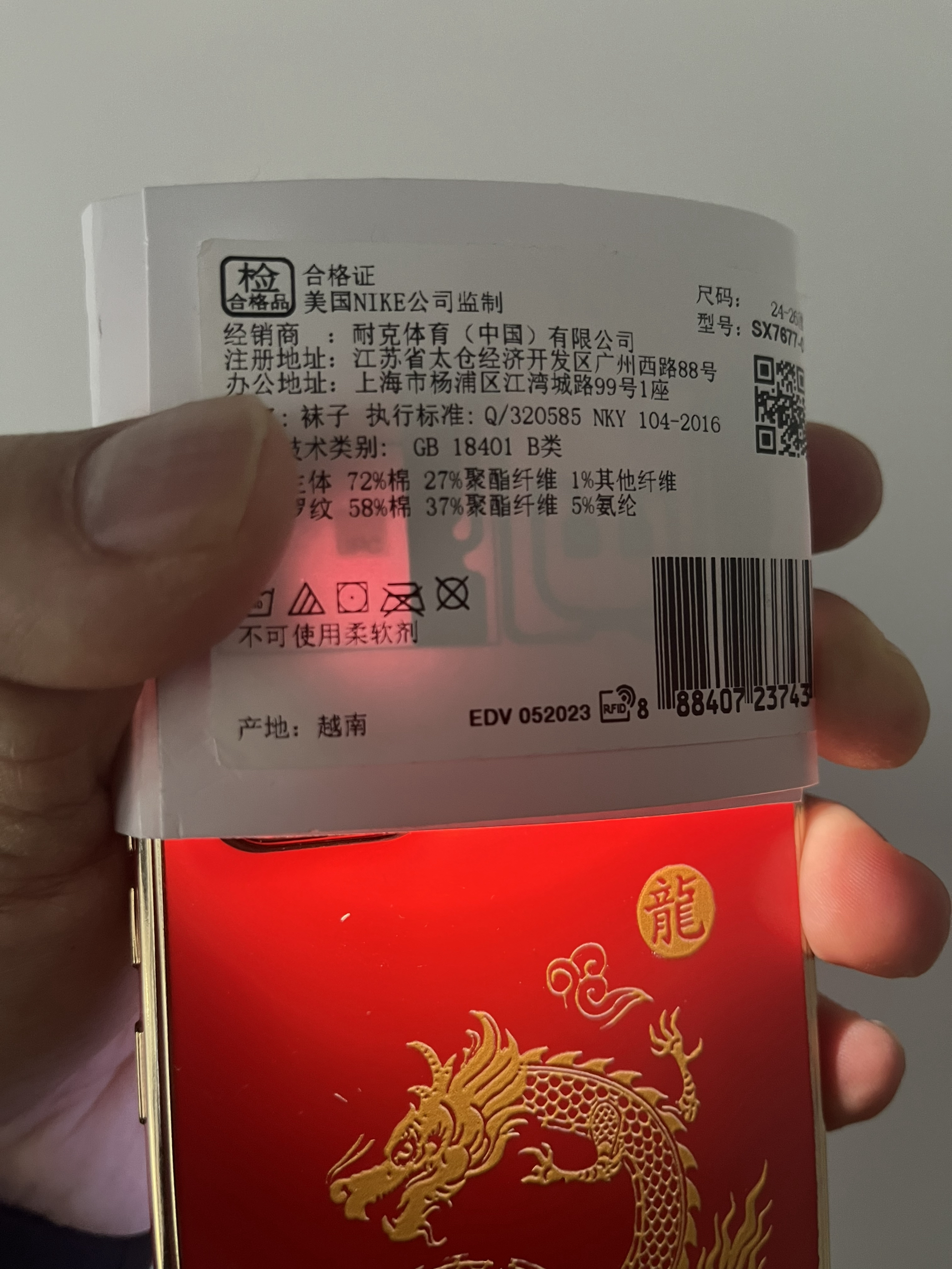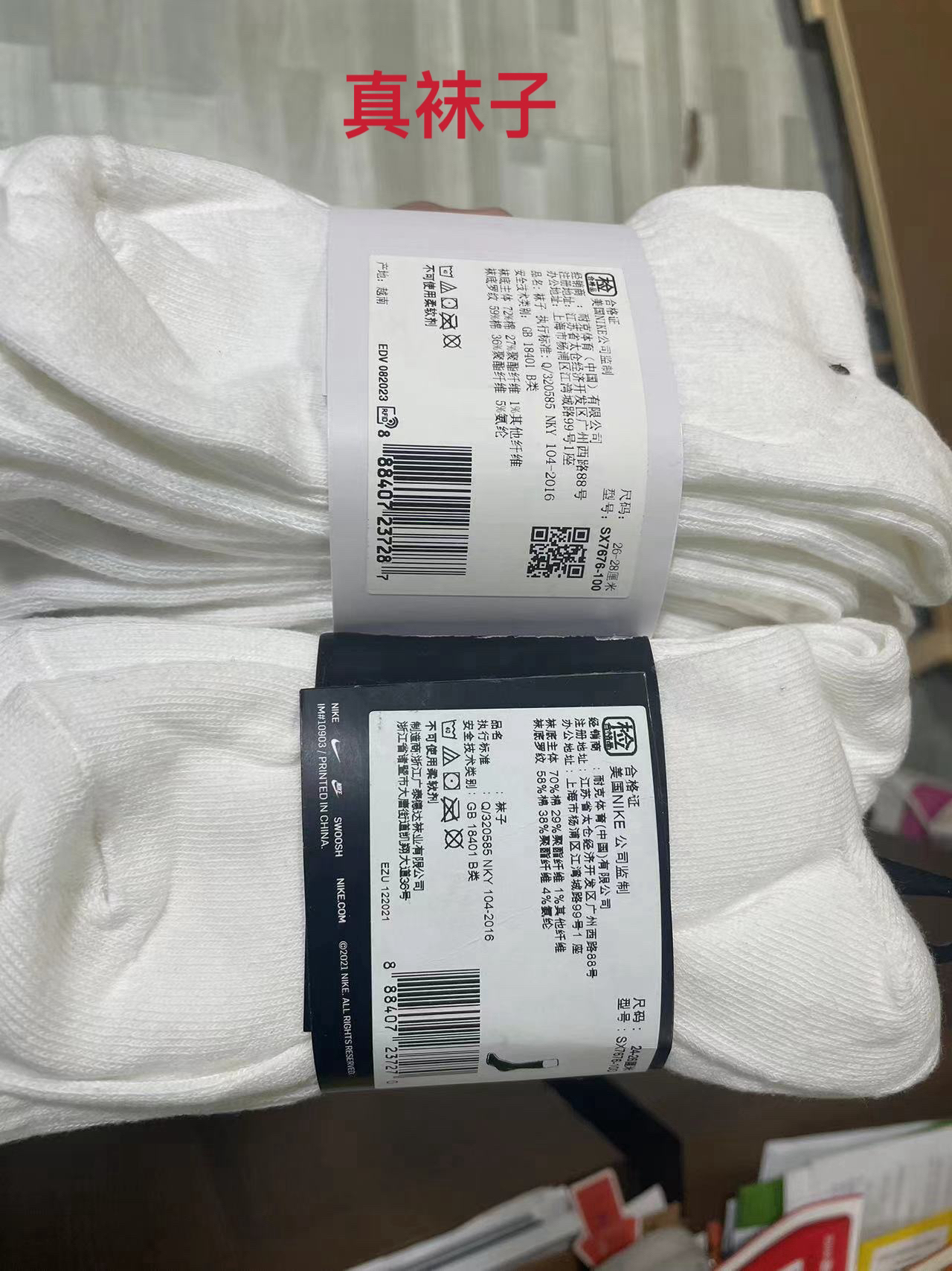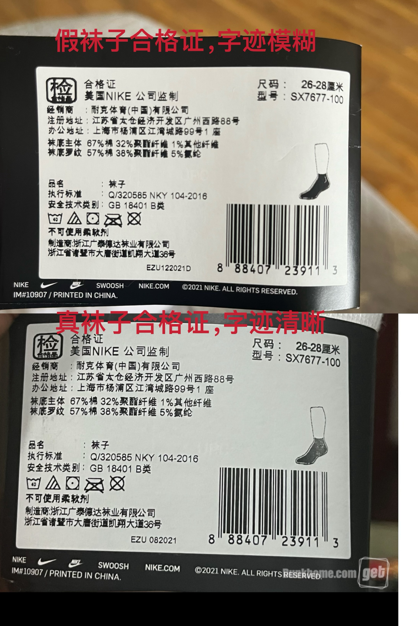 袜子虽然是个小物件,关注人不多!但往往就是因为关注人忽略,市面大量假袜子出现,不少花了正价钱买到的确是假袜子!目前市面上黑卡的袜子正品流通基本很少,由于黑卡袜子防伪差已经被白卡取代,但目前市面流通大量黑卡假袜子。目前白卡袜子是市场主流,正品白卡,带二维码还含芯片,同时正品白卡字体也是特殊的!买到白卡袜子,可以打灯自行看看有没有芯片,同时再对比下字体!这就是分享跟大家一种最直接、简单判断!