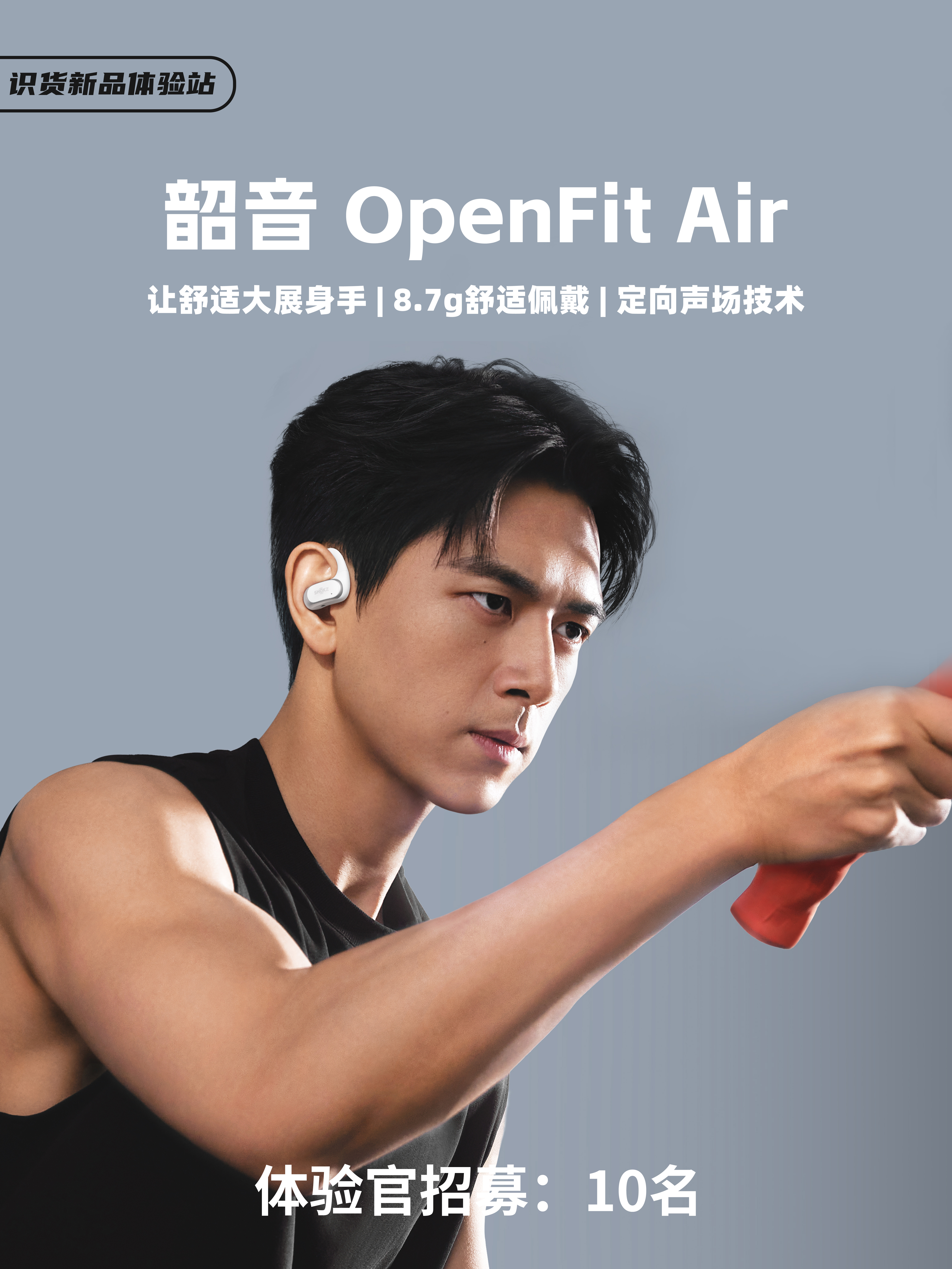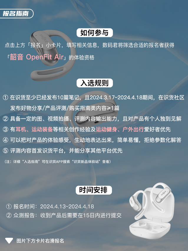 👆 点击报名按钮,招募体验官免费用! 🙂 招募名额:10名 🎧体验产品:韶音OpenFit Air ⭐【产品特点】 ① 不入耳设计,实时感知周围环境音,舒适又安心 ② DirectPitch™定向声场技术,精准高效传声,听音更私密 ③ 首创空气式耳挂,自适应不同耳形,软弹服帖。单只耳机仅8.7g,轻盈无感 ④ 柔性钛丝耳挂,适配不同耳型佩戴需求,戴眼镜佩戴也舒适 ④ 10分钟充电,使用2小时,...
