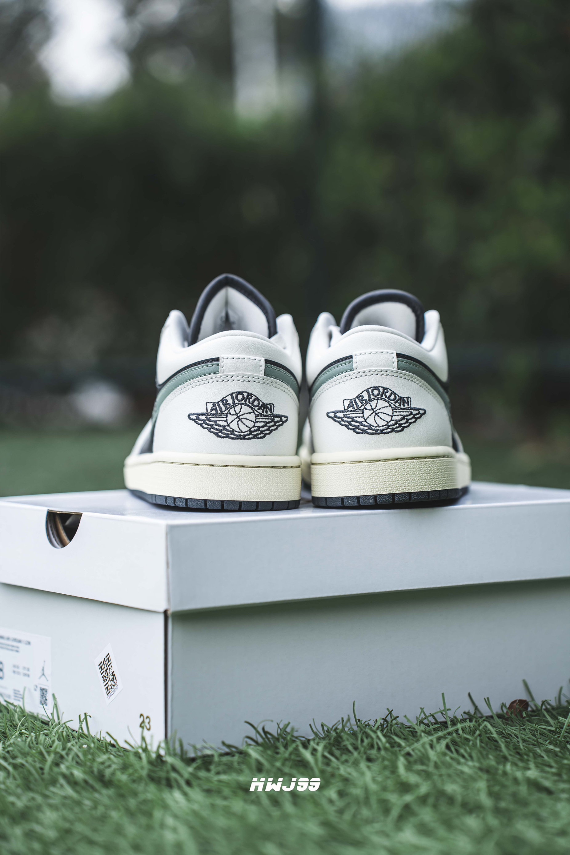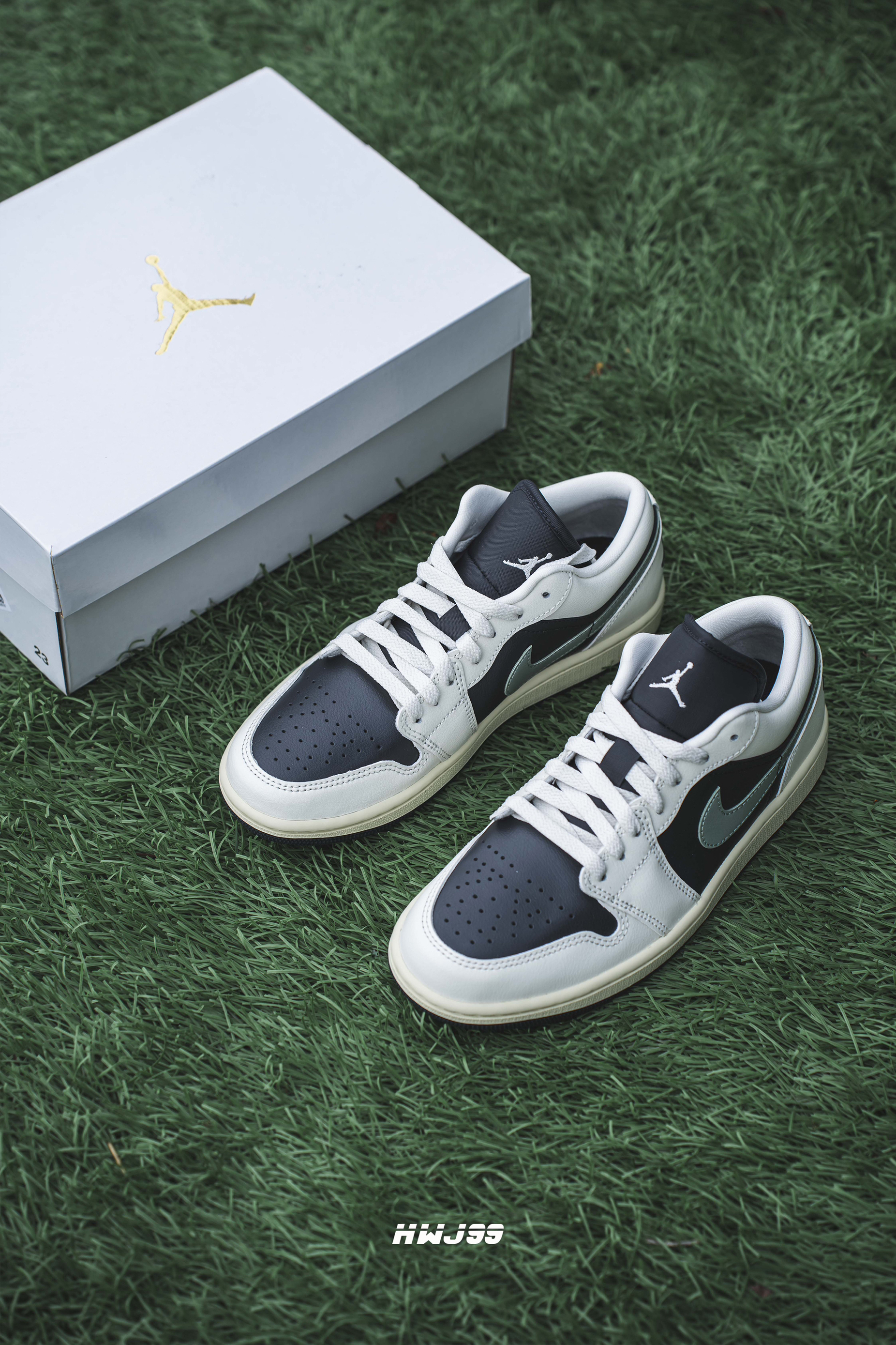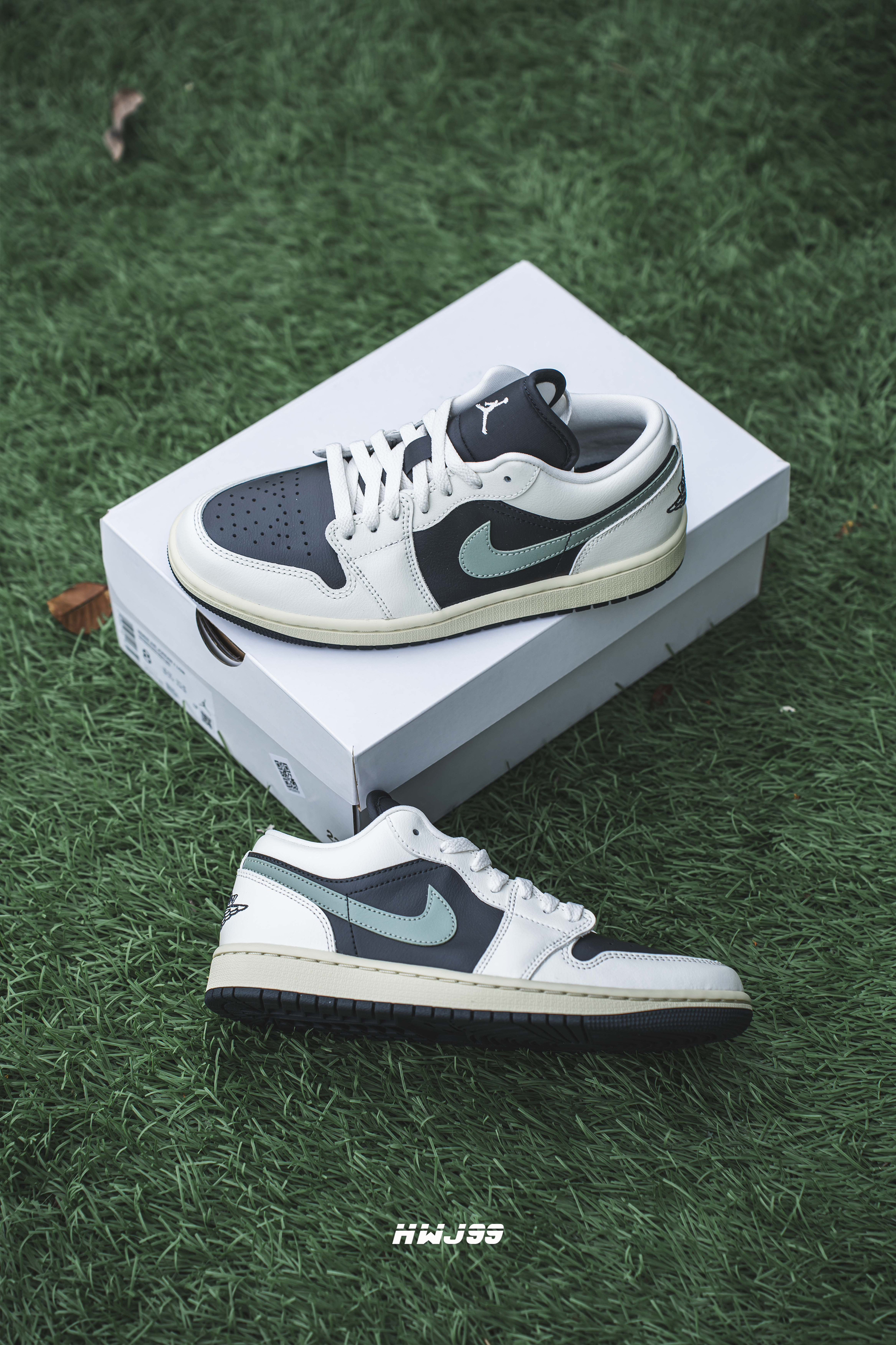 如果你最近正在寻找一款踏春高颜板鞋 那么今天分享的这款 不要错过哈 这款AJ 1 Low 黑绿配色颜值真的很高 鞋子的底色和大底采用了黑色 两侧的钩子也是用到了淡绿 鞋面和中底分别是奶白和氧化黄 整体配色和谐又耐看 后跟的飞翼标则是采用了刺绣工艺 整体给人的感觉复古味道很浓厚 上脚的颜值很在线!