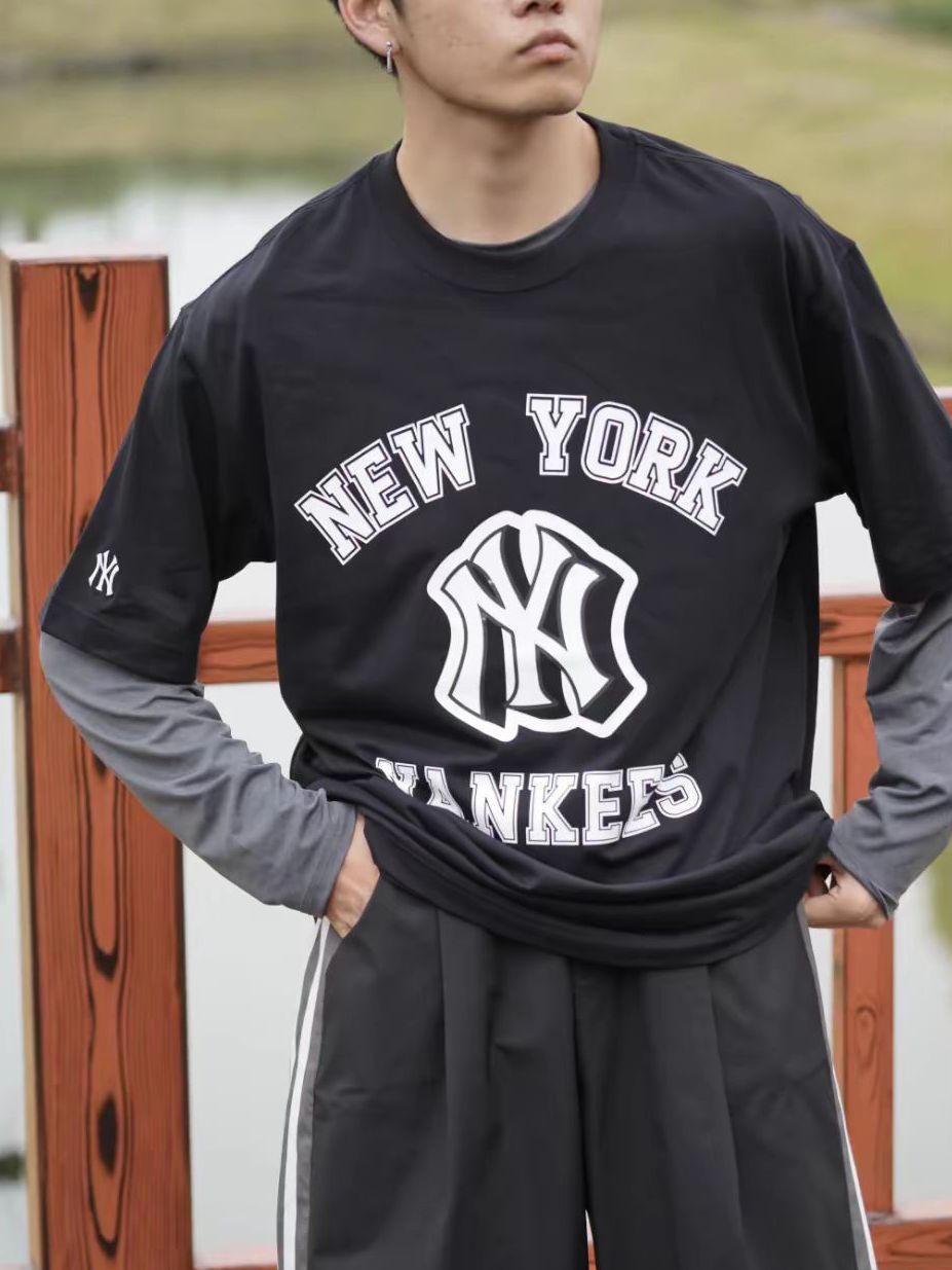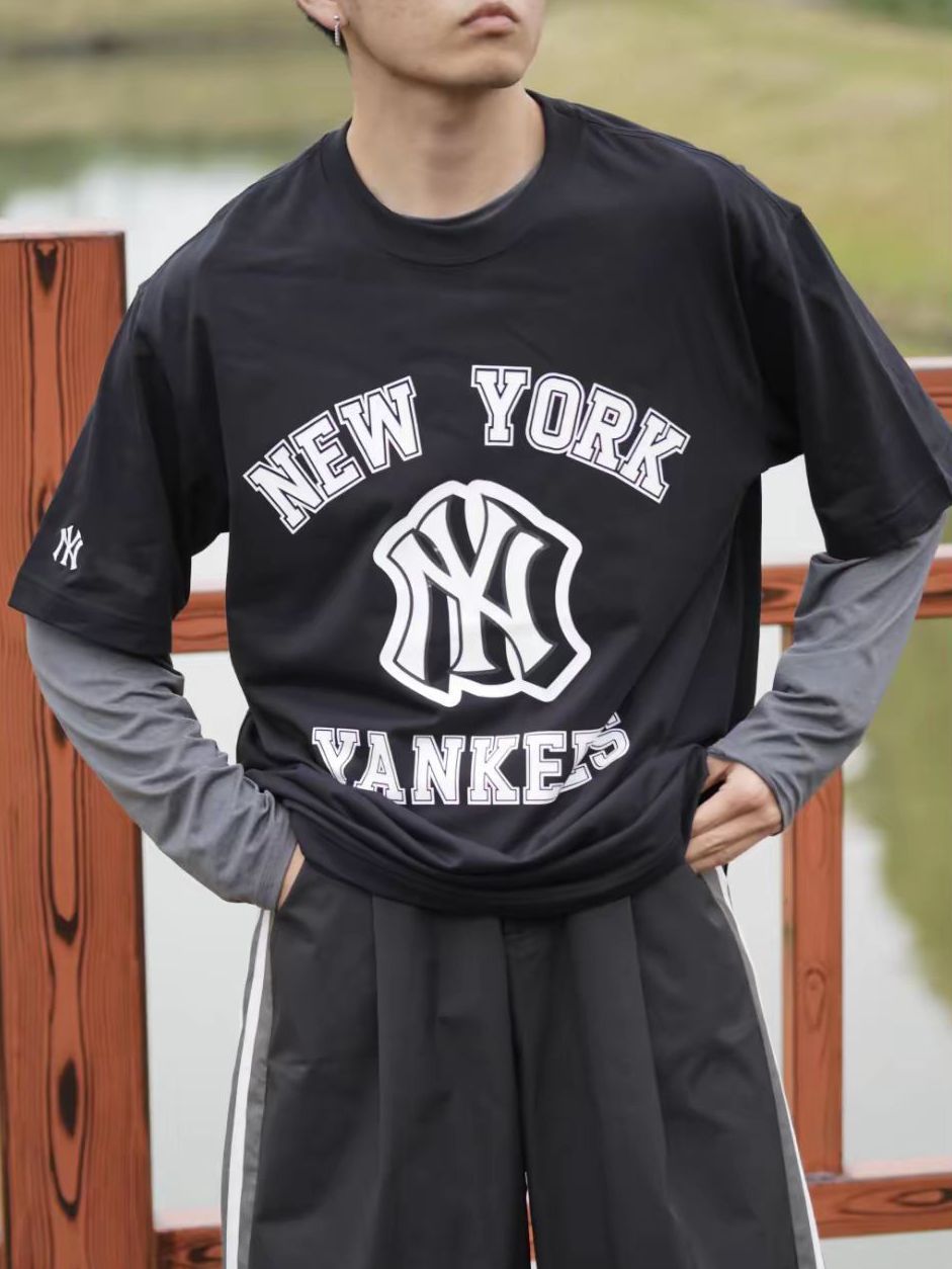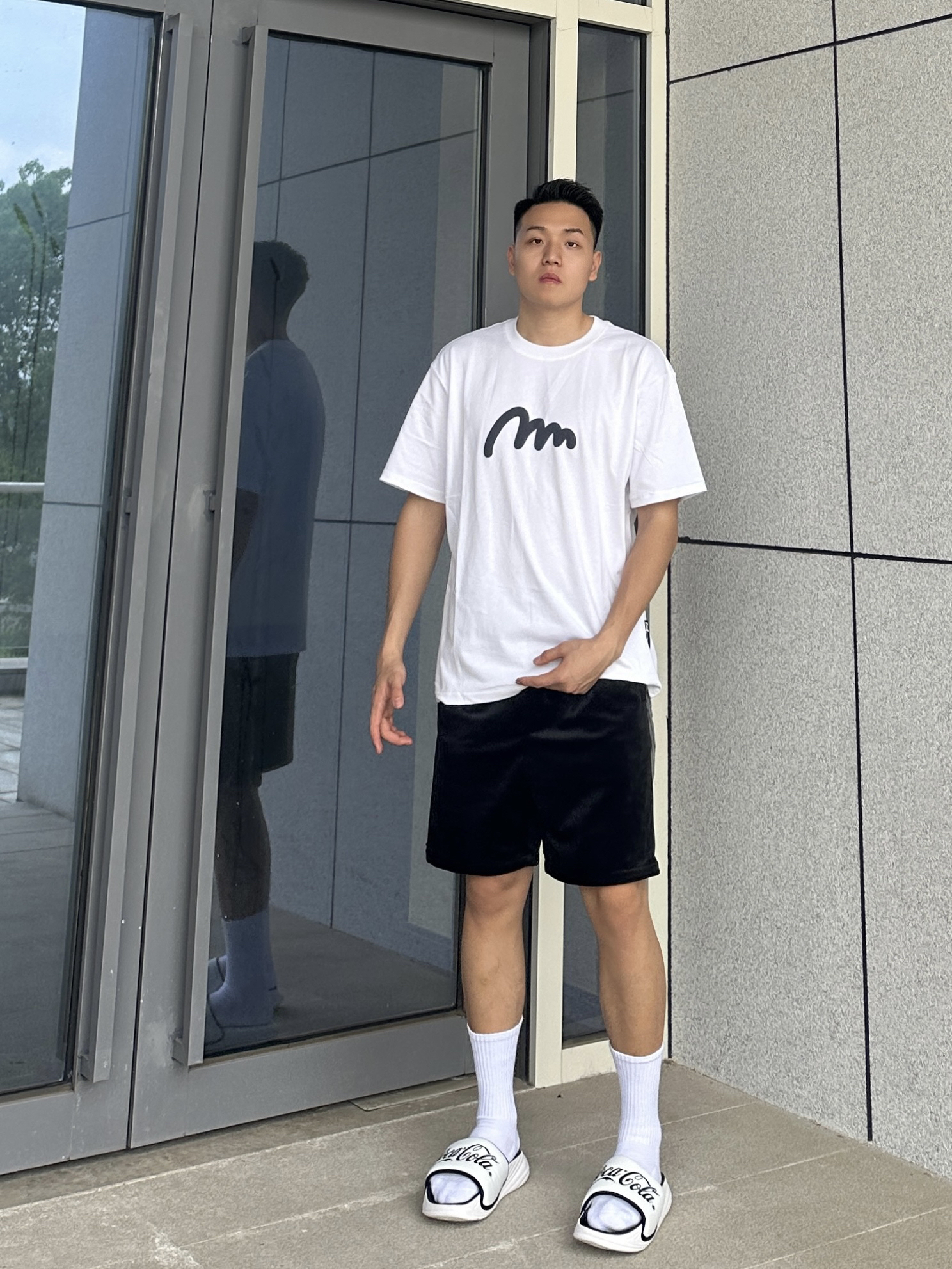 T恤永远是夏日百搭王者 这款T恤属于比较常规的款式,印花也是比较寻常logo的款式了 寻常的常规T恤,可以采用叠穿的方式穿出不一样的感觉,比如内搭长t 下装选择同样黑色的运动裤,一体就比较显瘦了! 图源网络侵删图源