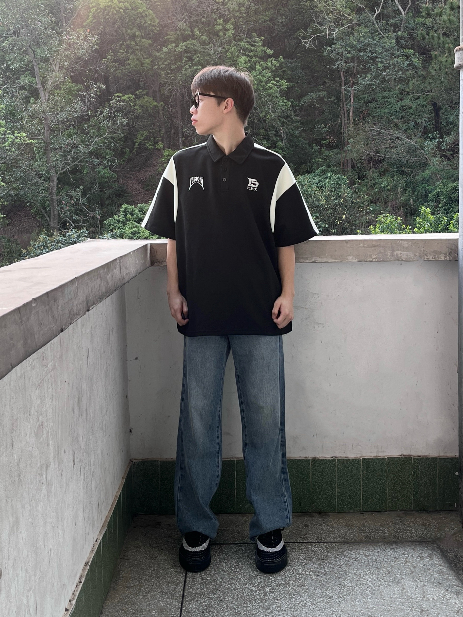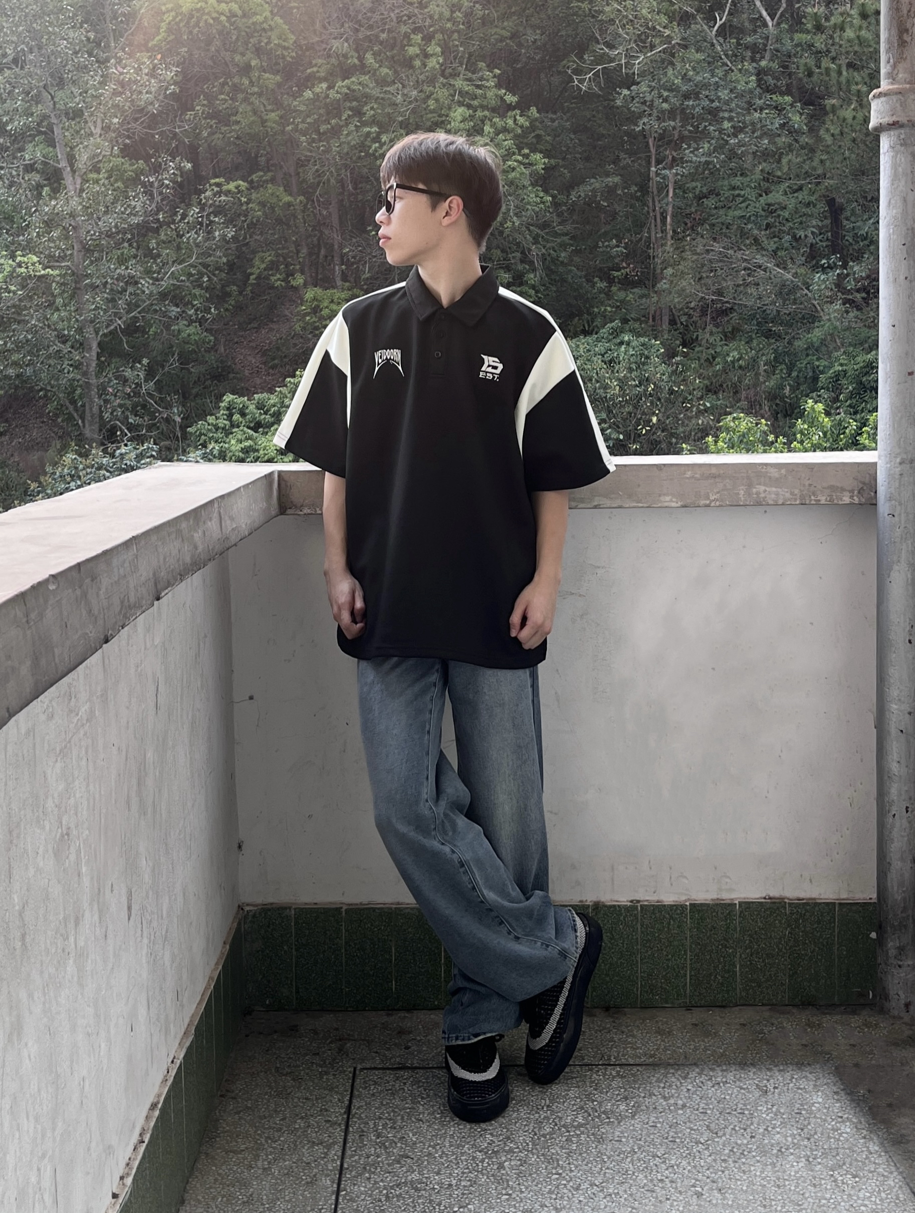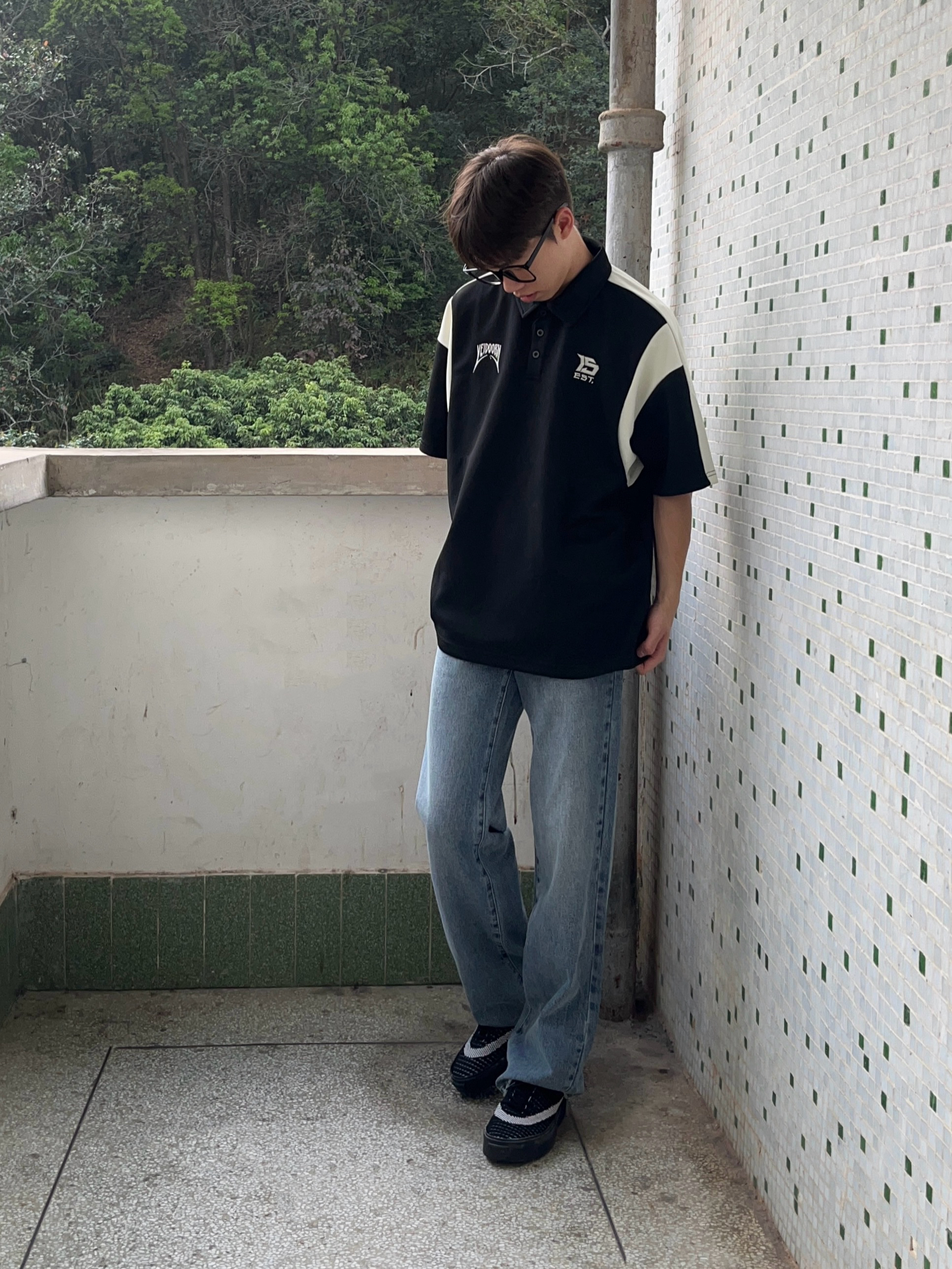 春日出走穿搭分享look👀 衣服是 维动 VEIDOORN 的极夜黑配色休闲polo衫 颜值简约时尚 背后的字母印花设计潮酷风十足 搭配上一条蓝色水洗风牛仔裤修饰腿型 版型直筒又显瘦 最后黑色飞织板鞋点缀 一套下来 春日出走轻松驾驭美式风