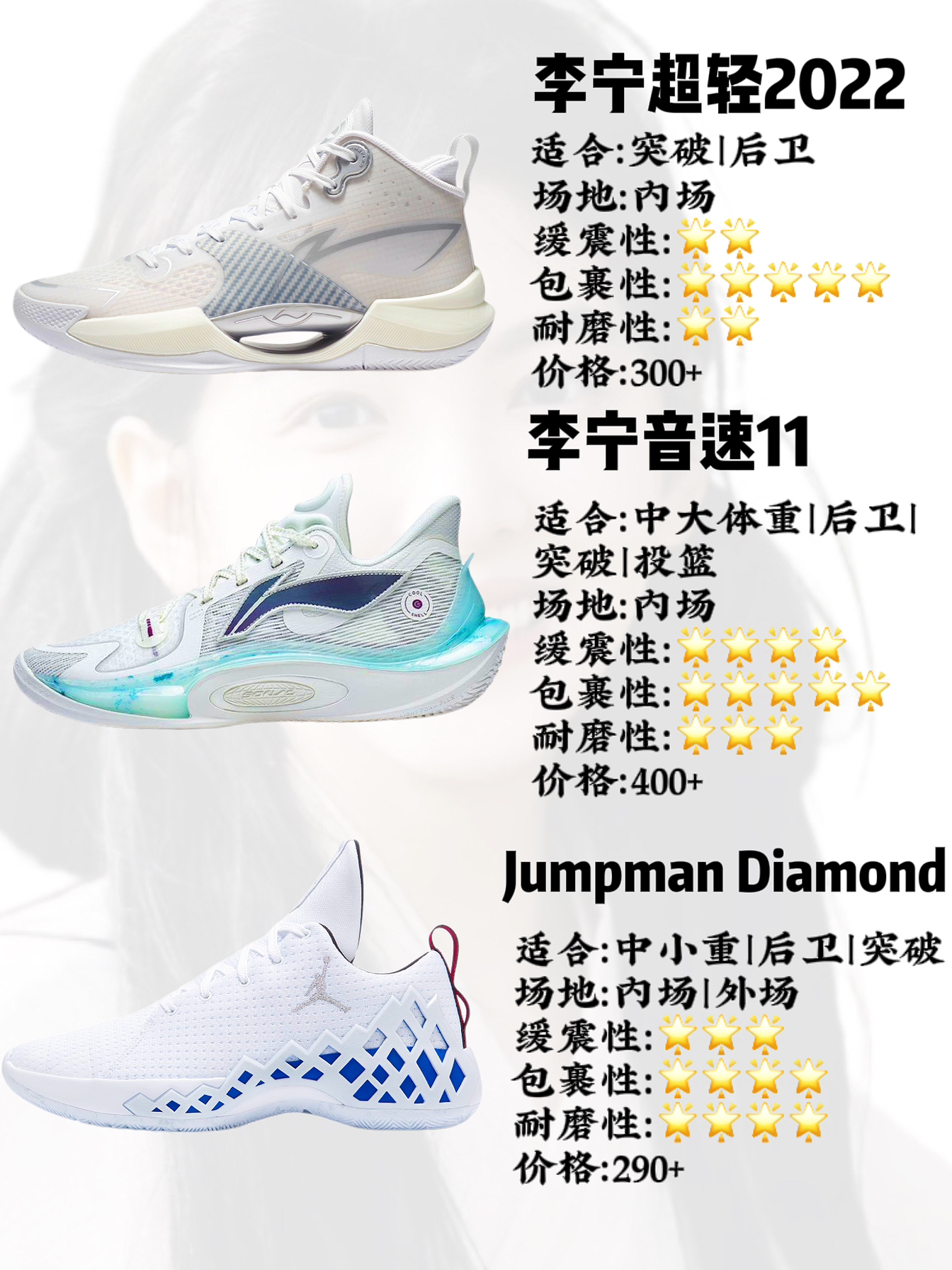 本篇笔记关联了Jordan Jumpman Diamond 耐磨防滑 缓震实战 篮球鞋 白色/蓝红鸳鸯、李宁 韦德之道 全城11高回弹 轻量 透气 防滑耐磨 实战 篮球鞋 绽放、李宁 超轻V2 篮球鞋 䨻科技防滑耐磨缓震高回弹舒适透气轻量支撑简约 白色等商品,为用户提供真实的使用体验和购买参考。