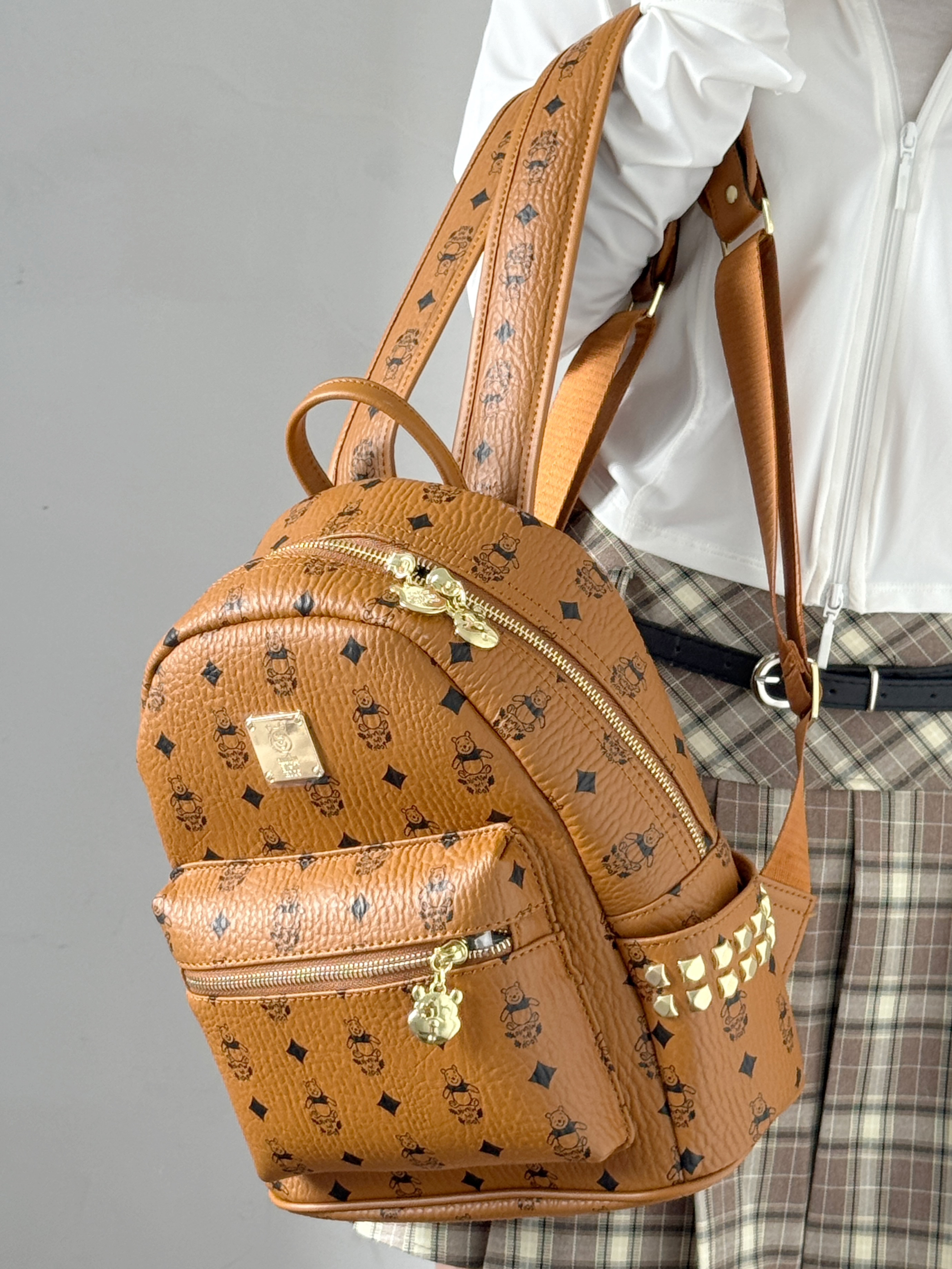 满印的小熊维尼也太可爱啦 PU皮革好有质感💗 金闪闪的柳钉装饰好好看~ 复古感直接拉满了 而且容量好大好能装呀 太适合日常通勤和旅游背啦✌️