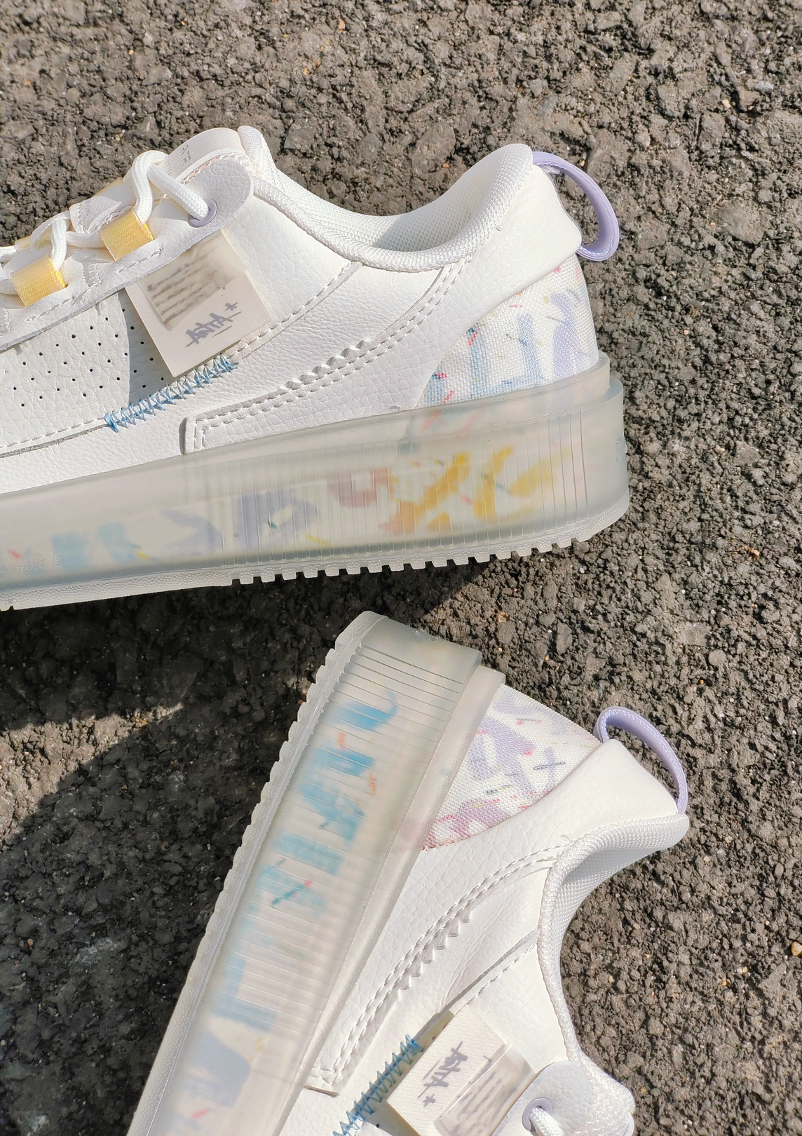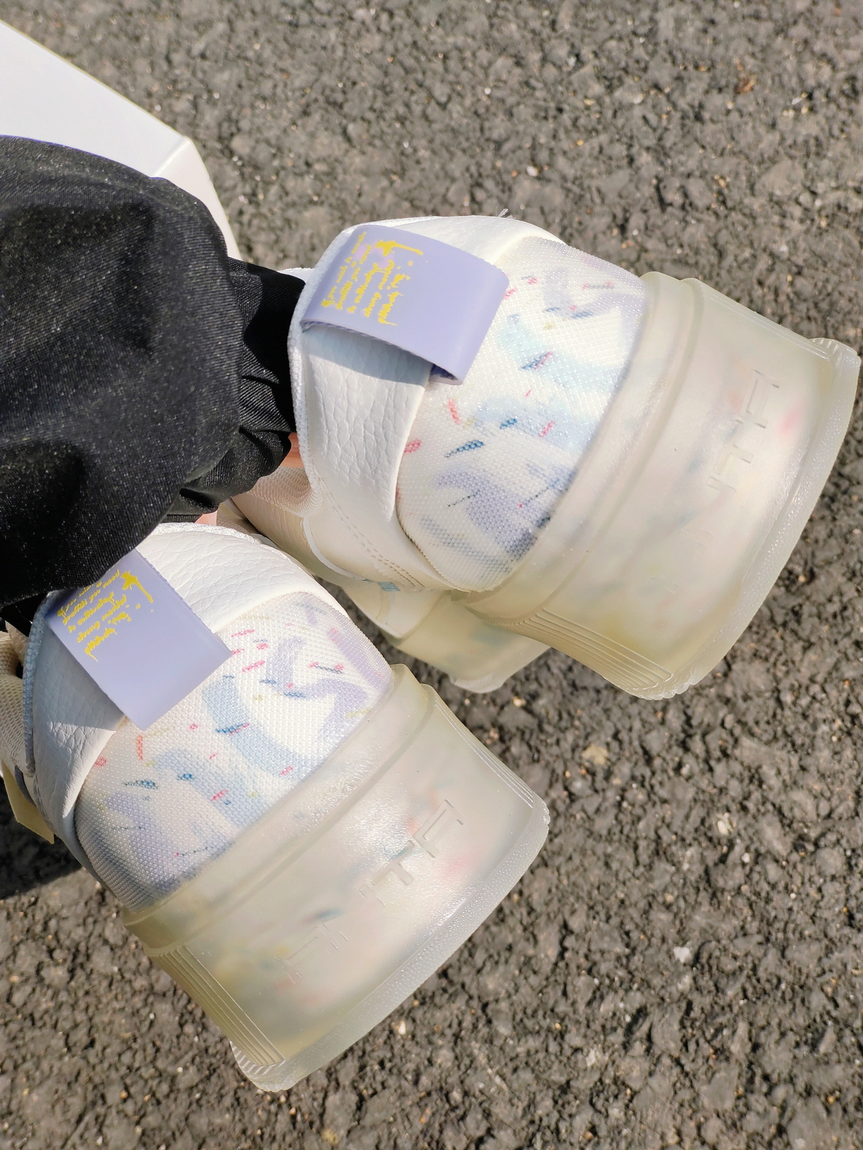 是水晶底的板鞋诶,而且鞋底还有图案,经典的小白鞋设计很好穿搭哦 鞋上有零星的小色彩点缀不至于那么单调,开学好鞋又找到啦 唯一的不足是水晶底虽然好看,但是太容易氧化了