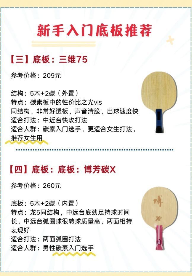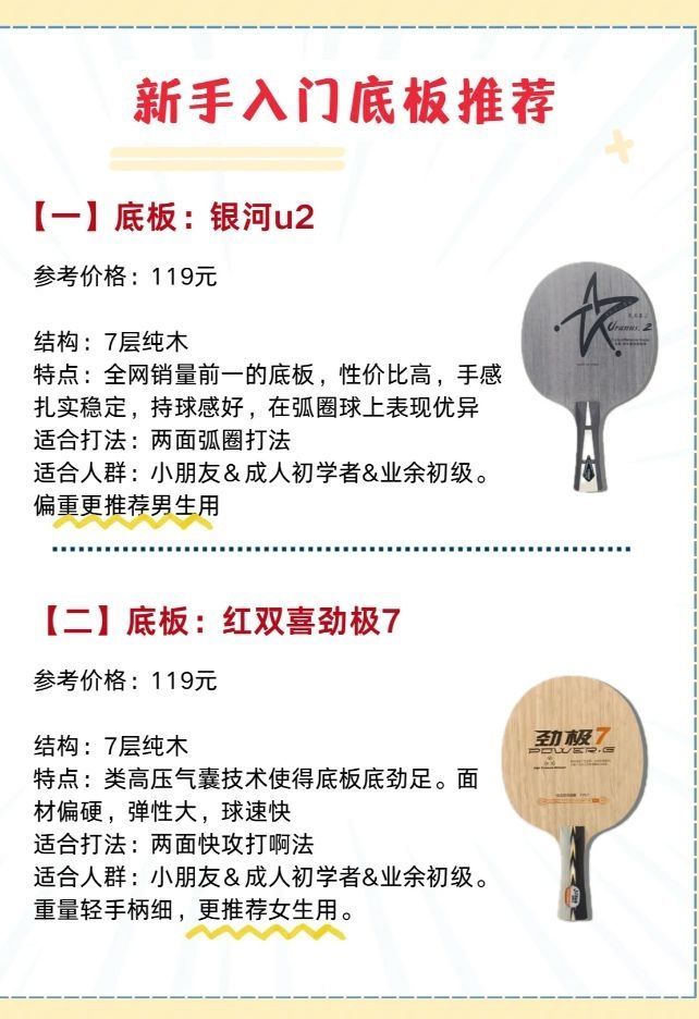 乒乓球底板还不会选? 新手小白选纯木,价格便宜,手感清晰。 小力量选手选外置和碳素,硬弹的底板能够放大球速,大力量选手选内置,发力汹涌澎湃!