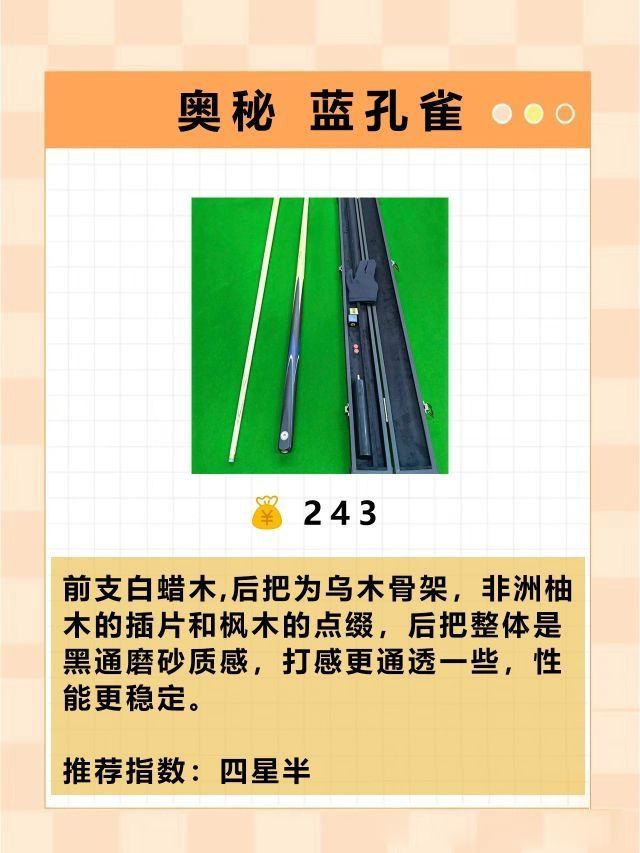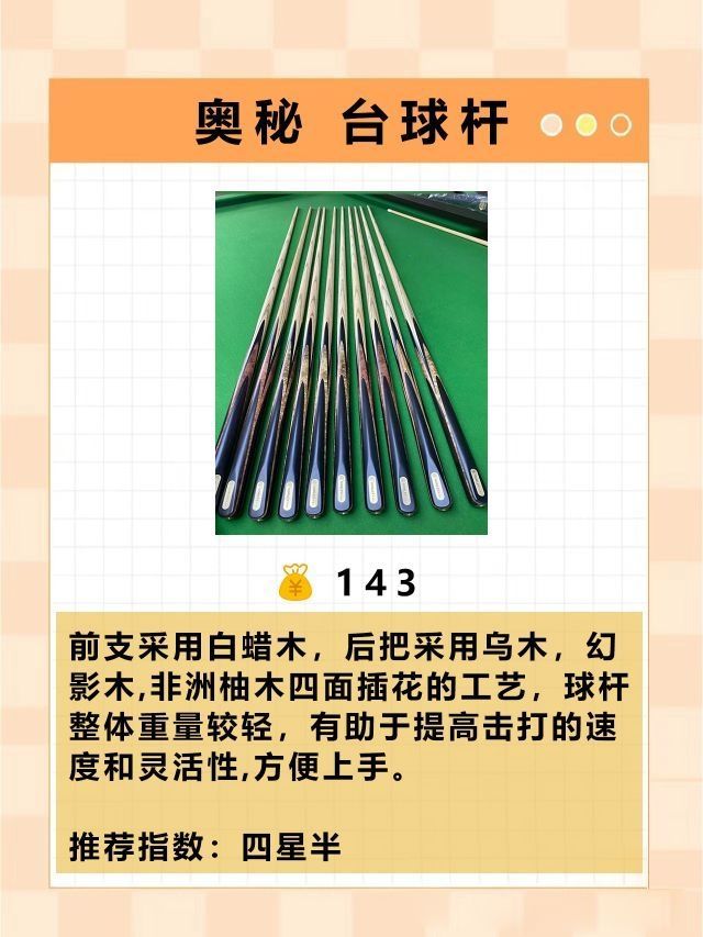 本篇笔记关联了O'MIN/奥秘 冰刃系列 中式 黑八 斯诺克 美式 九球 英式 小头 中头 台球杆 分体球杆、O'MIN/奥秘 伏虎系列 八球 美式 黑八 九球中式 硬枫木 结实 耐打 精准迅速 耐用 桌球杆 大头杆 台球杆 黑色分体、O'MIN/奥秘 蓝孔雀 黑八 英式 斯诺克 八球 中头 小头杆 台球杆 通杆等商品,为用户提供真实的使用体验和购买参考。