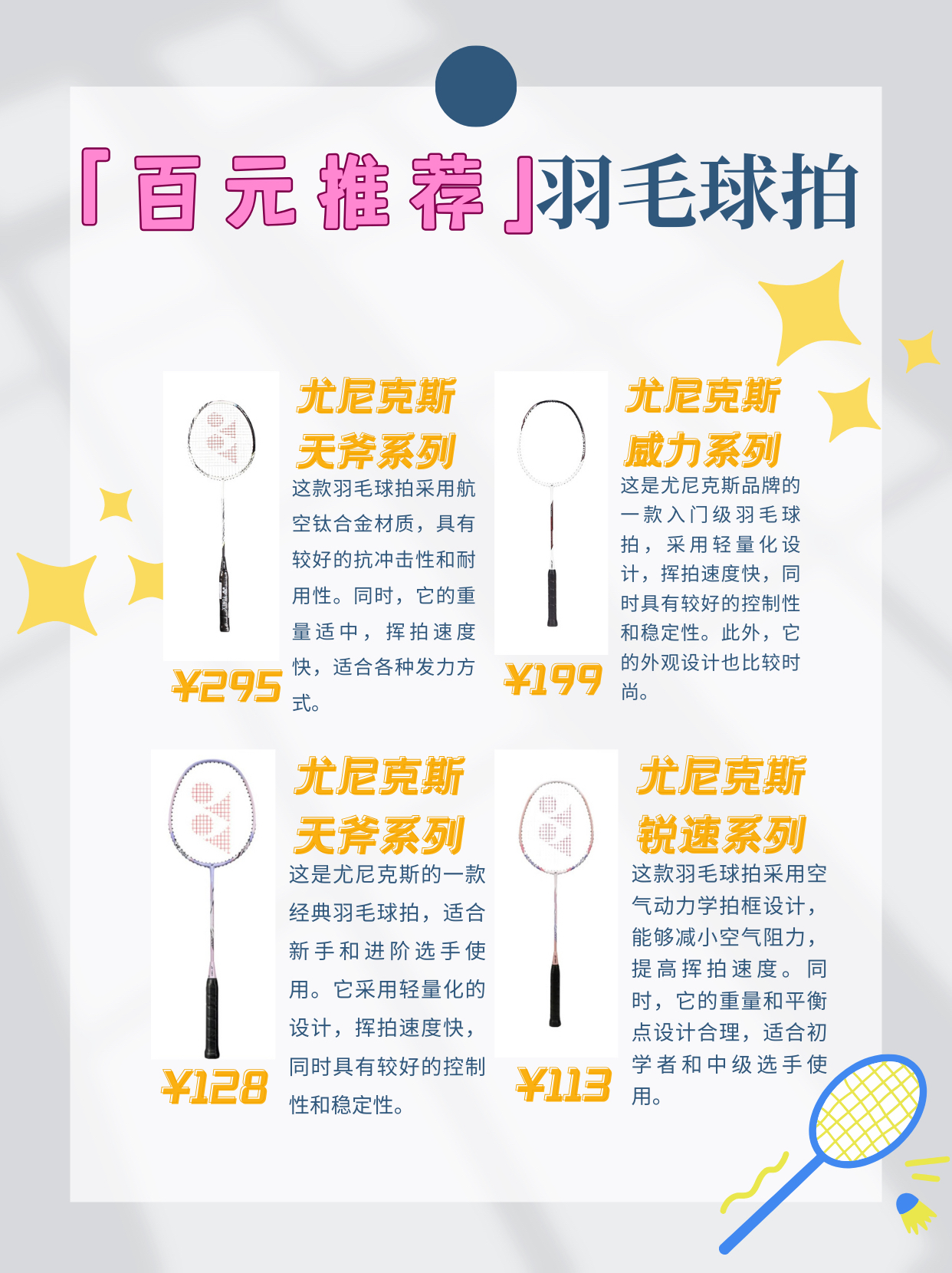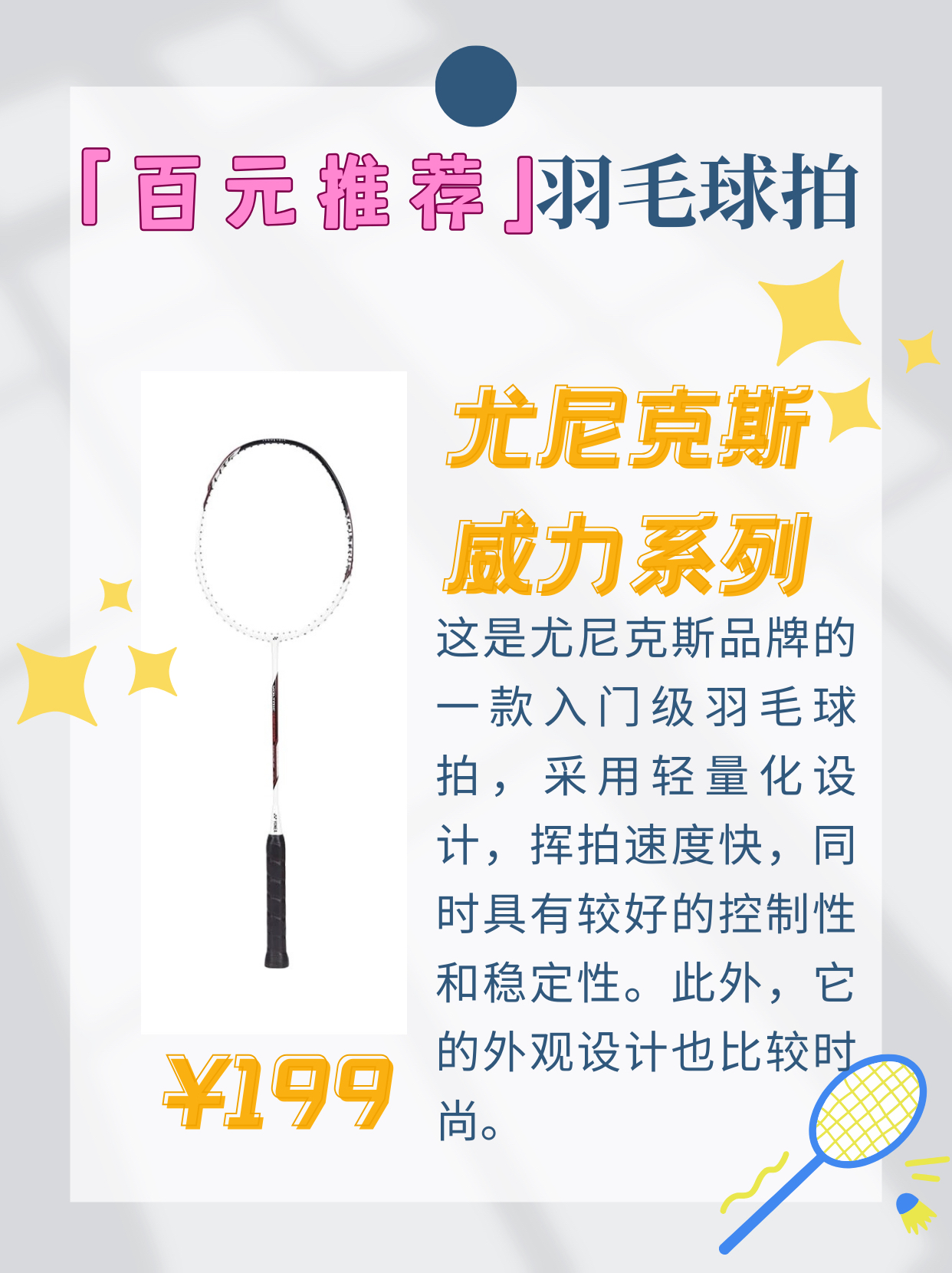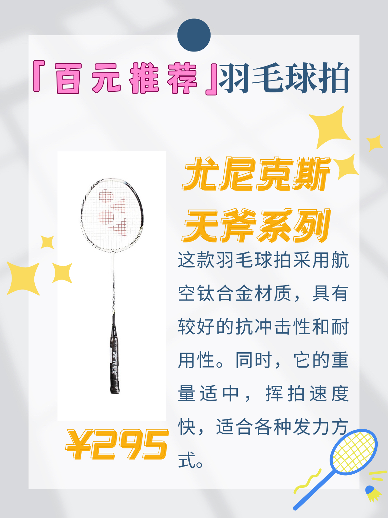 本篇笔记关联了YONEX/尤尼克斯 天斧系列 AXSMGE 白虎纹 专业级 进攻型 速度型 攻守兼备 易上手 耐用型 拍头重 杆硬 耐打 全碳素纤维 羽毛球拍 黑冰蓝、YONEX/尤尼克斯 威力系列 VTPWSR 超轻耐用 入门级 进攻型 耐打 全碳素 羽毛球拍 白黑色、YONEX/尤尼克斯 天斧系列 AX99PLAY 进攻型 速度型 耐打 入门级 全碳素纤维 防滑灵活 高弹性 耐用型 杆硬 拍头重 羽毛球拍 白虎纹等商品,为用户提供真实的使用体验和购买参考。