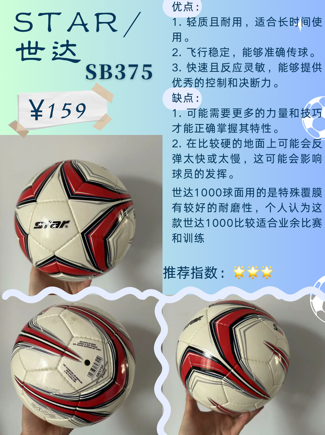 本篇笔记关联了STAR/世达 1000系列 SB375 SB374 耐磨 防水 耐用 训练 脚感 班级 体考 比赛 手缝 PU 真皮 足球 SB375、STAR/世达 2000 SB225 真皮脚感 耐磨 比赛 训练 无缝热粘合 PU 足球 白蓝色、KELME/卡尔美 8301QU5085 亚洲杯系列 青训 中考专用 耐磨 中小学生 无缝热粘合 PU 足球 白红等商品,为用户提供真实的使用体验和购买参考。