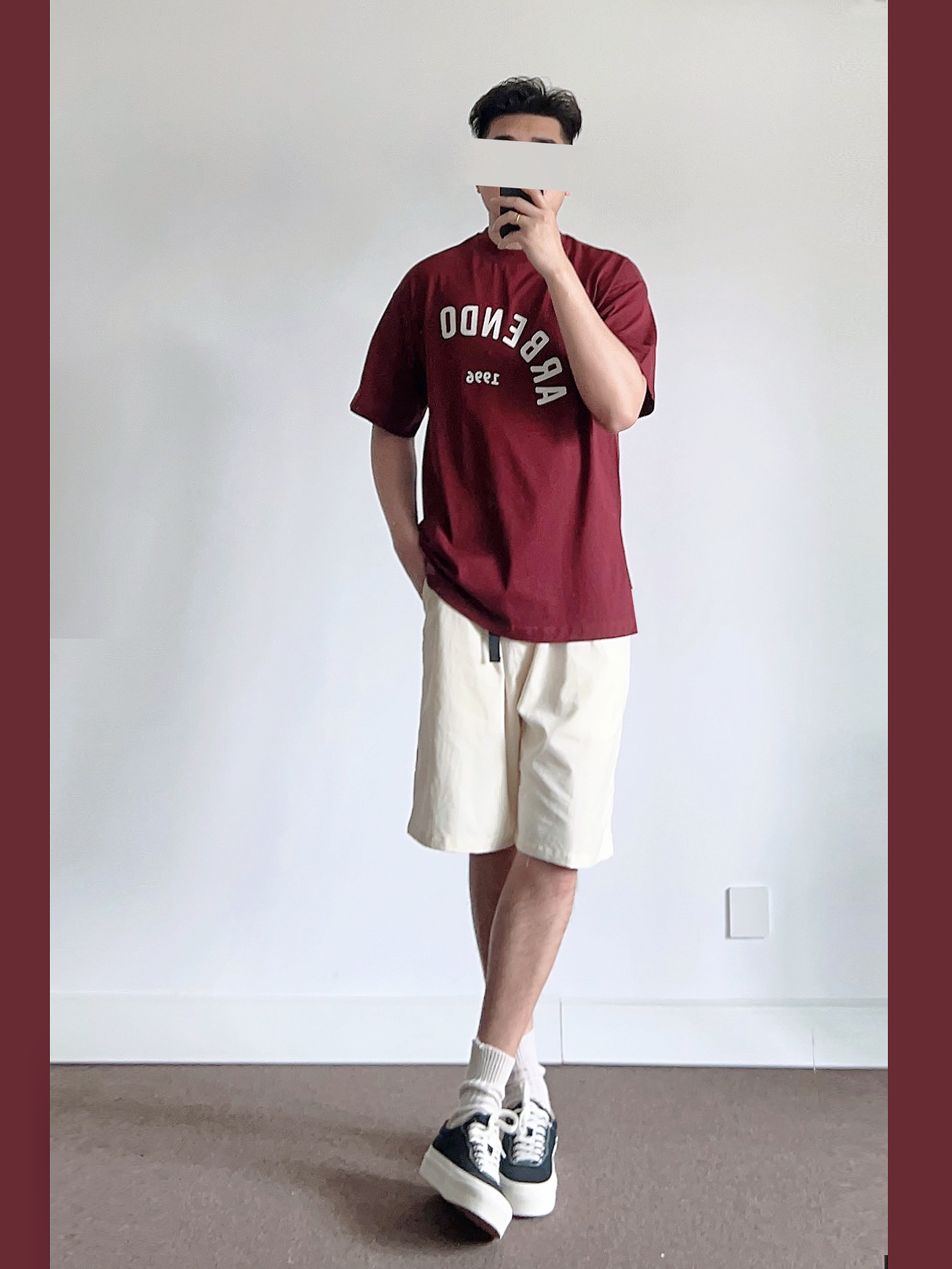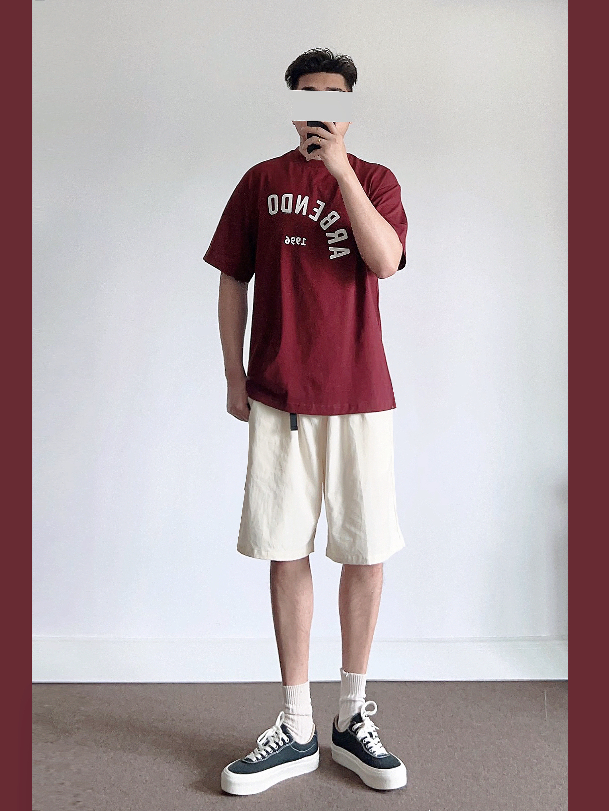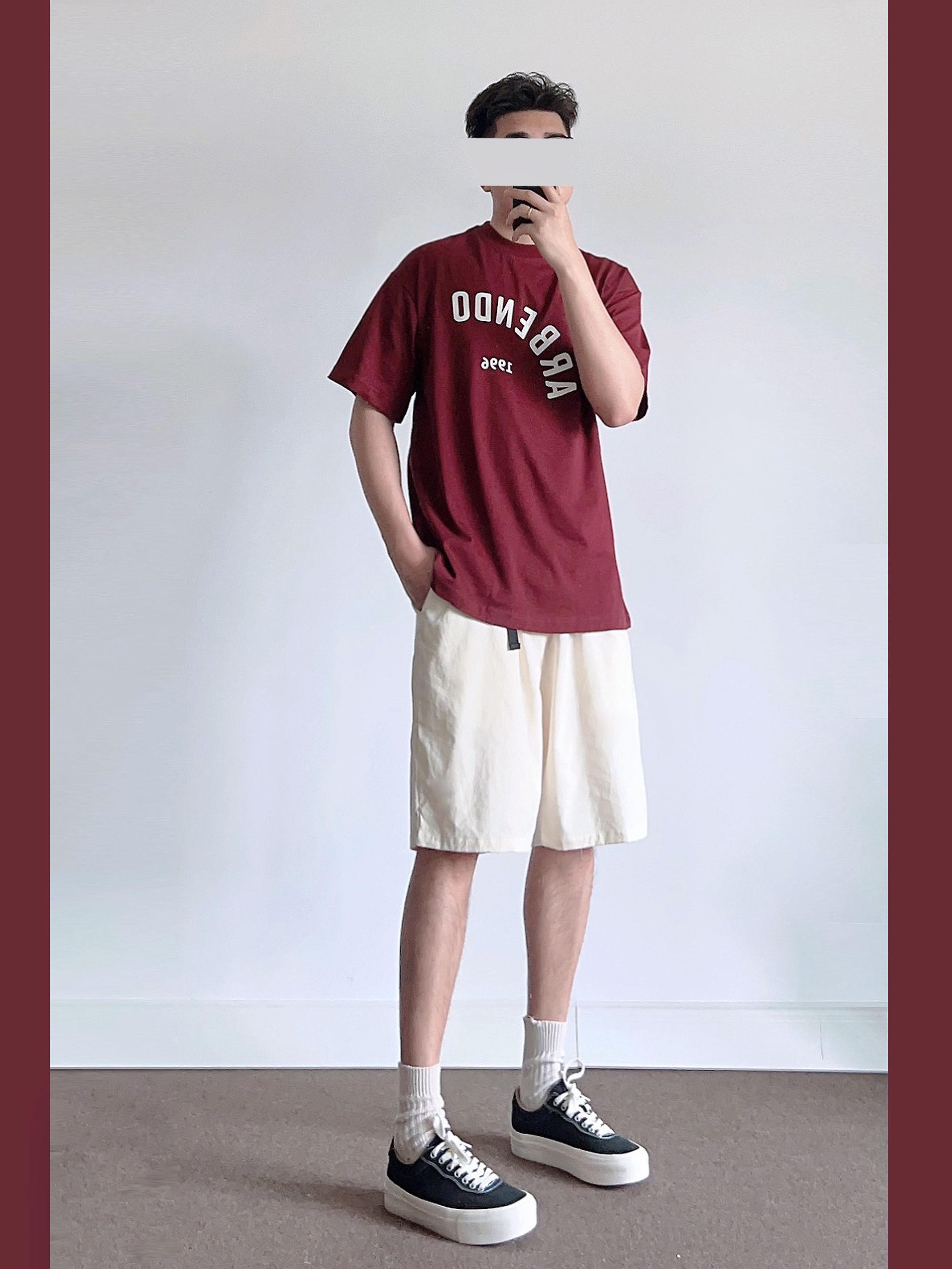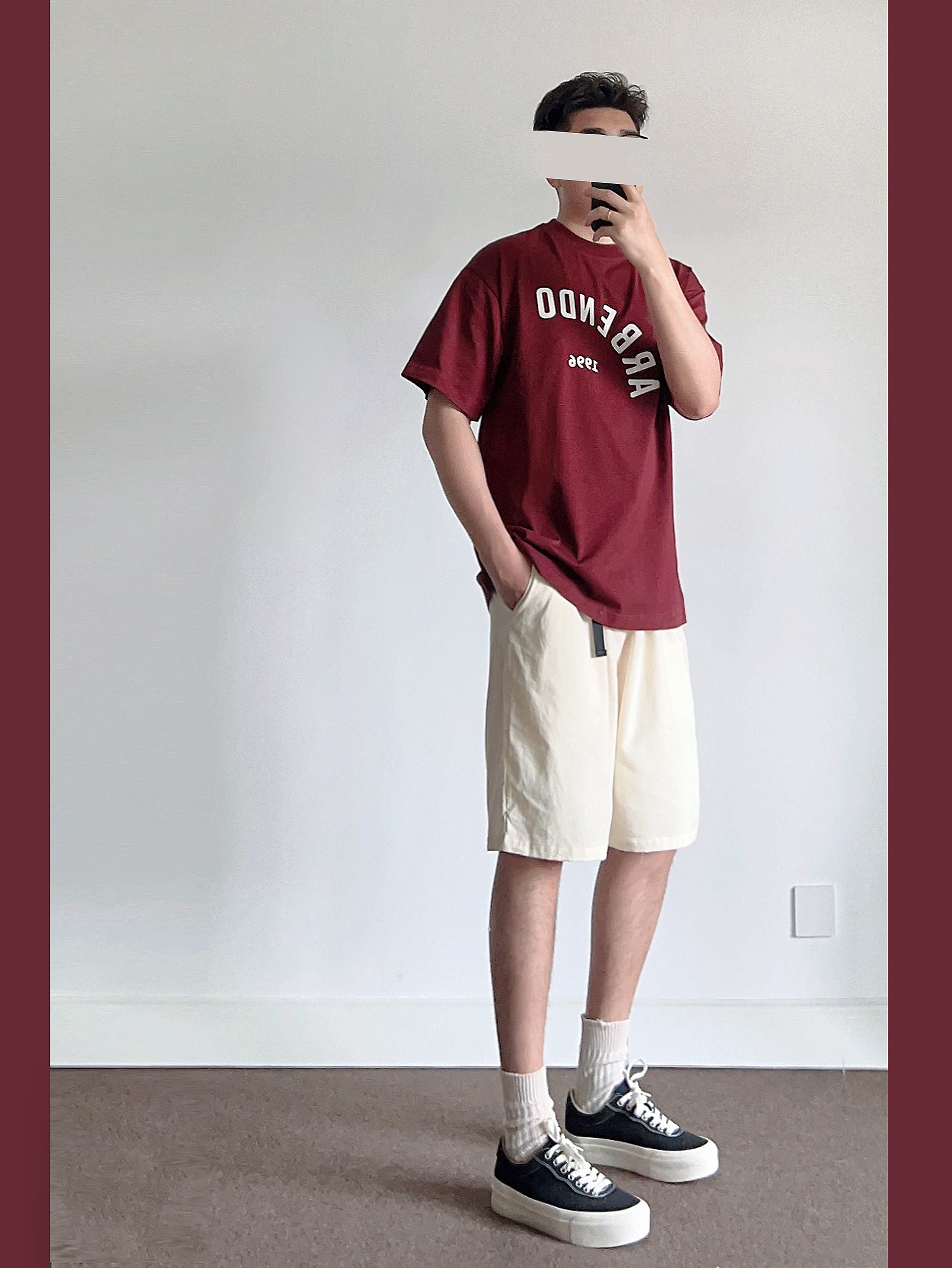 低饱和度红在夏季是bi不可少的颜色👀 酒红色搭配米色🉑️穿出复古高级的氛围感 ➿上身搭配一件字母T恤、简约百搭! 选择袜子米色、与短裤搭配呼应~ 快给男朋友看看!五一出游搭配绝对亮眼吸睛💯 -