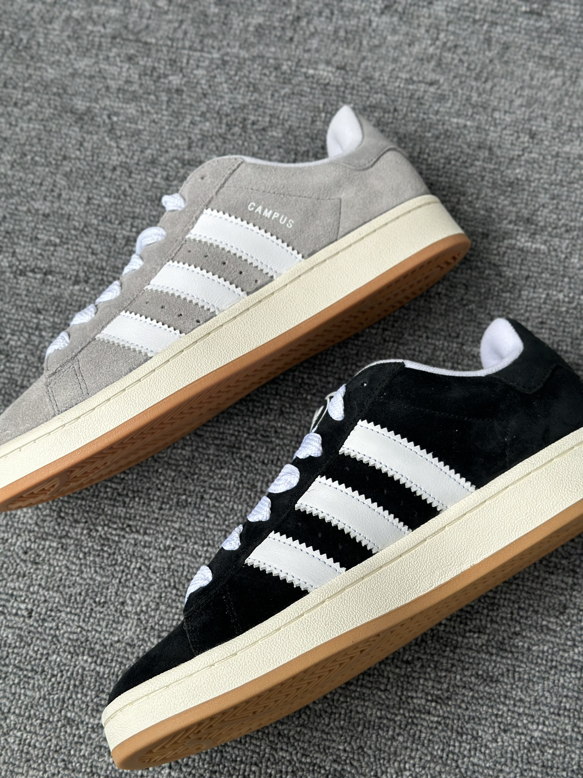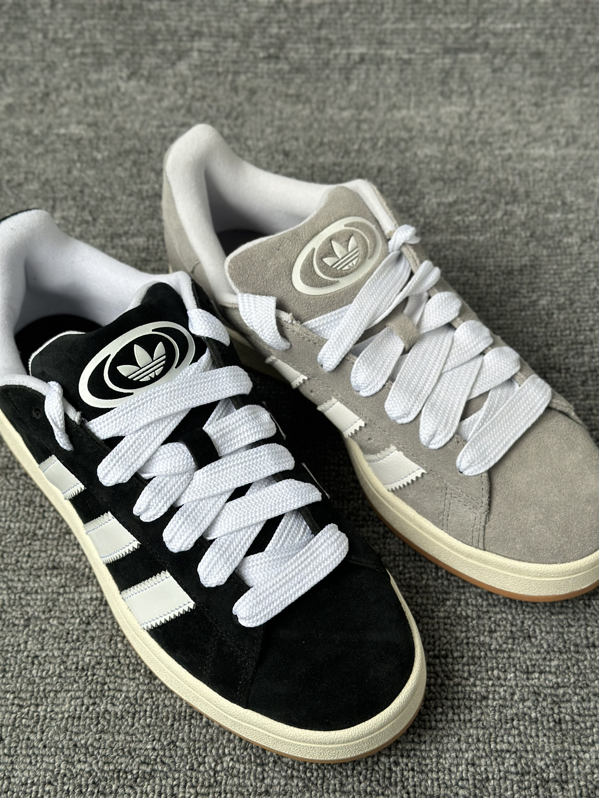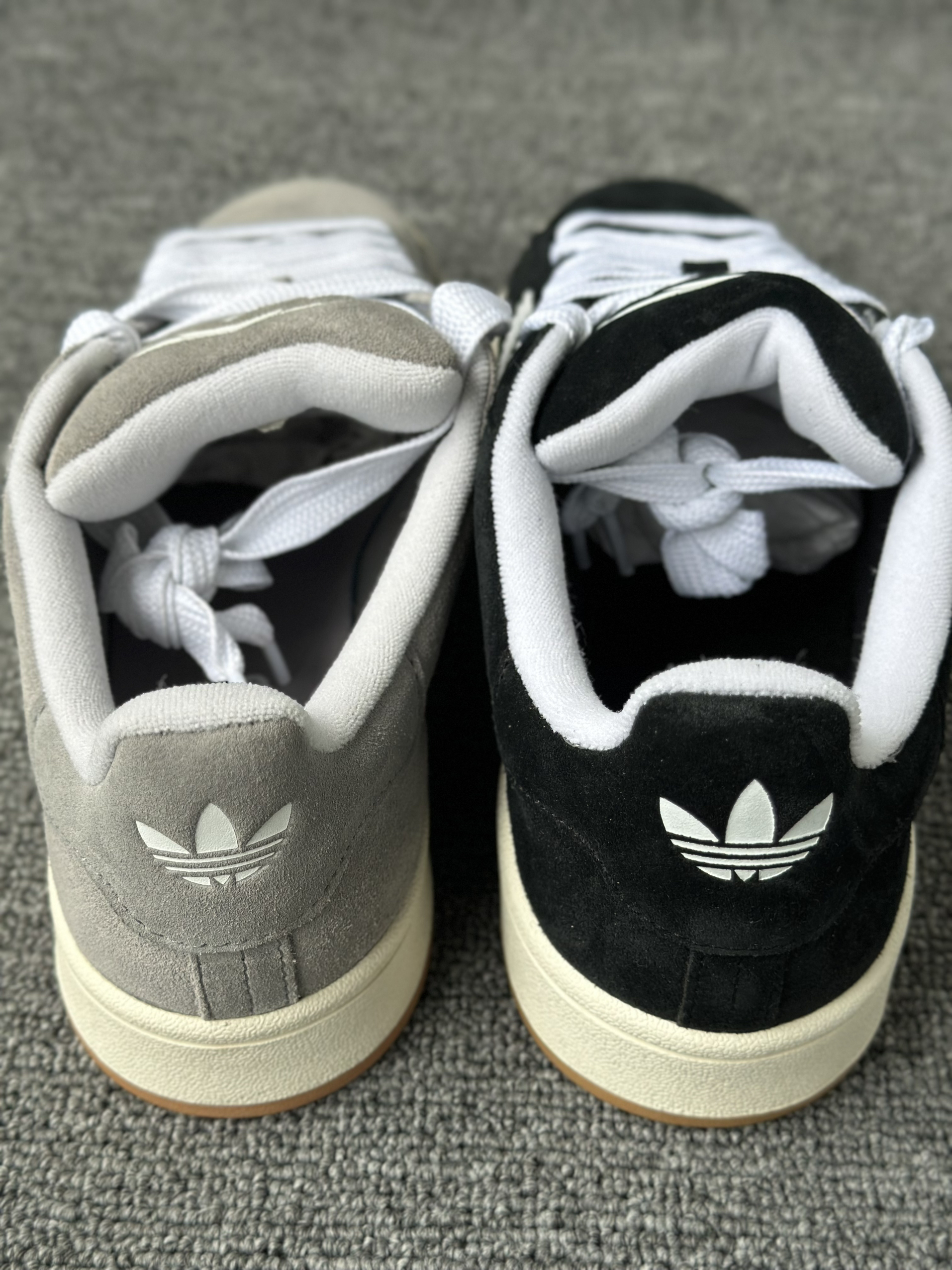 今天给大家分享两双Campus 00s,黑猫灰猫,两双材质都是一样都是翻毛皮,很有质感,我个人是倾向于灰猫的,感觉灰色更加百搭,黑色的话太刻意了感觉,尺码上选择正常码数就可以了。