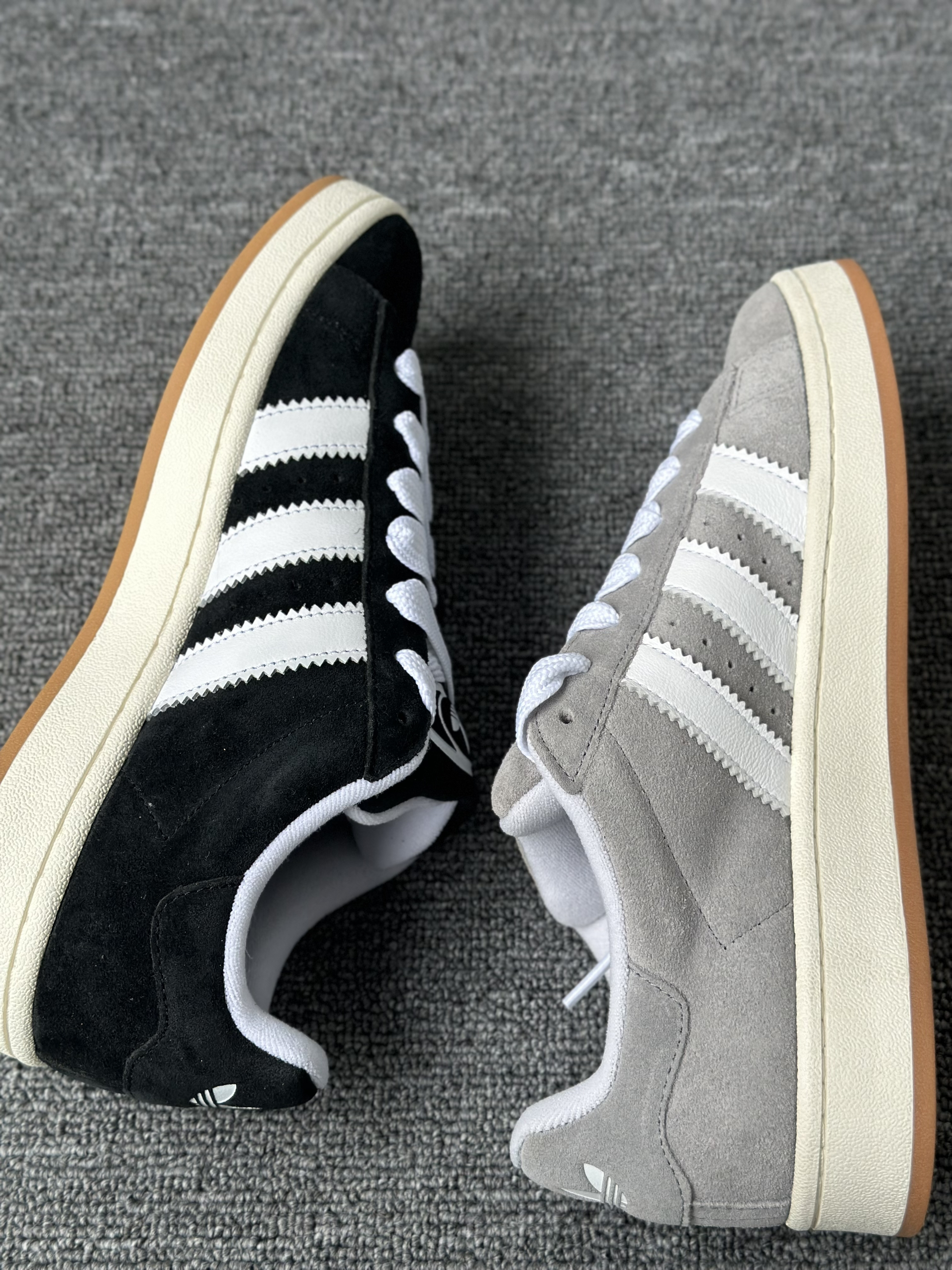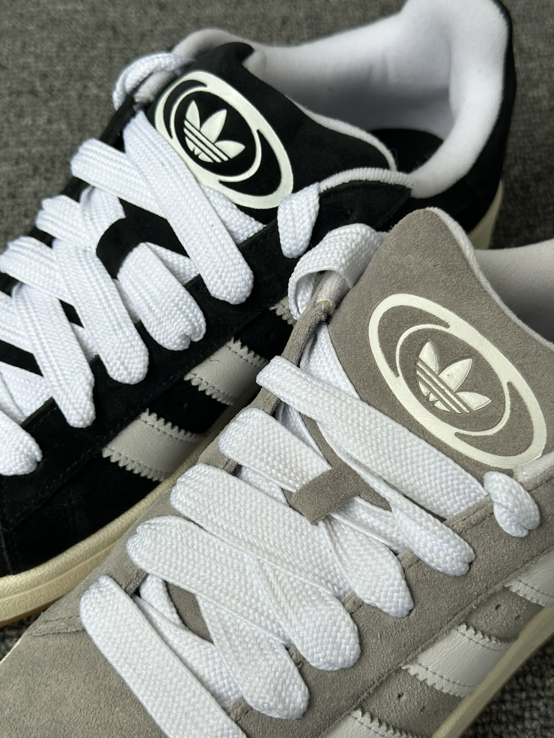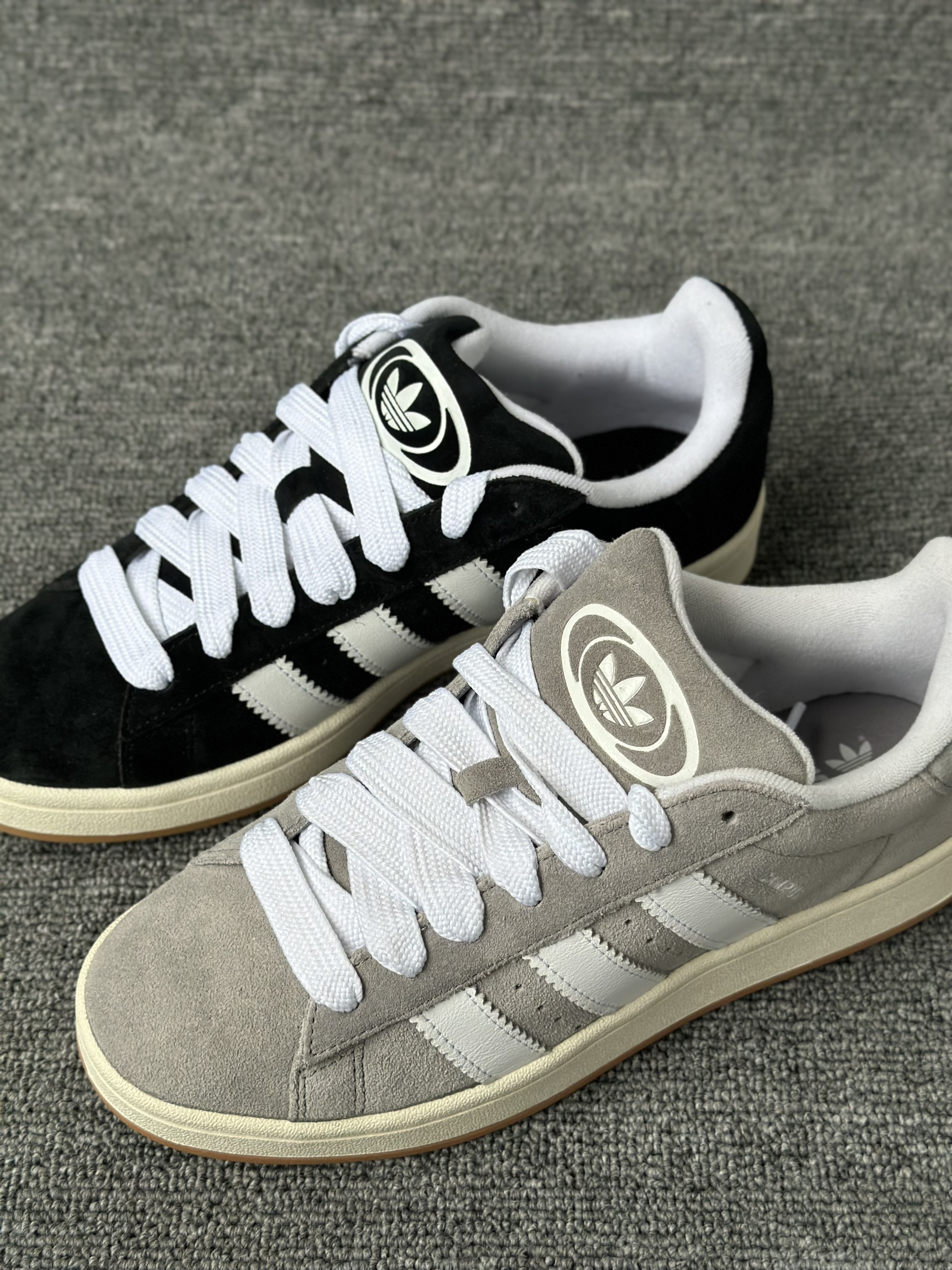 今天给大家分享两双Campus 00s,黑猫灰猫,两双材质都是一样都是翻毛皮,很有质感,我个人是倾向于灰猫的,感觉灰色更加百搭,黑色的话太刻意了感觉,尺码上选择正常码数就可以了。