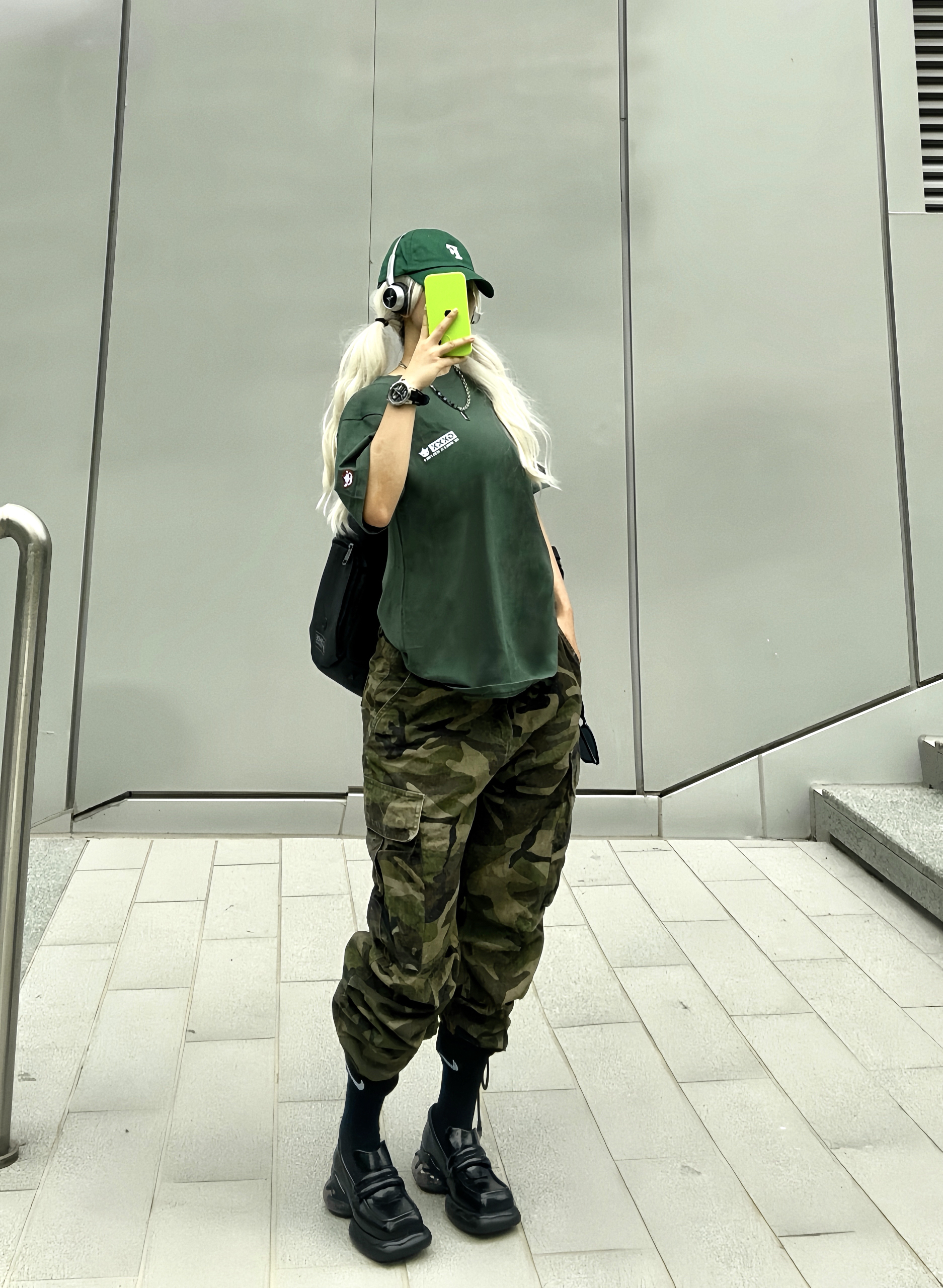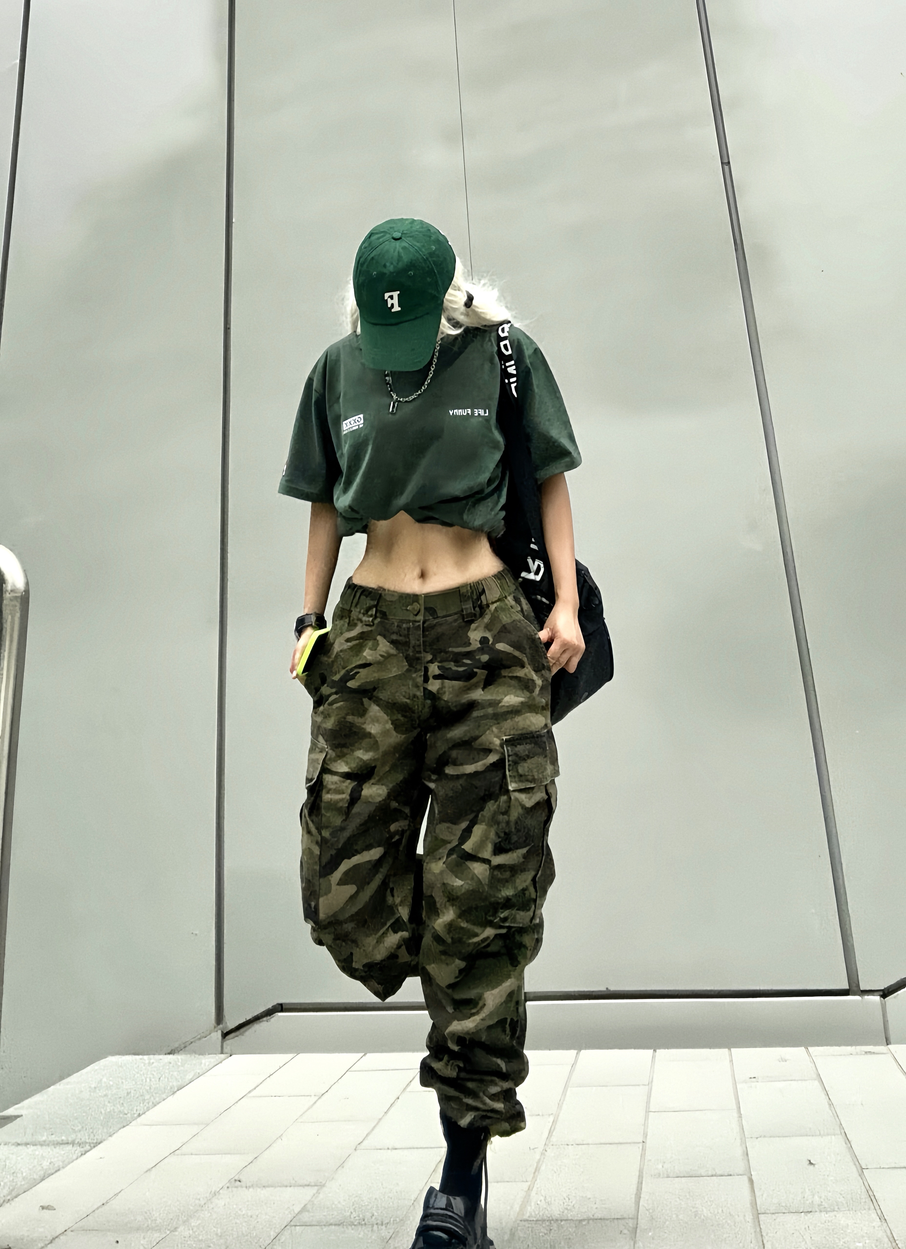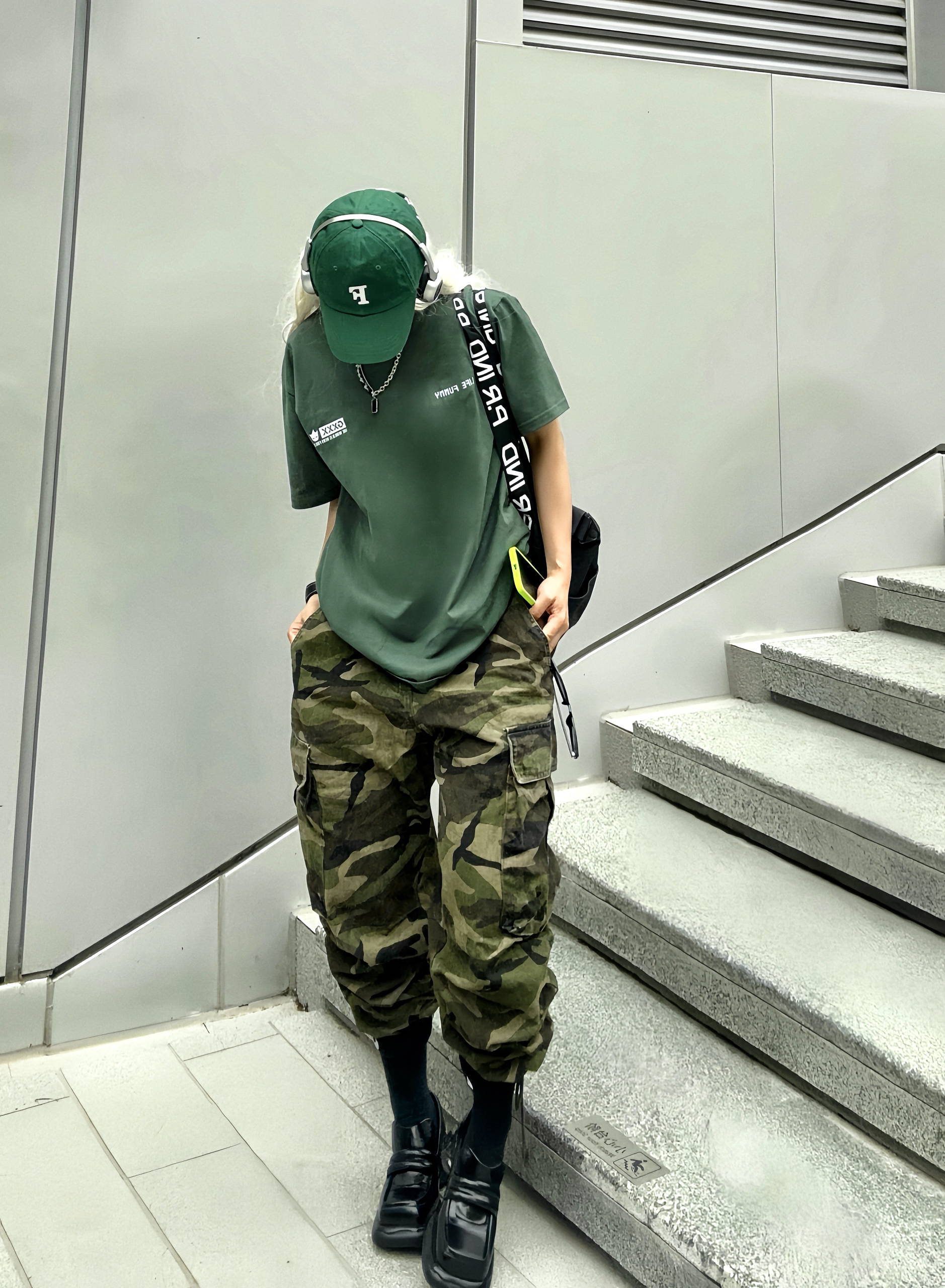 夏天到了 穿短袖t到户外才是最舒服的 绿色和夏天 真的好搭! 这次分享一套可甜可酷的绿色系穿搭 上半身搭配墨绿色短袖T恤 有一说一,这颜色真的好显肤白~ 而且背后有超大片印花也是蛮吸睛诶👀 特地选大了一个码, 堆叠感街头气息拉满. 下半身搭配迷彩工装裤 深浅不一的绿色上下呼应 脚上则选了一双甜甜的方头厚底鞋 让一身硬朗的造型增添了一丝甜味~ 一身搭配下来干净清爽 这样穿去草地露营或者炸街都好合适...