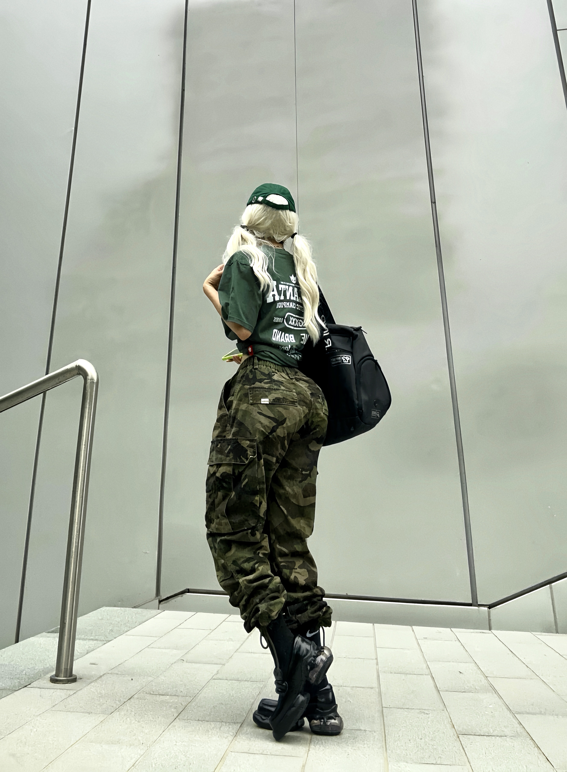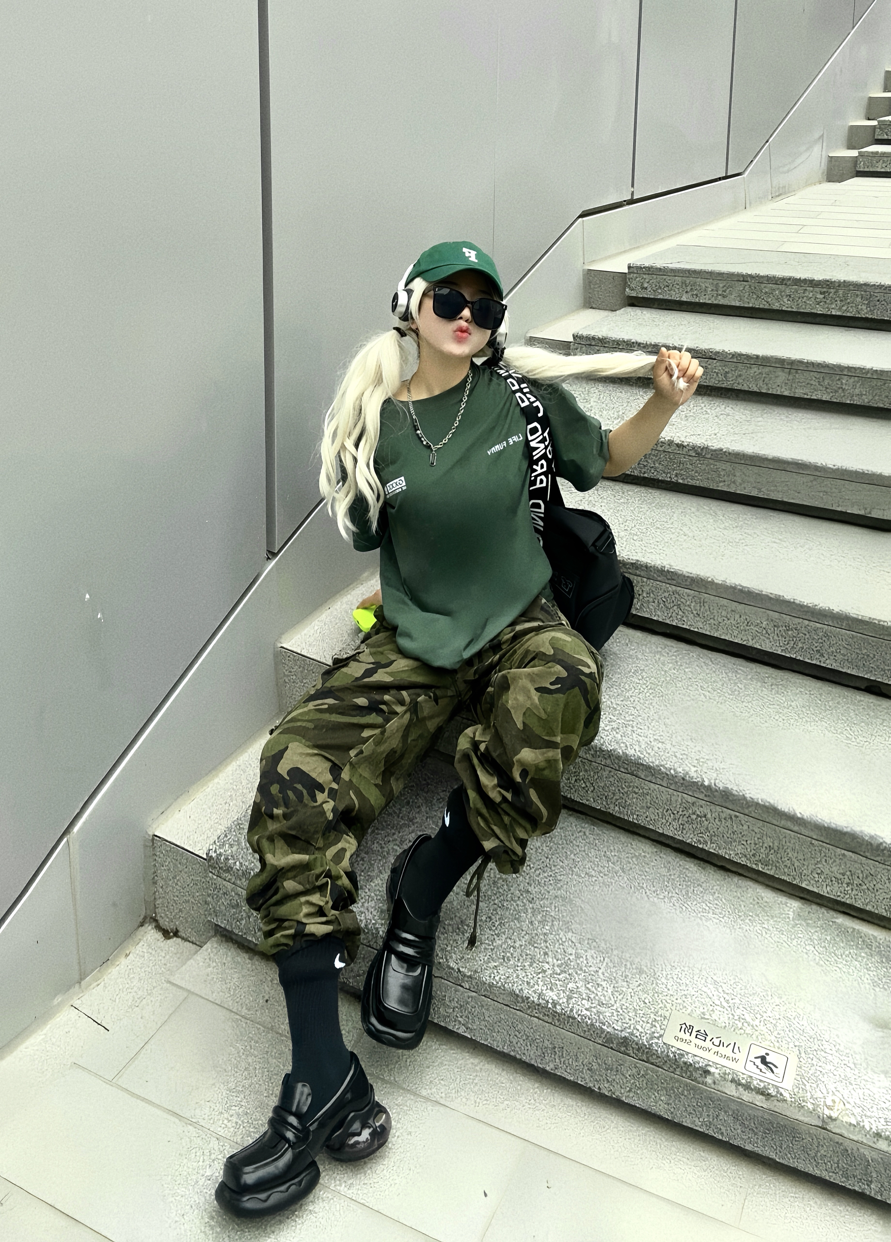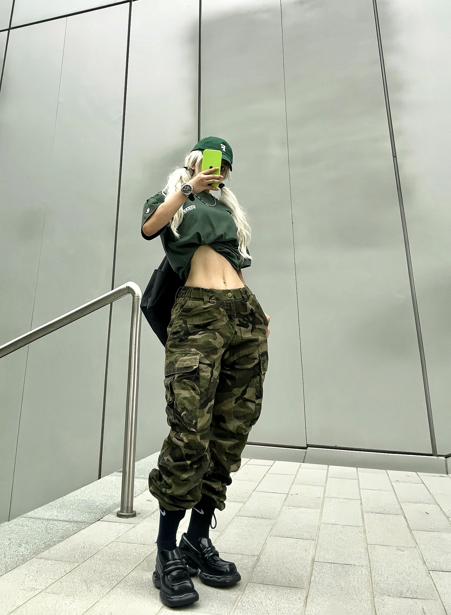 夏天到了 穿短袖t到户外才是最舒服的 绿色和夏天 真的好搭! 这次分享一套可甜可酷的绿色系穿搭 上半身搭配墨绿色短袖T恤 有一说一,这颜色真的好显肤白~ 而且背后有超大片印花也是蛮吸睛诶👀 特地选大了一个码, 堆叠感街头气息拉满. 下半身搭配迷彩工装裤 深浅不一的绿色上下呼应 脚上则选了一双甜甜的方头厚底鞋 让一身硬朗的造型增添了一丝甜味~ 一身搭配下来干净清爽 这样穿去草地露营或者炸街都好合适...