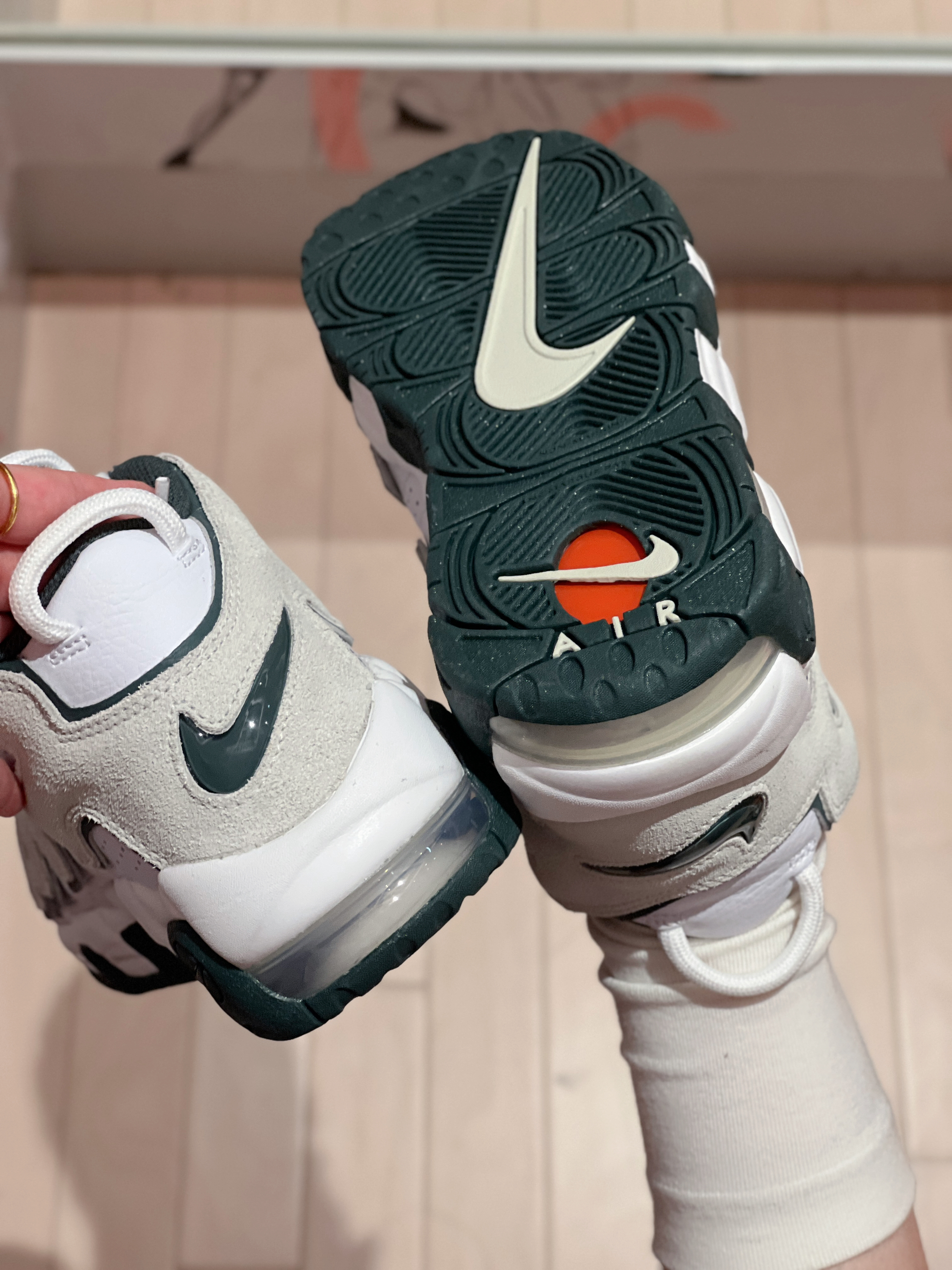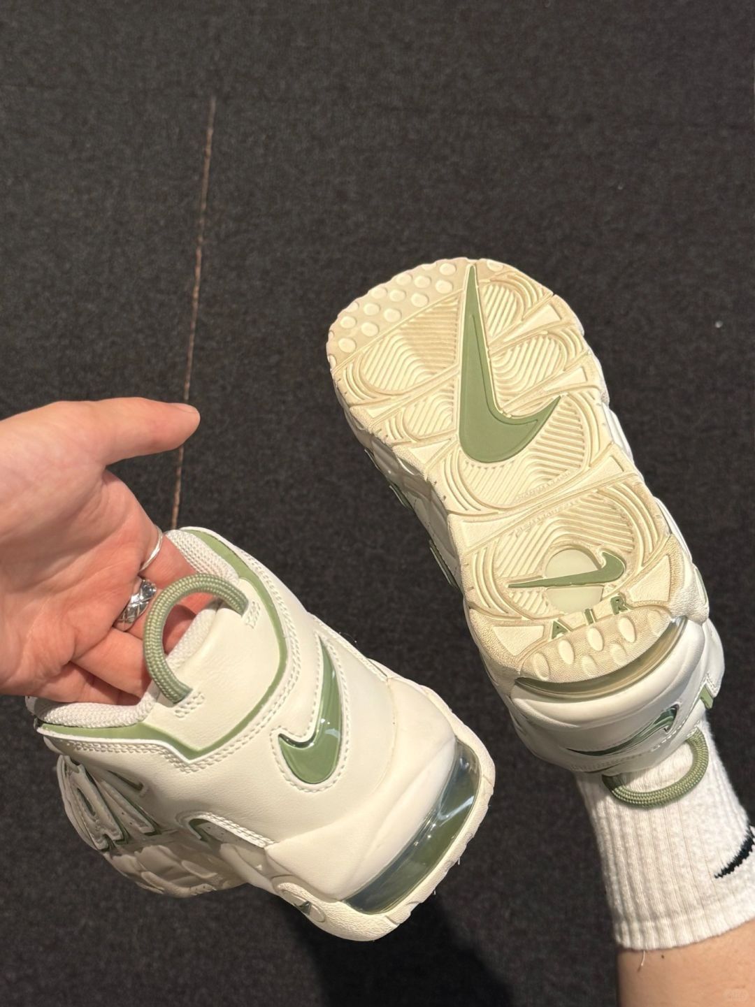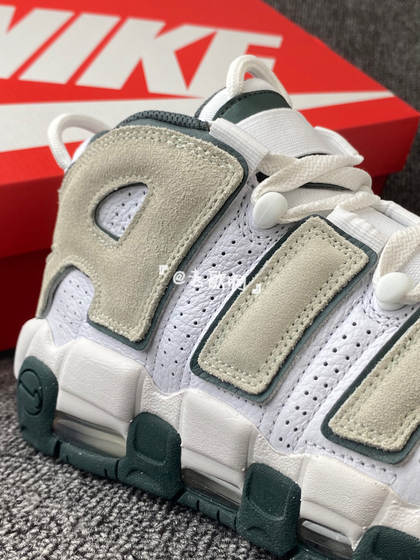 👟Nike Air More Uptempo '96 ✨当初的皮蓬真的是我的大爱!这次新配色也同样很吸引我,鞋子整体以白色为主,灰色和绿色搭配,很小清新也很有活力感。 🌸鞋面部分是皮革➕麂皮材质拼接的,复古感拉满!平常也很好打理。定位虽然是篮球鞋,不过感觉鞋子有点重,更适合日常穿着去搭配! 💫尺码方面我是按平常穿的选择的,刚刚好~