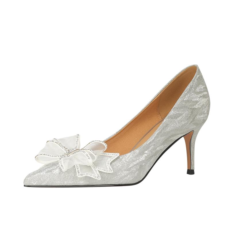 hello 各位美女们草莓今天分享一下自己入手的第一双 这双上脚blingbling 细闪真的超级好看灯光的照射下很闪耀 上面的蝴蝶结术超级温柔六厘米的高度正好上脚也不会累脚 走路超级稳 搭配各种裙子简直不要太出片 像我这种搭配大裙摆公主裙再穿上这双高跟鞋简直就是公主本人啦 小仙女们想选择还在犹豫的这双真的是入门级首选 鞋码也是正码脚宽的宝宝要稍微选大一码