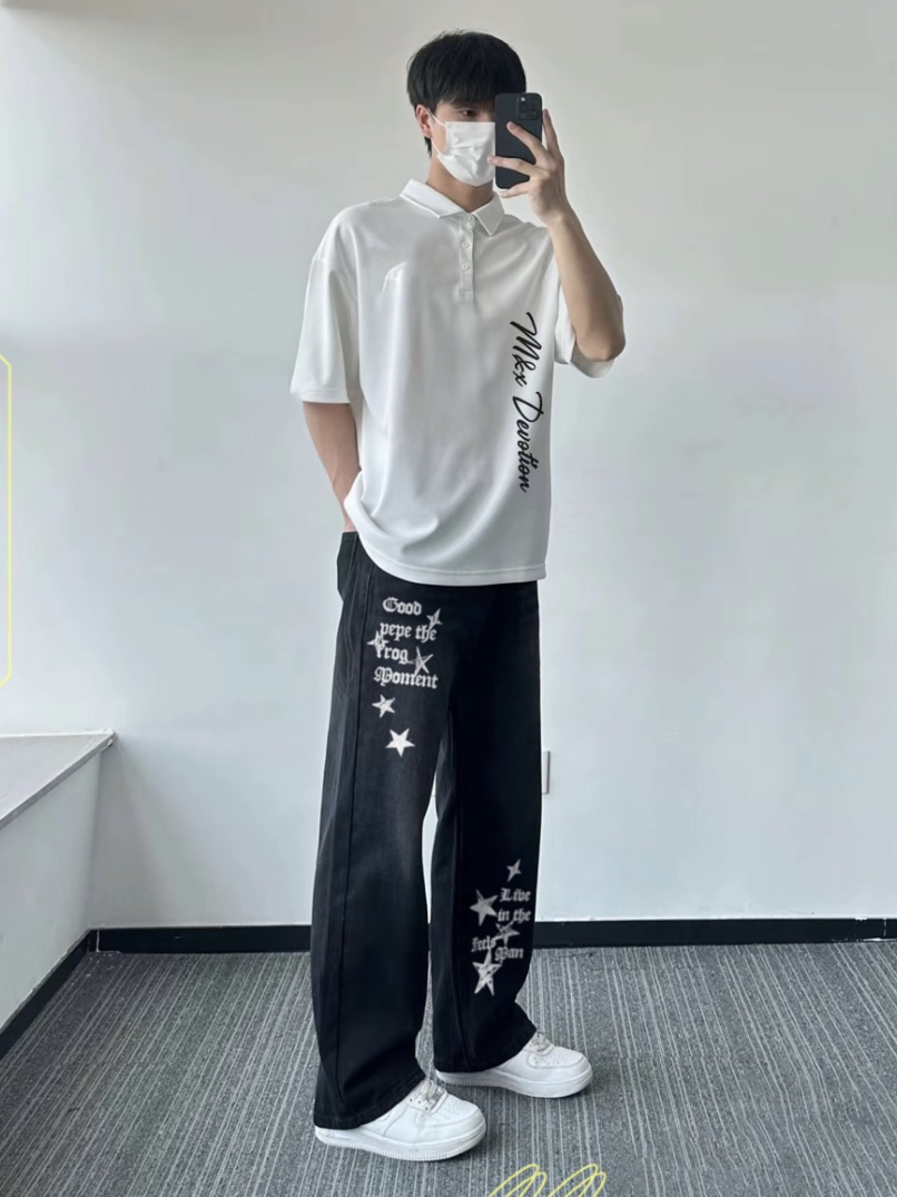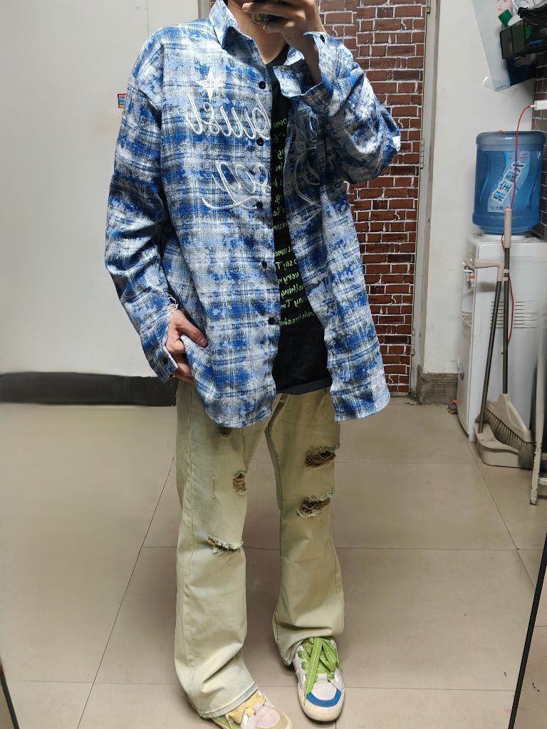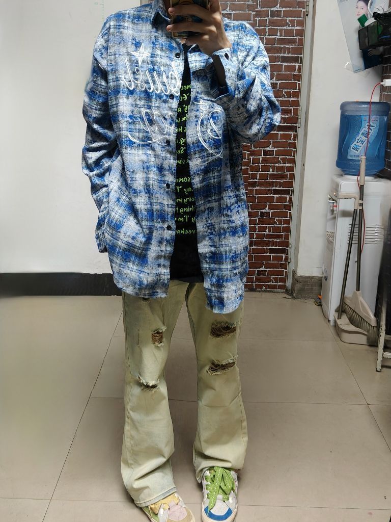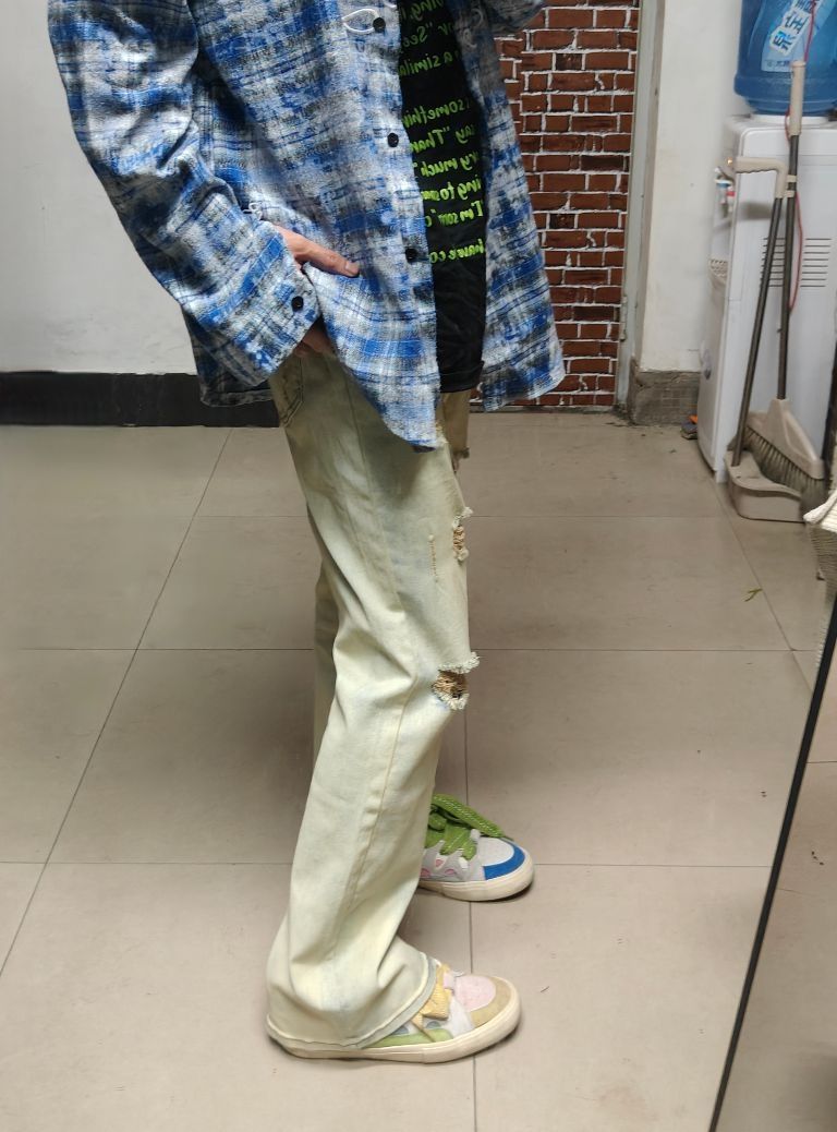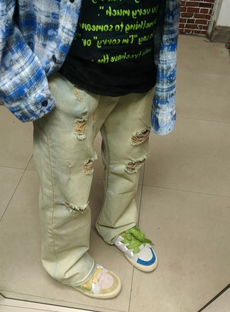 上身是黑绿色字母t➕浅蓝色牛仔外套 鞋子是鸳鸯配色低帮板鞋 再搭上这款美式破洞牛仔 真的很喜欢 这款牛仔版型不错,颜值可以,且有破洞的设计,夏天穿太适合不过了